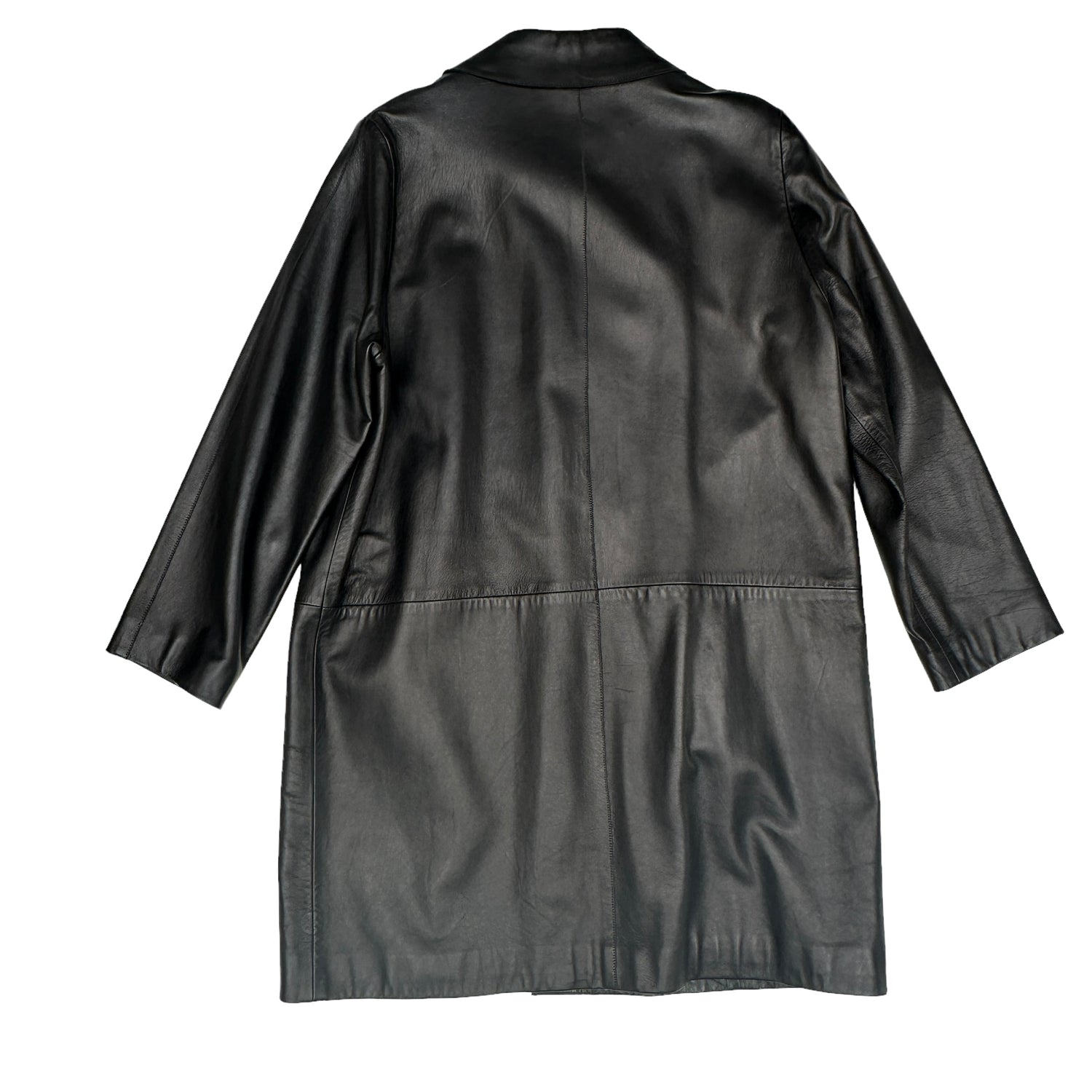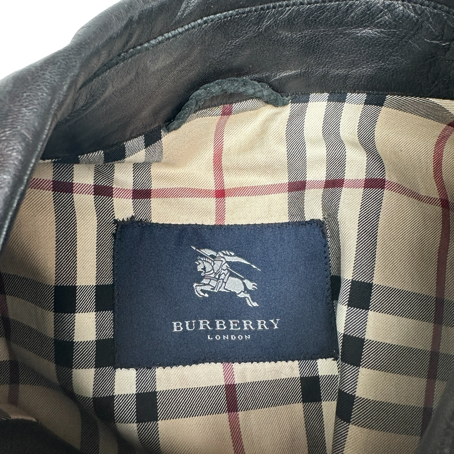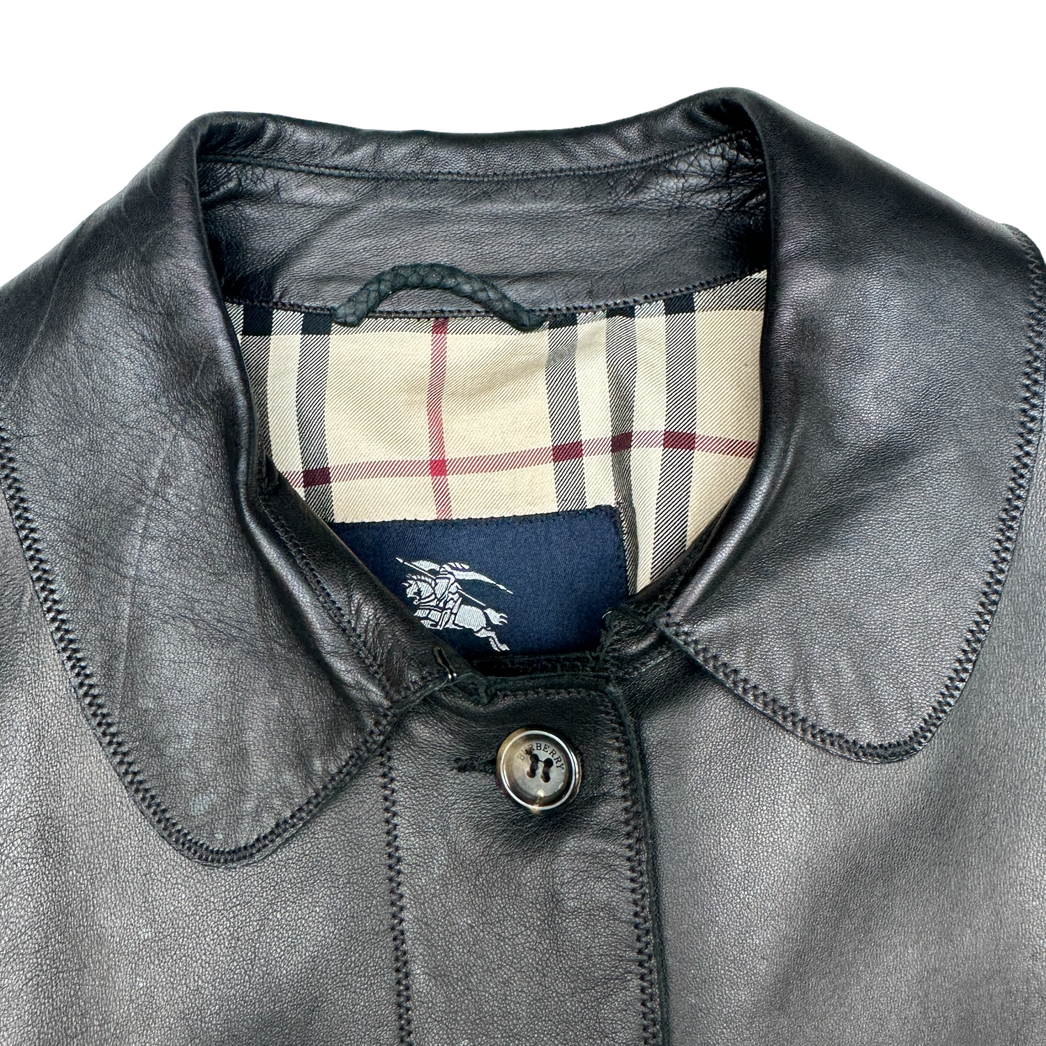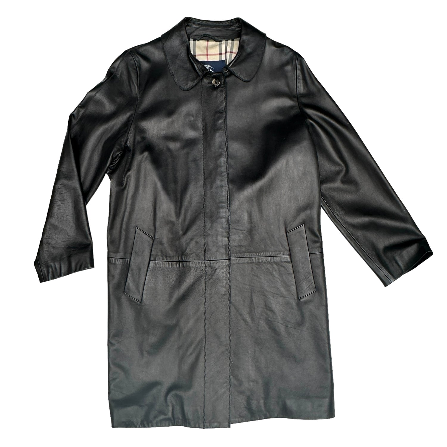 Burberry black leather coat. Round collar. Buttery soft leather. Lightweight long coat. Iconic checker Burberry print lining. Designer size (US 10 - FR 42).
