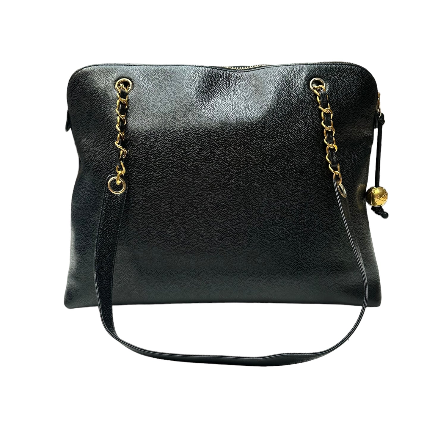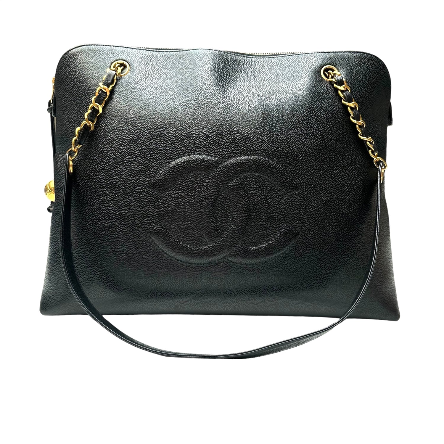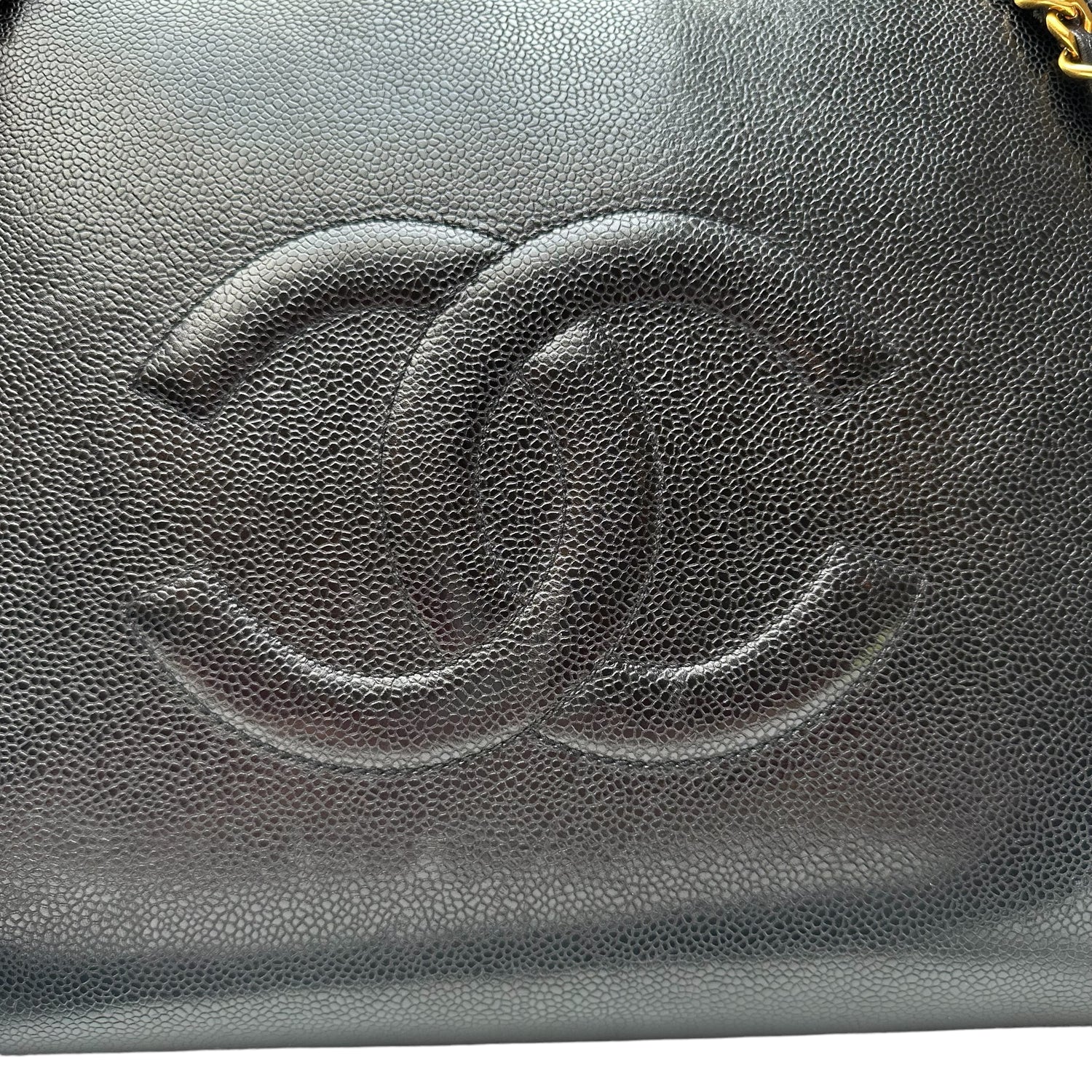 Chanel vintage XL tote. Black caviar leather. Gold-tone hardware. Zipper closure at top. Double flat handles with chain iconic chain strap details. Maxi CC logo balls. Double interior zipper pockets at sides. Leather lined.