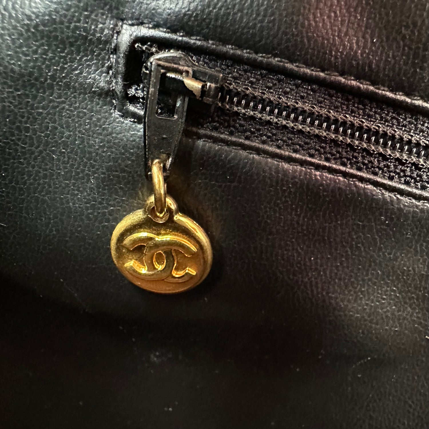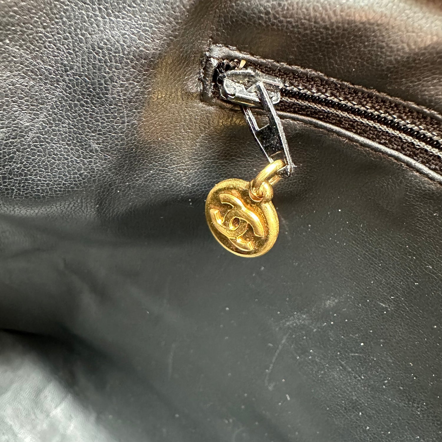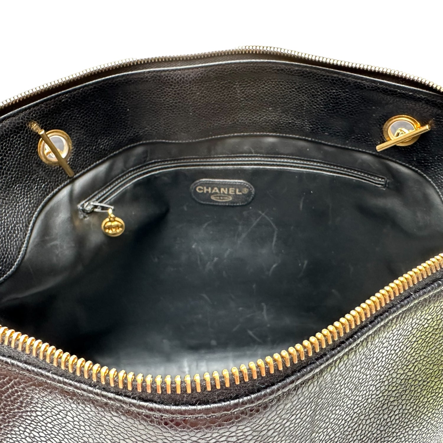 Chanel vintage XL tote. Black caviar leather. Gold-tone hardware. Zipper closure at top. Double flat handles with chain iconic chain strap details. Maxi CC logo balls. Double interior zipper pockets at sides. Leather lined.