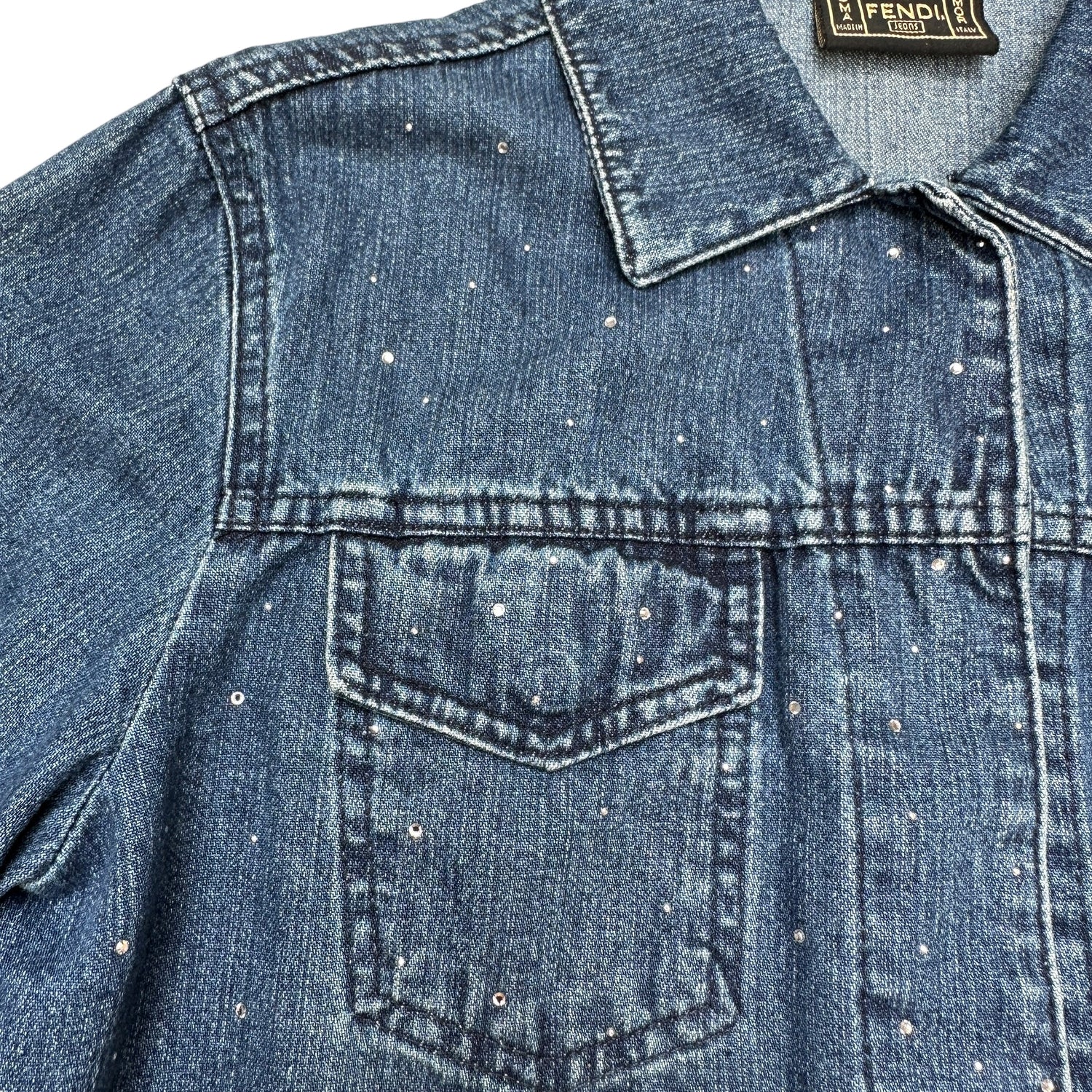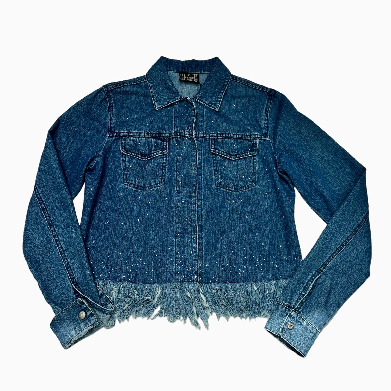 Fendi vintage jeans denim jacket. From the 1990's Collection by Karl Lagerfeld. Raw bottom hem with fringes. Crystal embellishments throughout. Distressed blue denim accents. Pointed collar. Two patch pockets. Snap closure at front. Designer size 42.