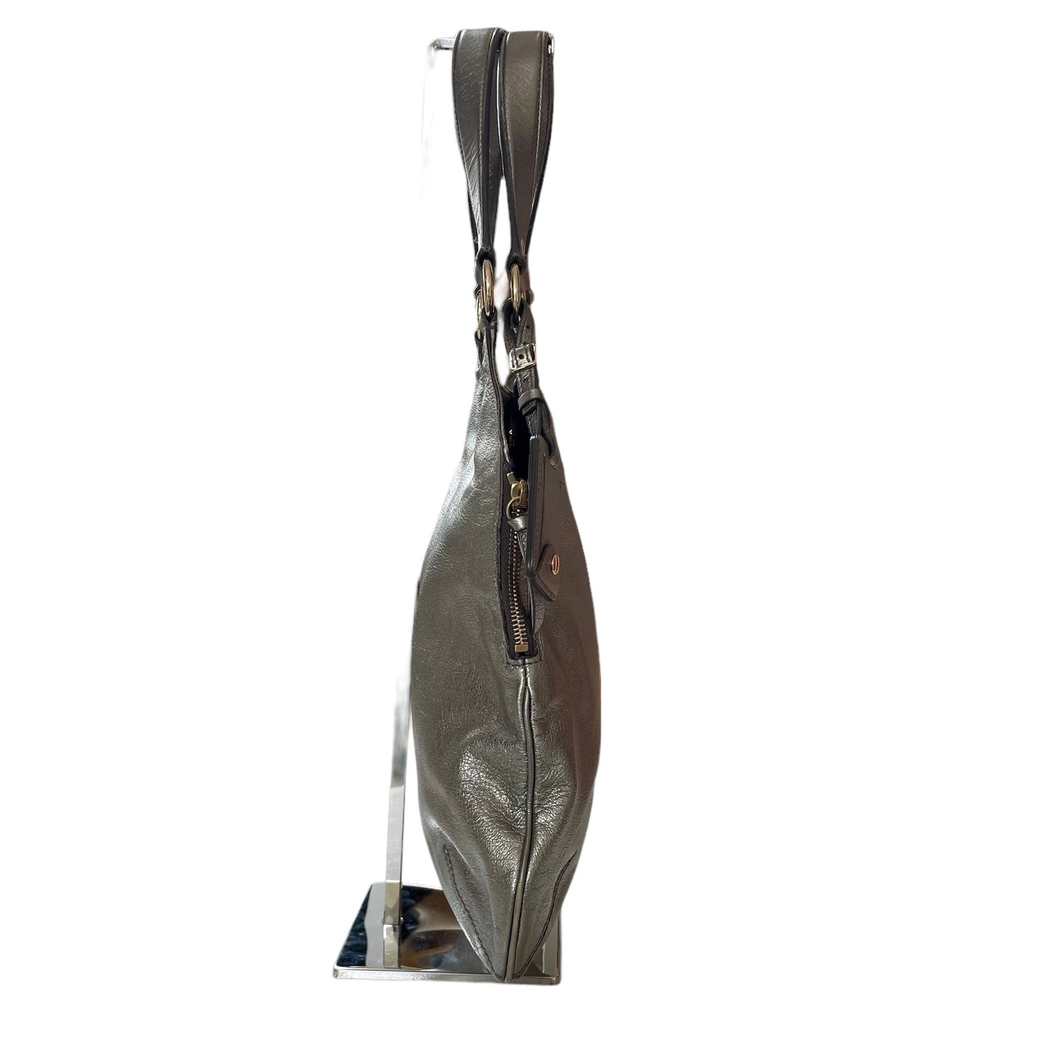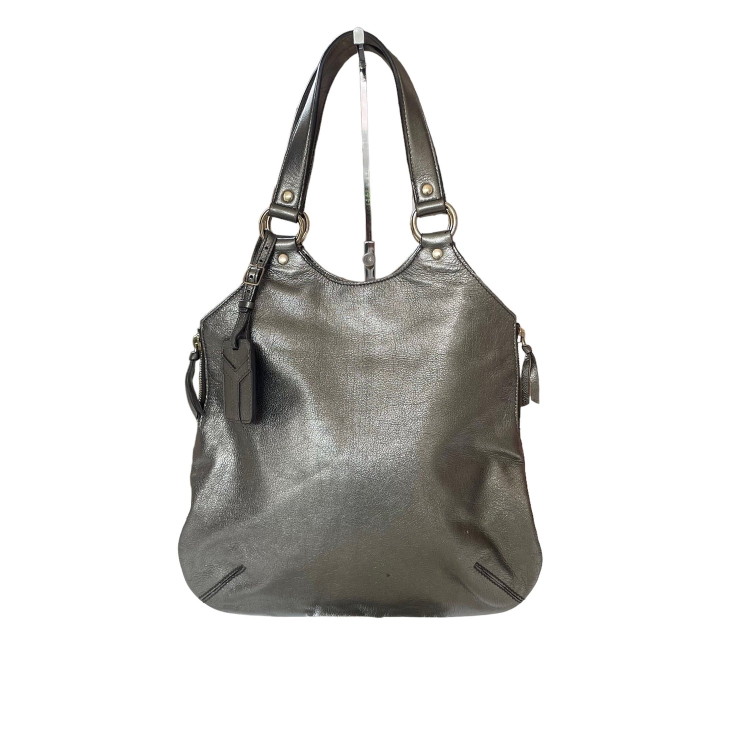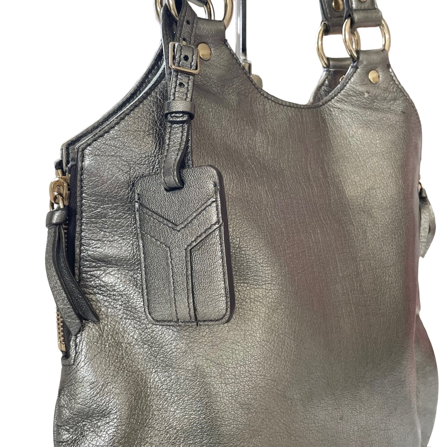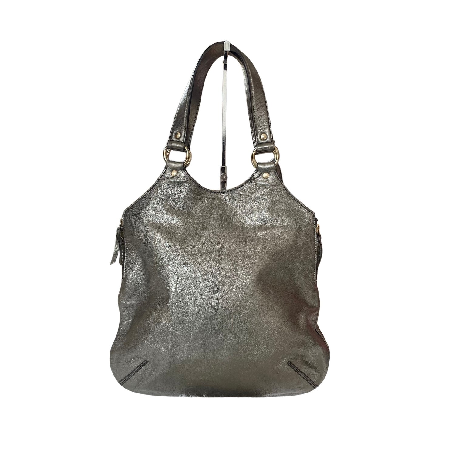 Yves Saint Laurent tote. Soft bronze leather. Zipper details at side. YSL logo tag. Leather lined. Magnetic closure at top. One zipper closure at interior.