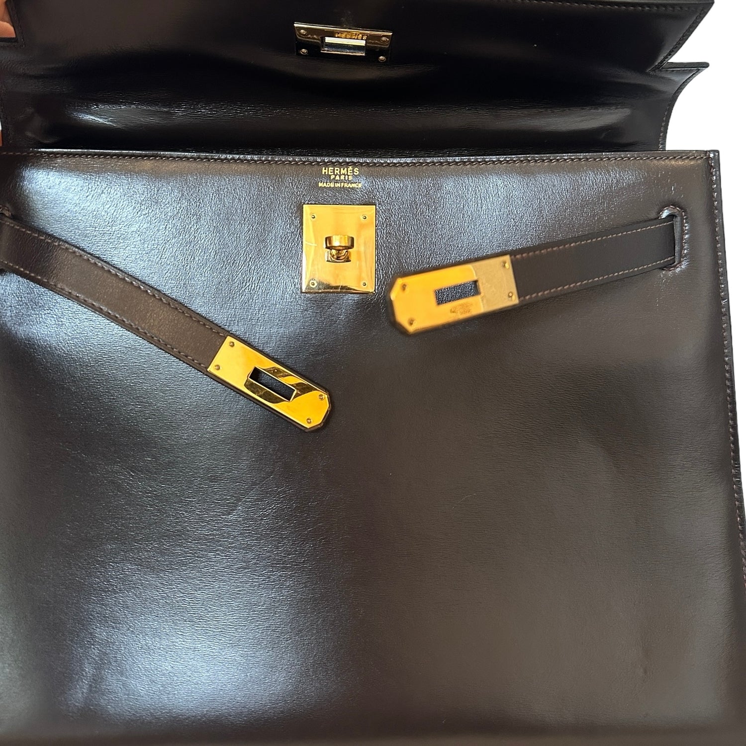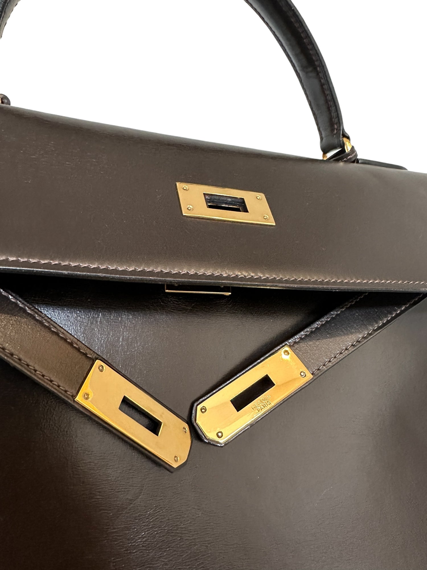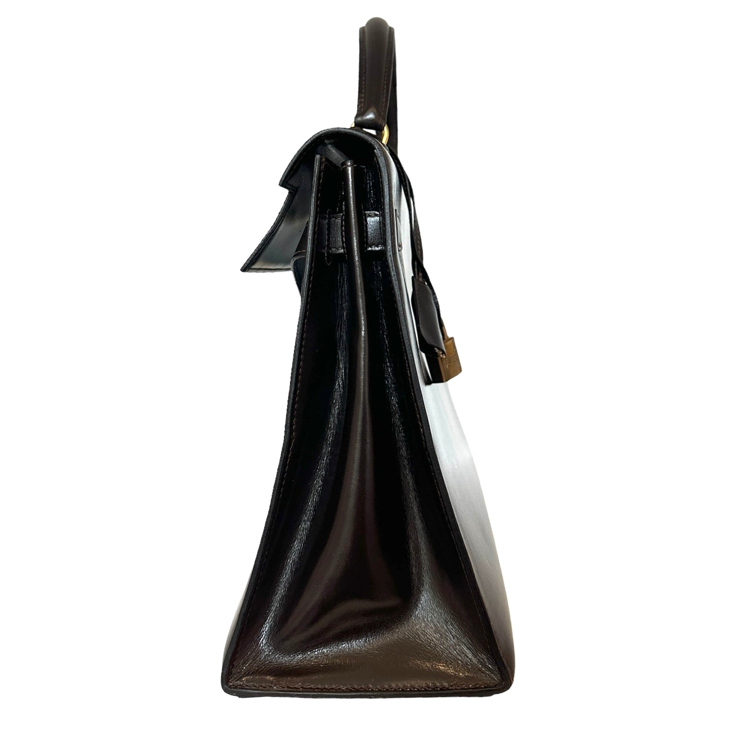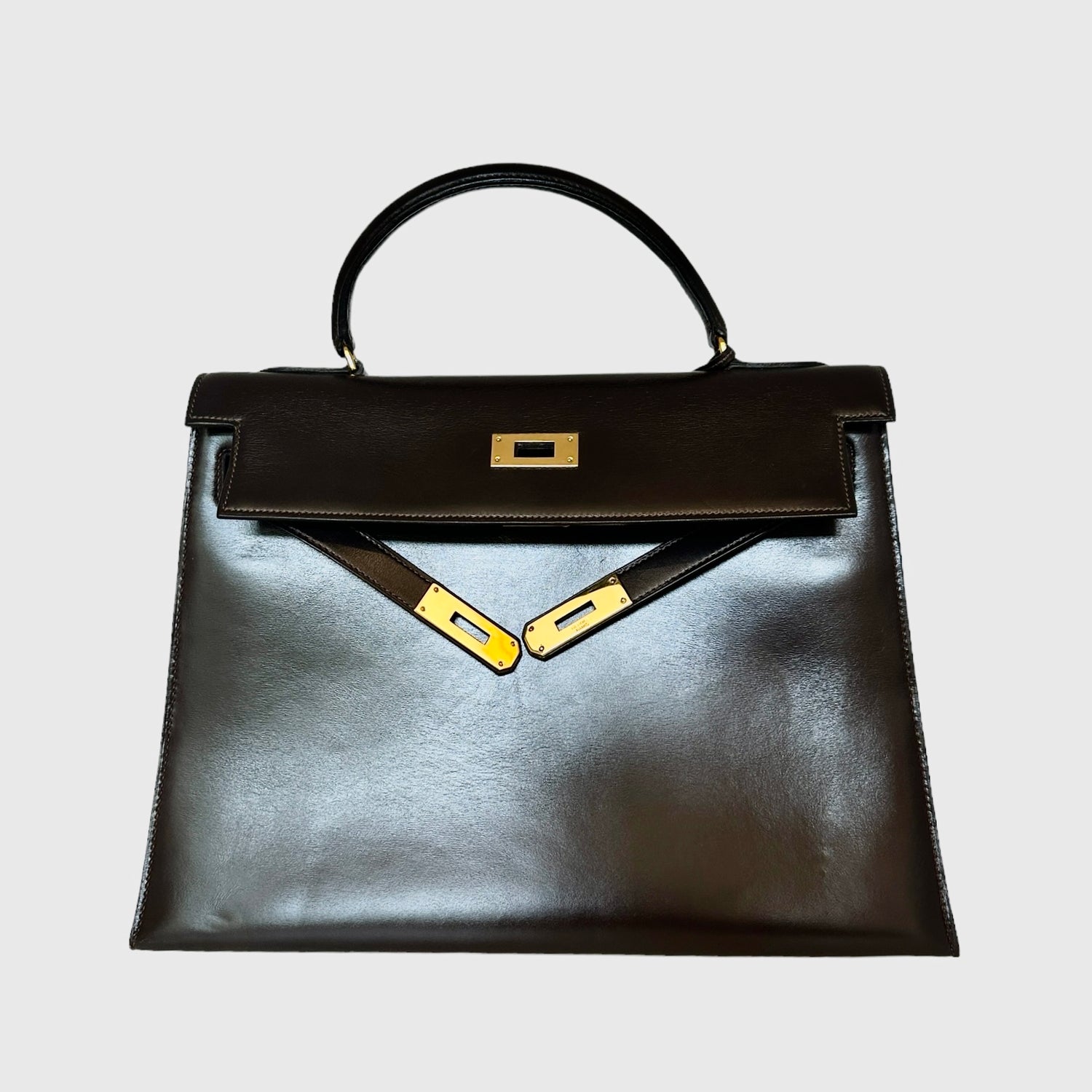 Hermes vintage Kelly bag. Size 32. Chocolate brown box leather. Gold plated hardware. 1976 (F circle stamp).