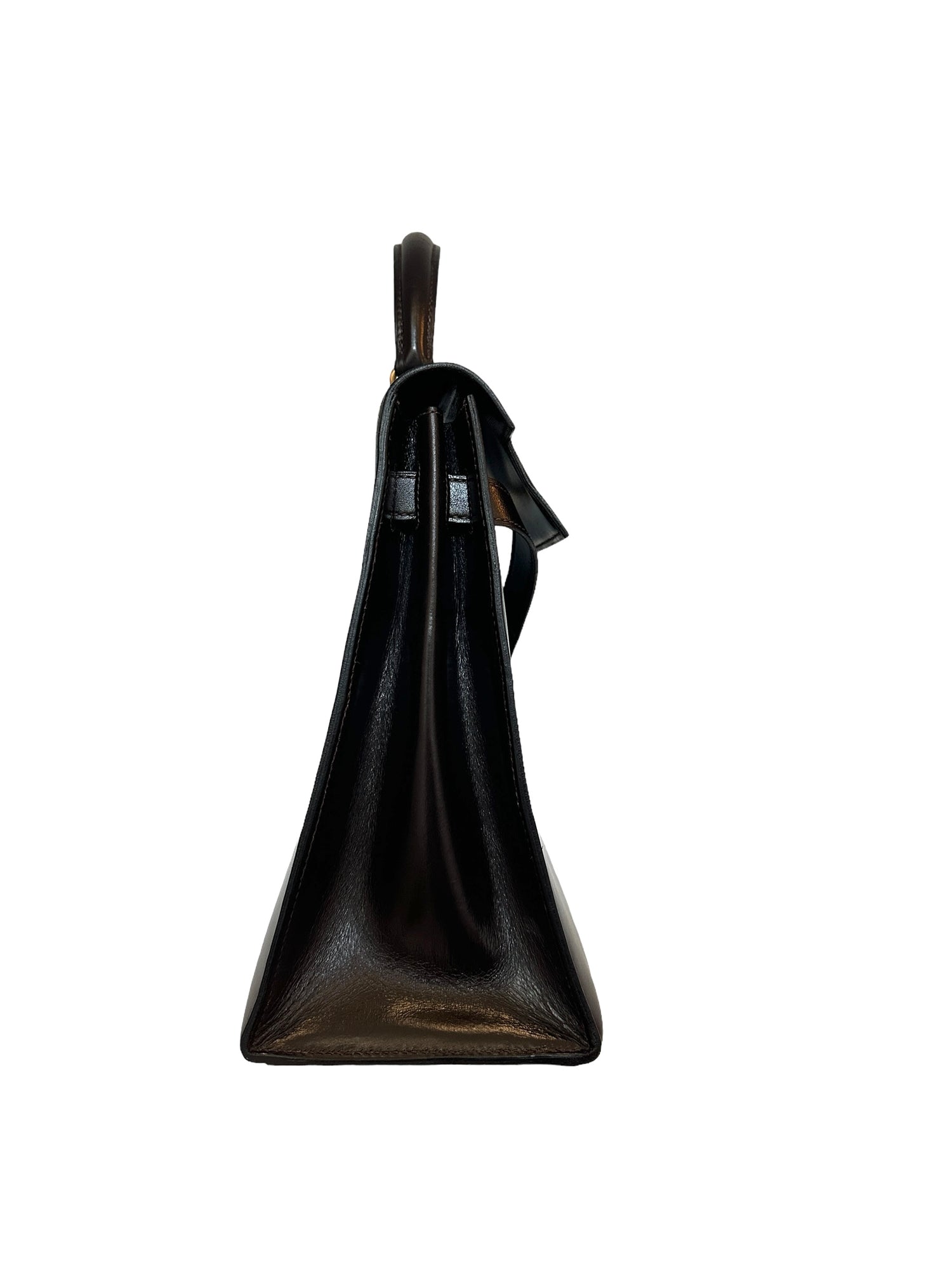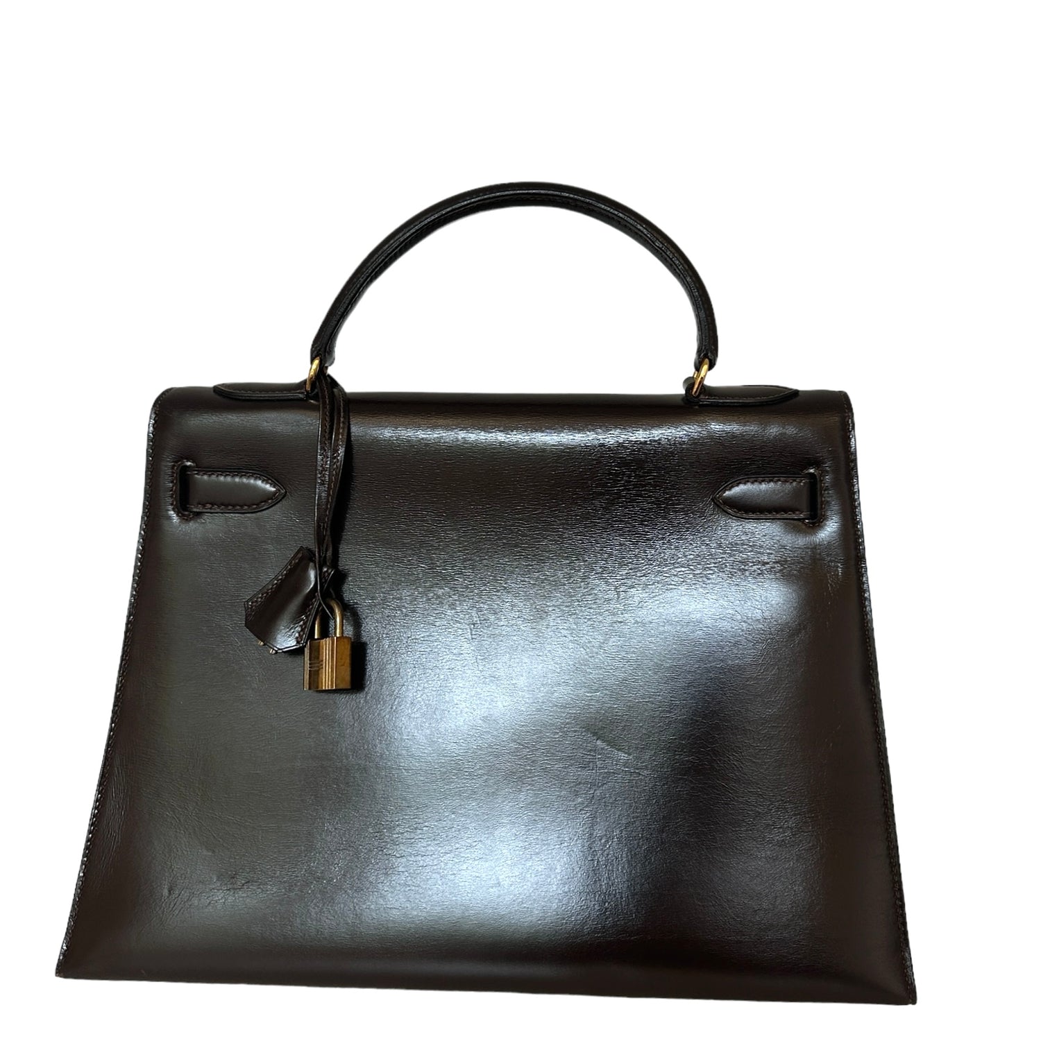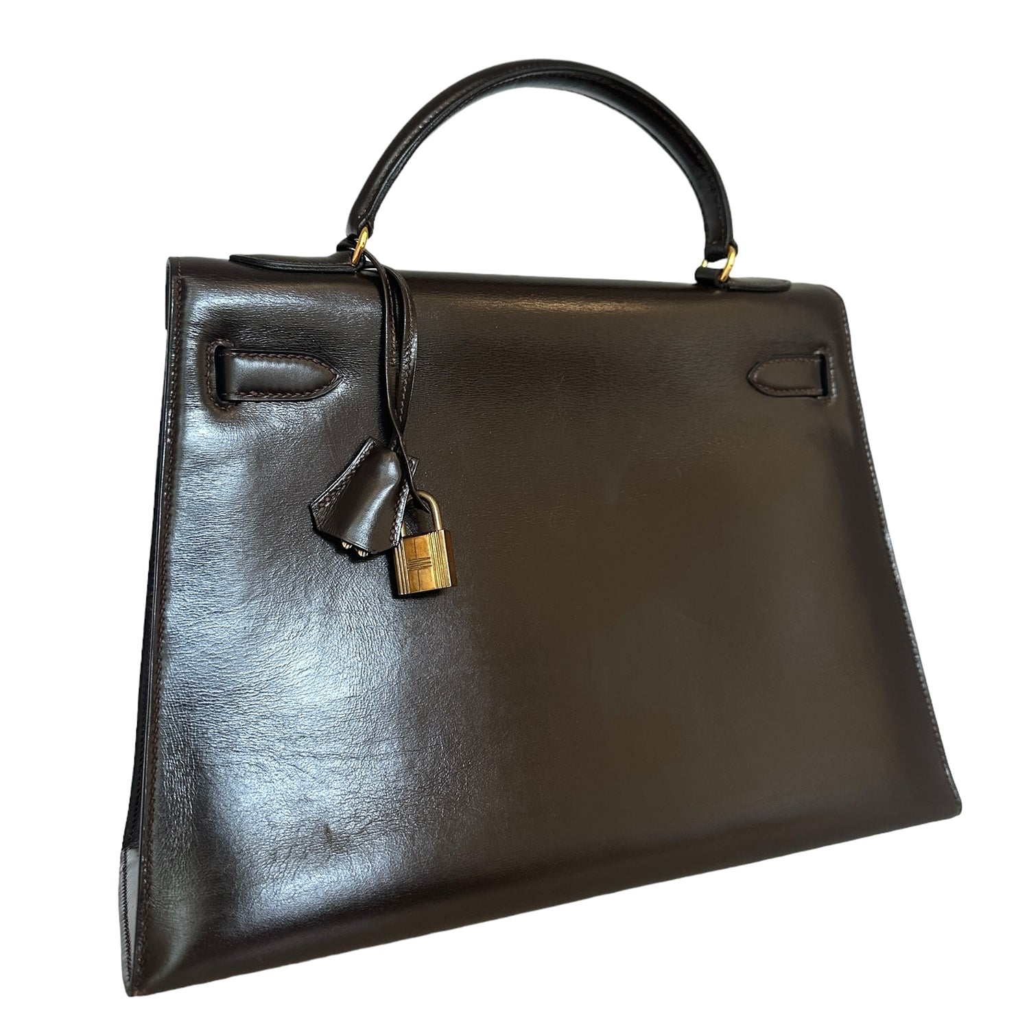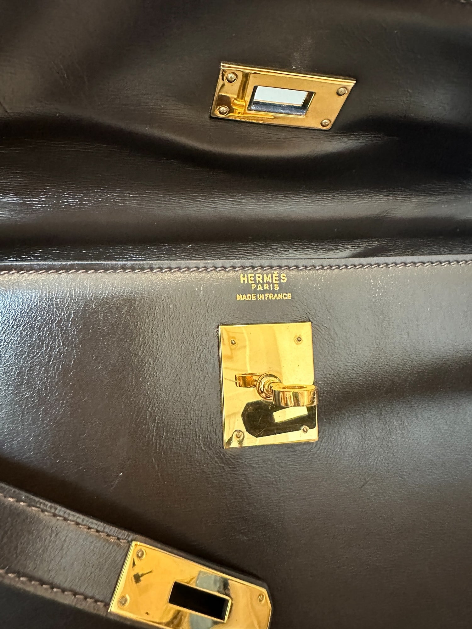 Hermes vintage Kelly bag. Size 32. Chocolate brown box leather. Gold plated hardware. 1976 (F circle stamp).