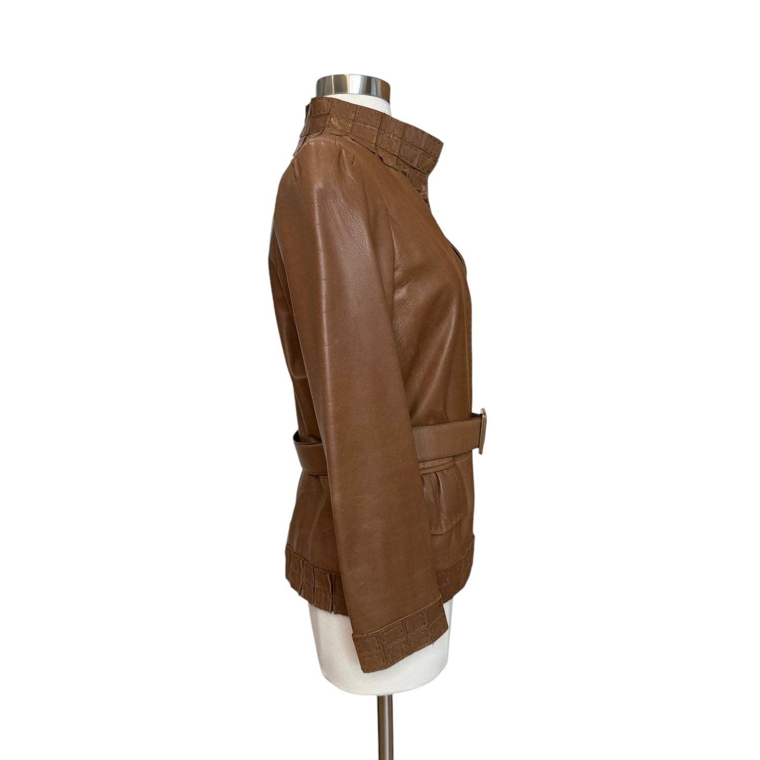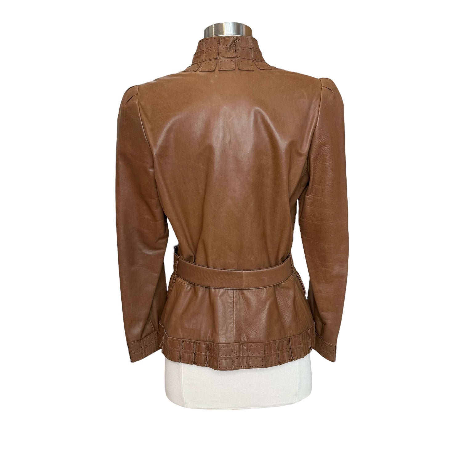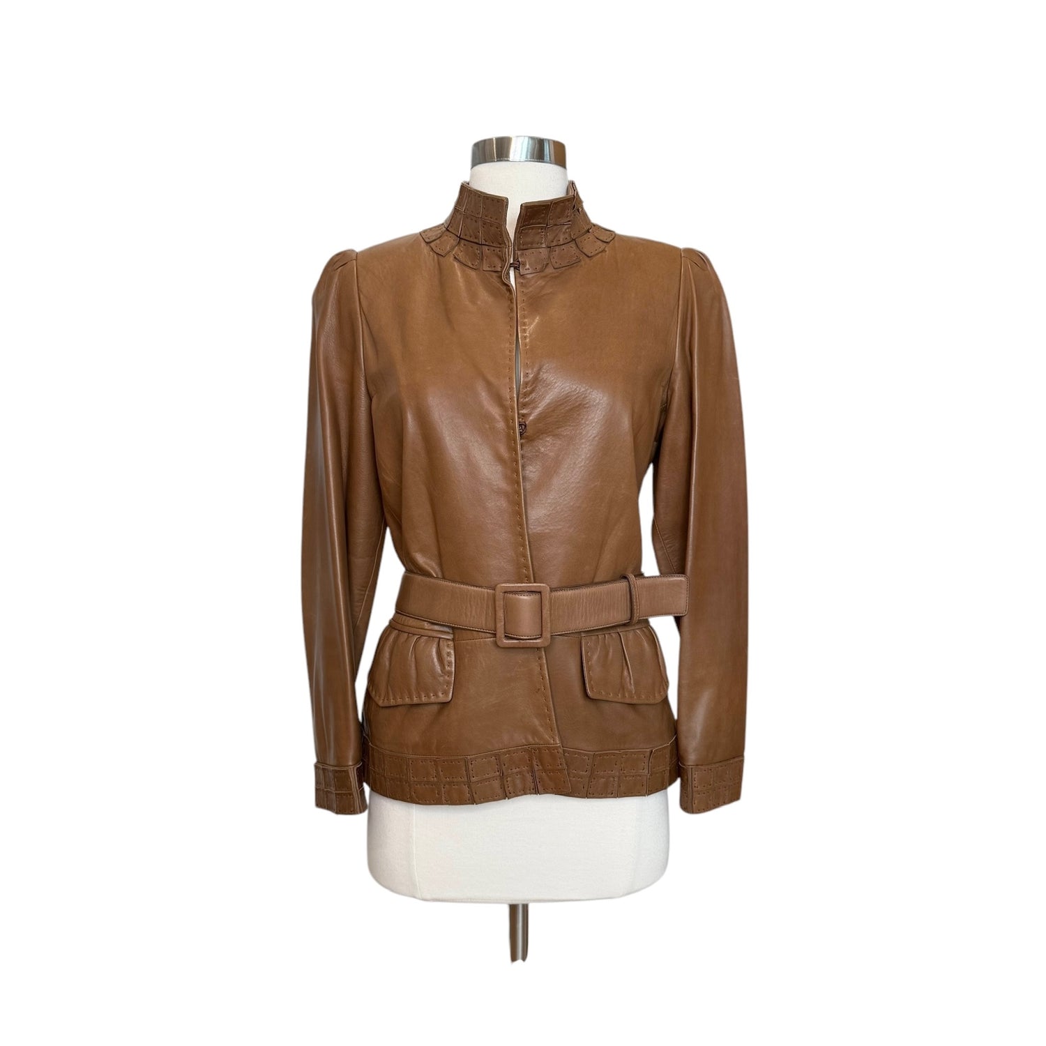 Yves Saint Laurent vintage leather jacket. Brown lambskin leather which is buttery soft. Removable belt. Stand alone collar. Flap pockets. Hook and eye closure. XL logo silk lining. Designer size 40.