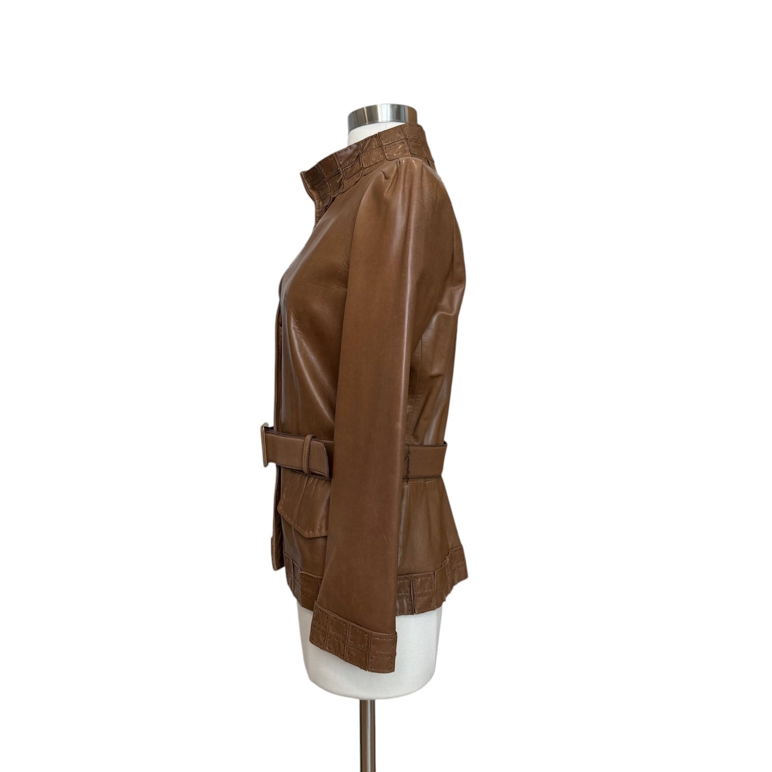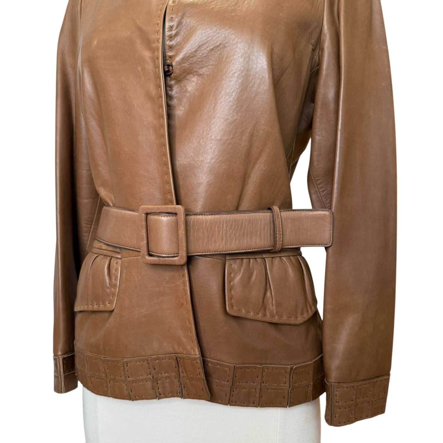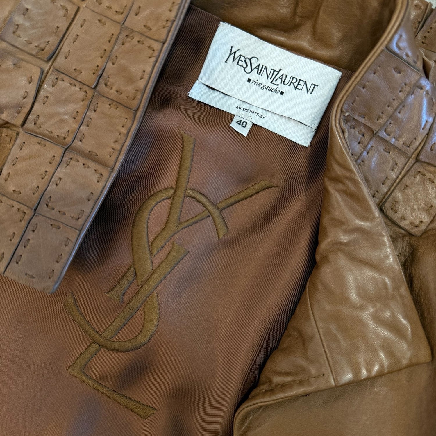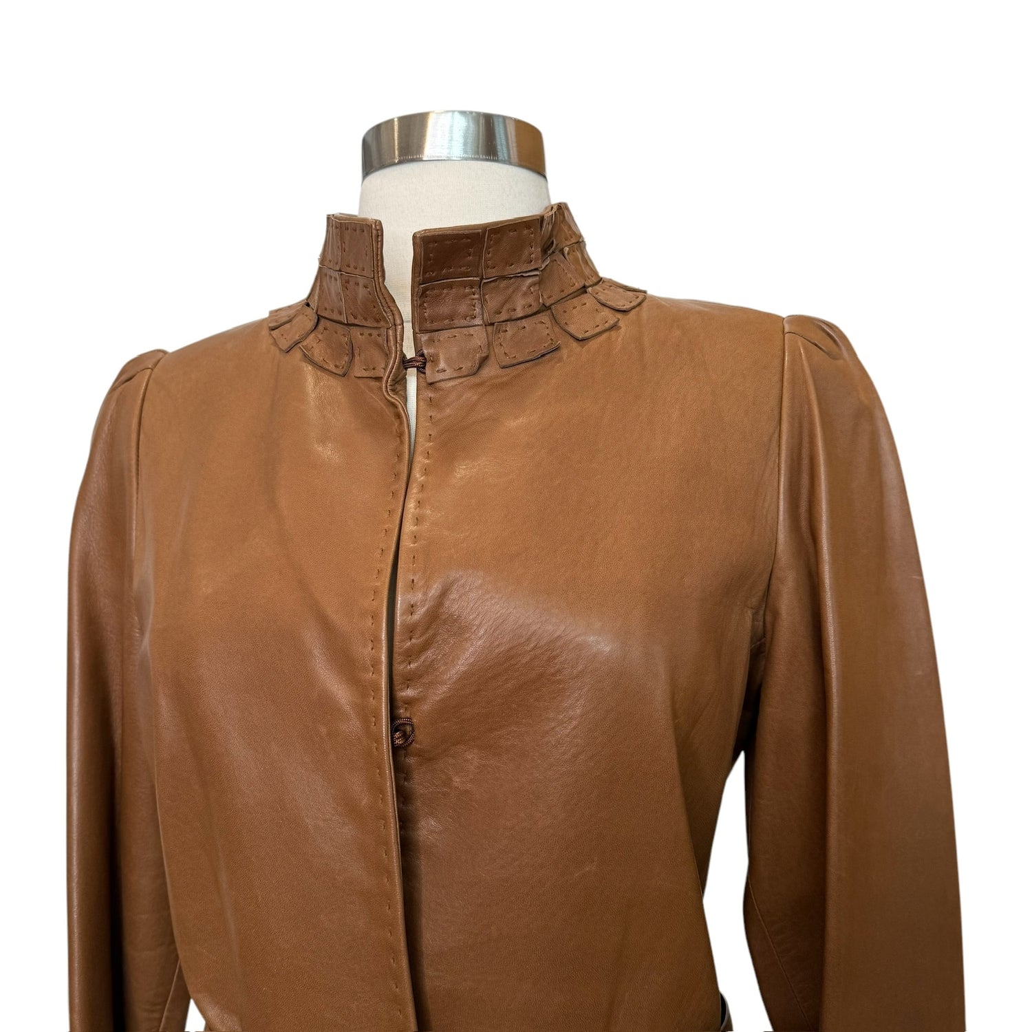 Yves Saint Laurent vintage leather jacket. Brown lambskin leather which is buttery soft. Removable belt. Stand alone collar. Flap pockets. Hook and eye closure. XL logo silk lining. Designer size 40.