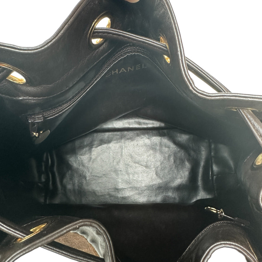 Chanel vintage brown suede bag. Bucket style bag with drawstrings closure. CC logo at gold-tone balls and chains. Quilted diamond pattern. Brown leather trim. One interior zipper pocket.