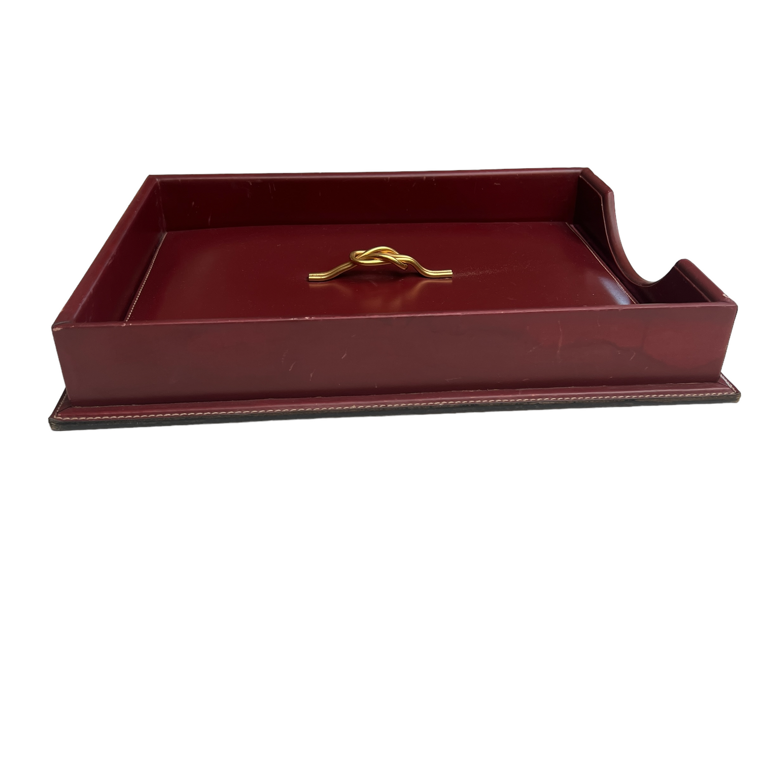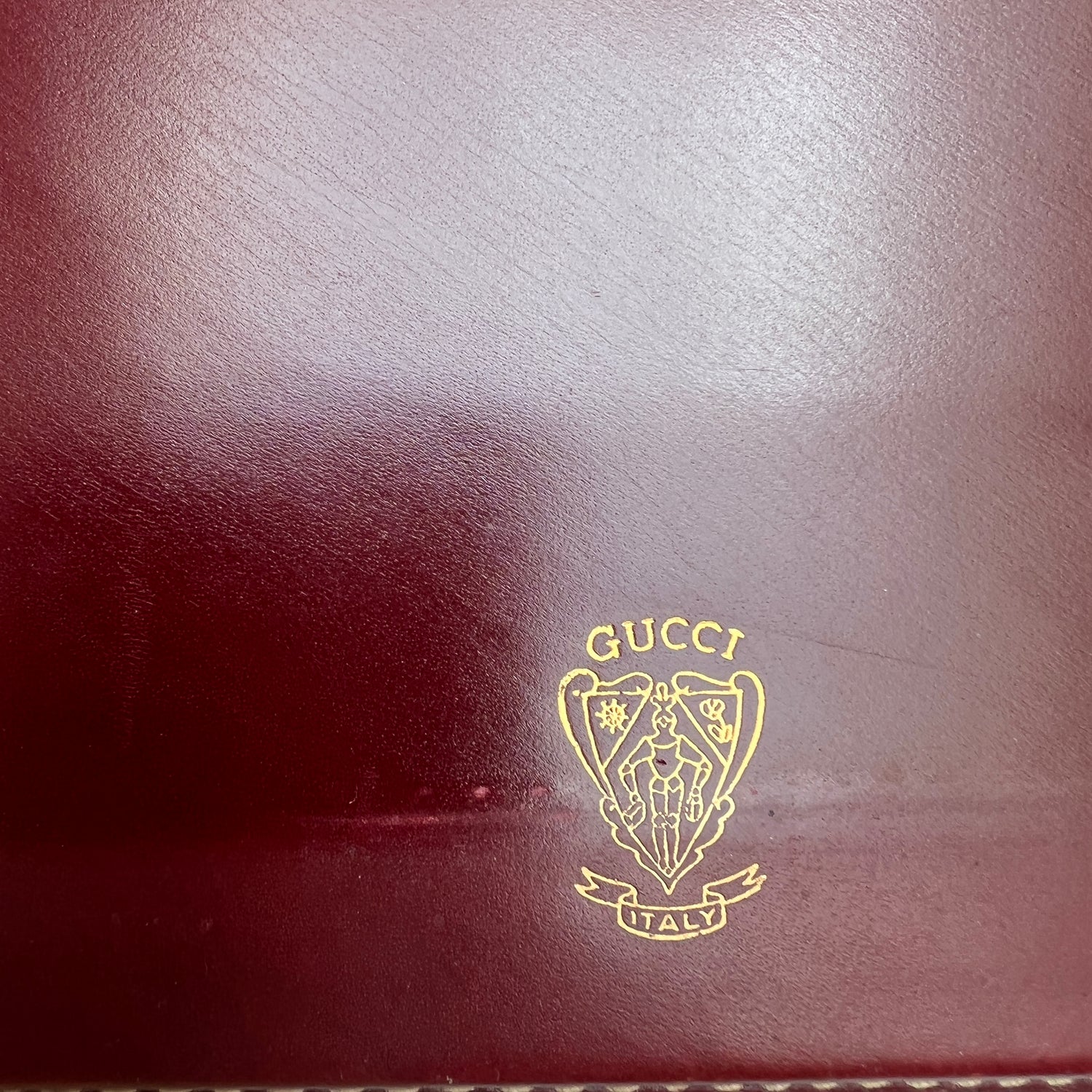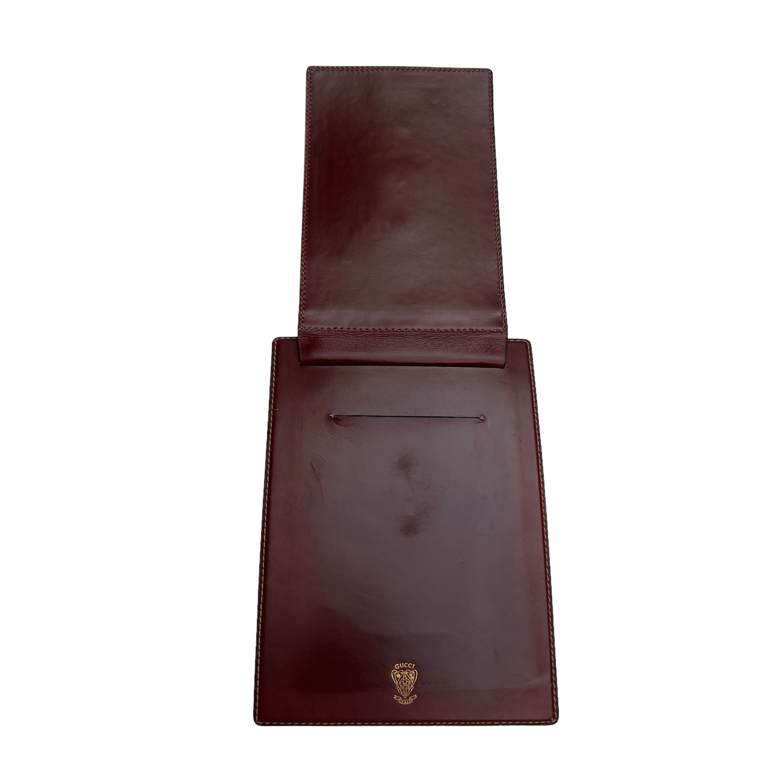 Gucci vintage desk set. Paper tray, block note, pen holder. Burgundy leather. Gold-tone hardware.