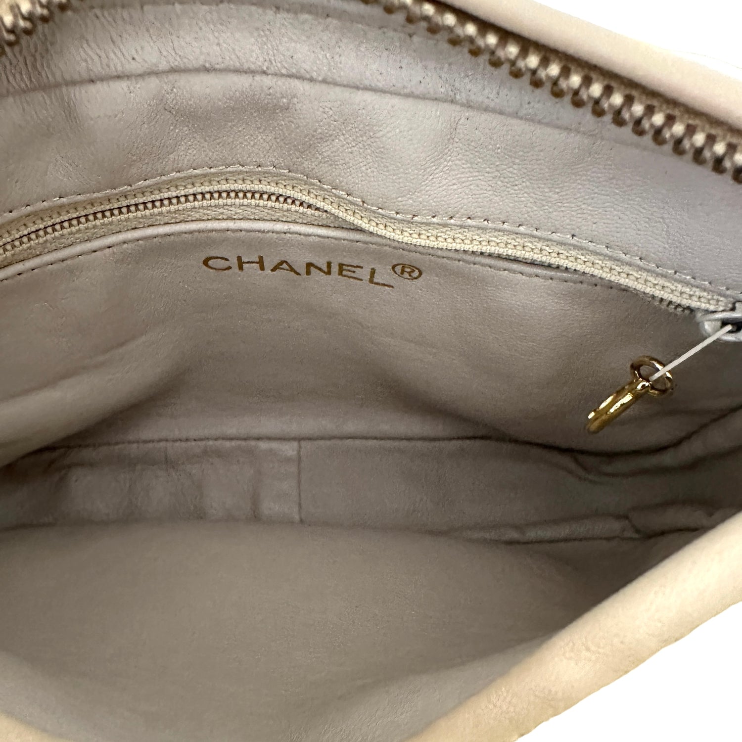 Chanel beige canvas camera bag. Double compartment with zipper closure. Lambskin leather lining. Gold-tone hardware and CC charms at zipper.