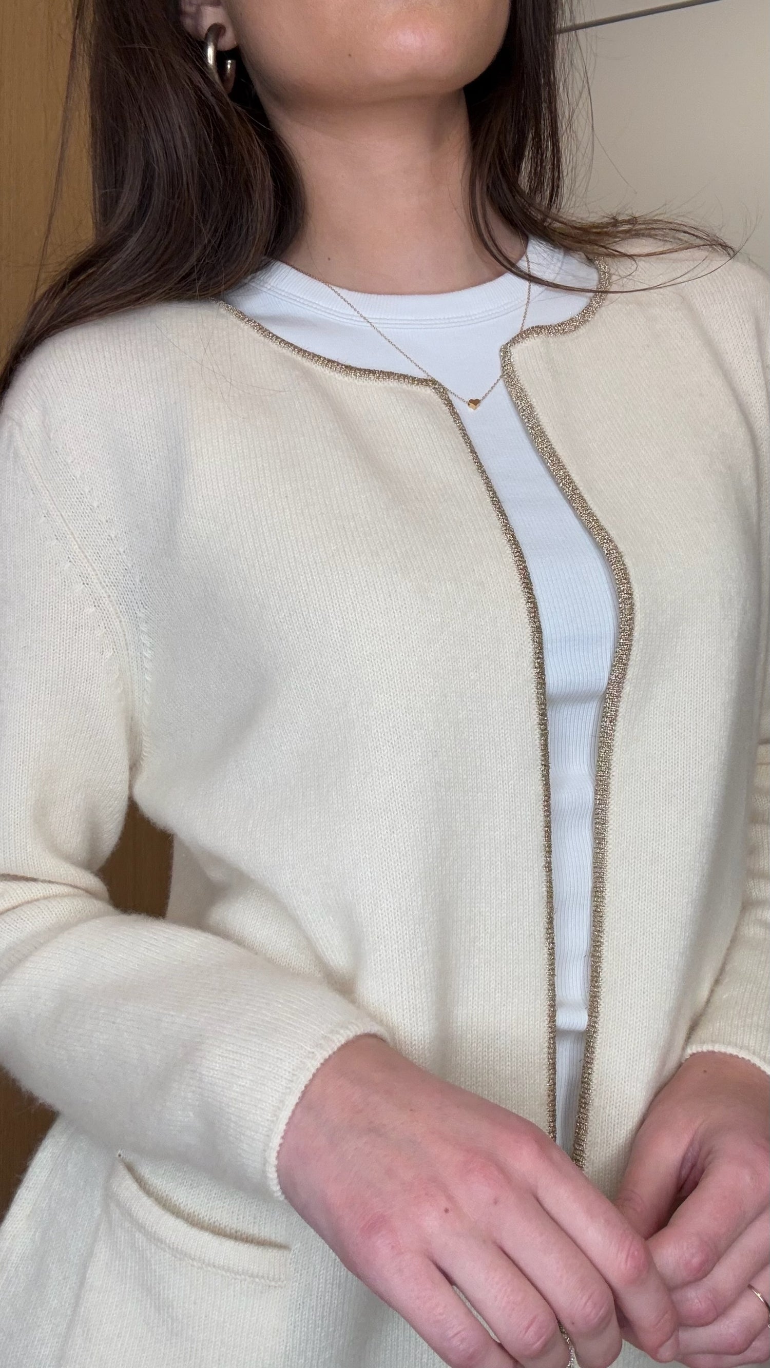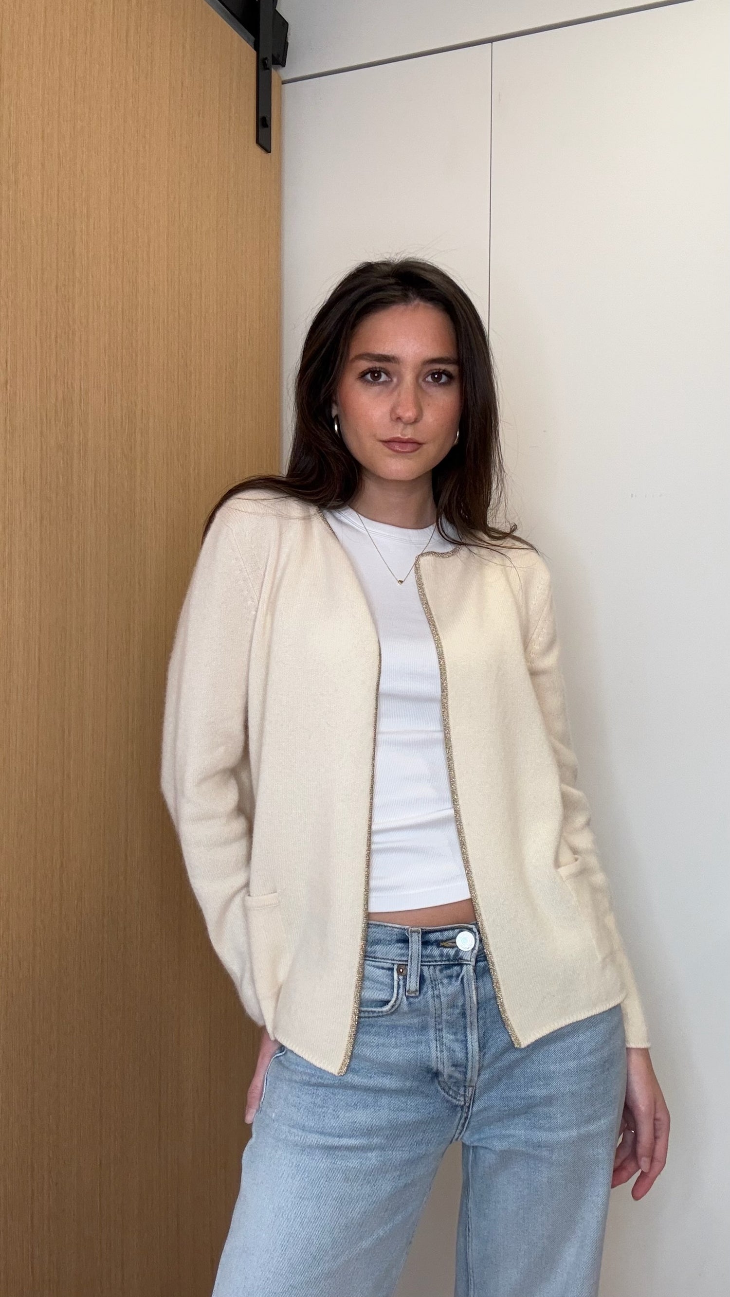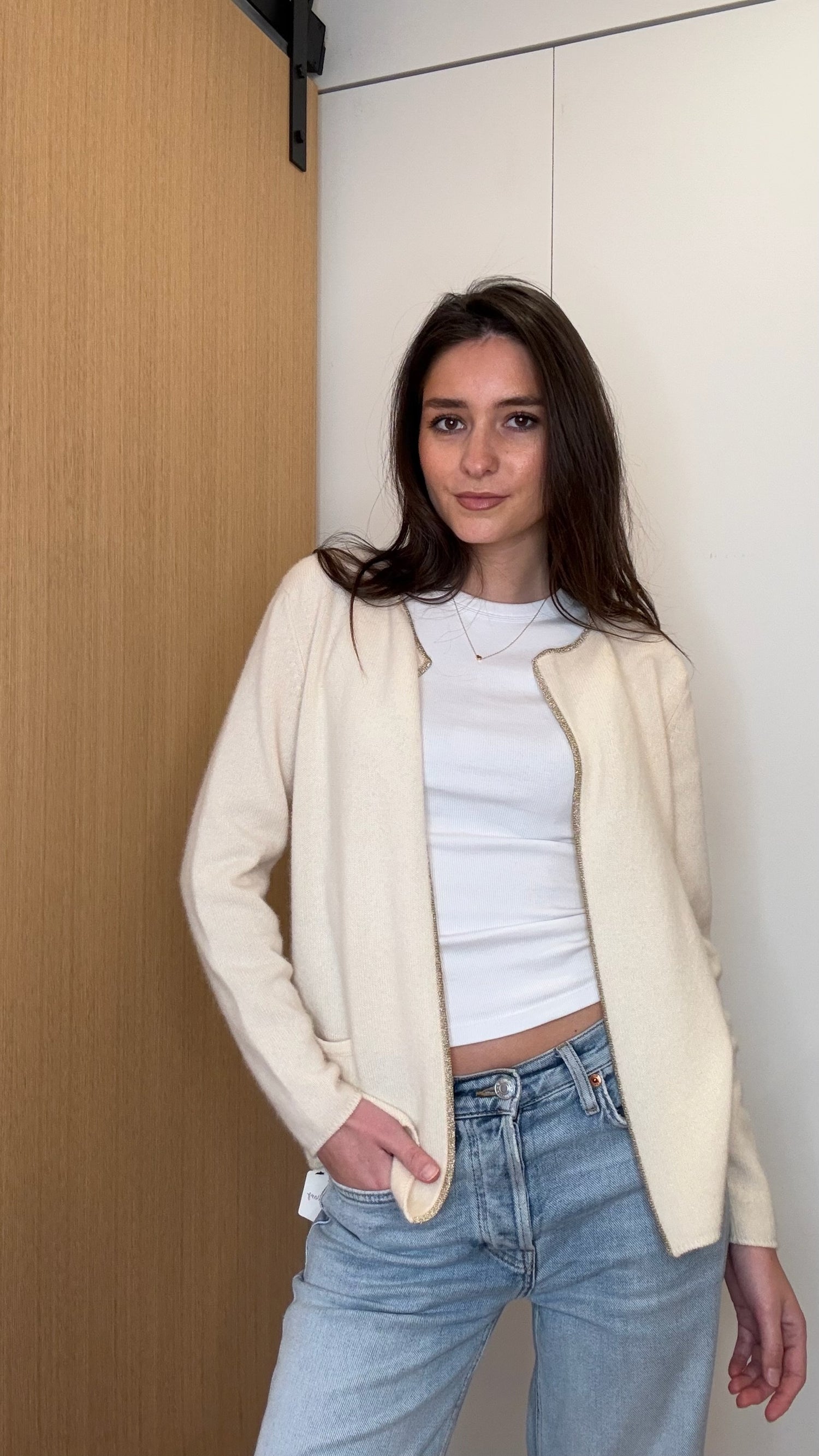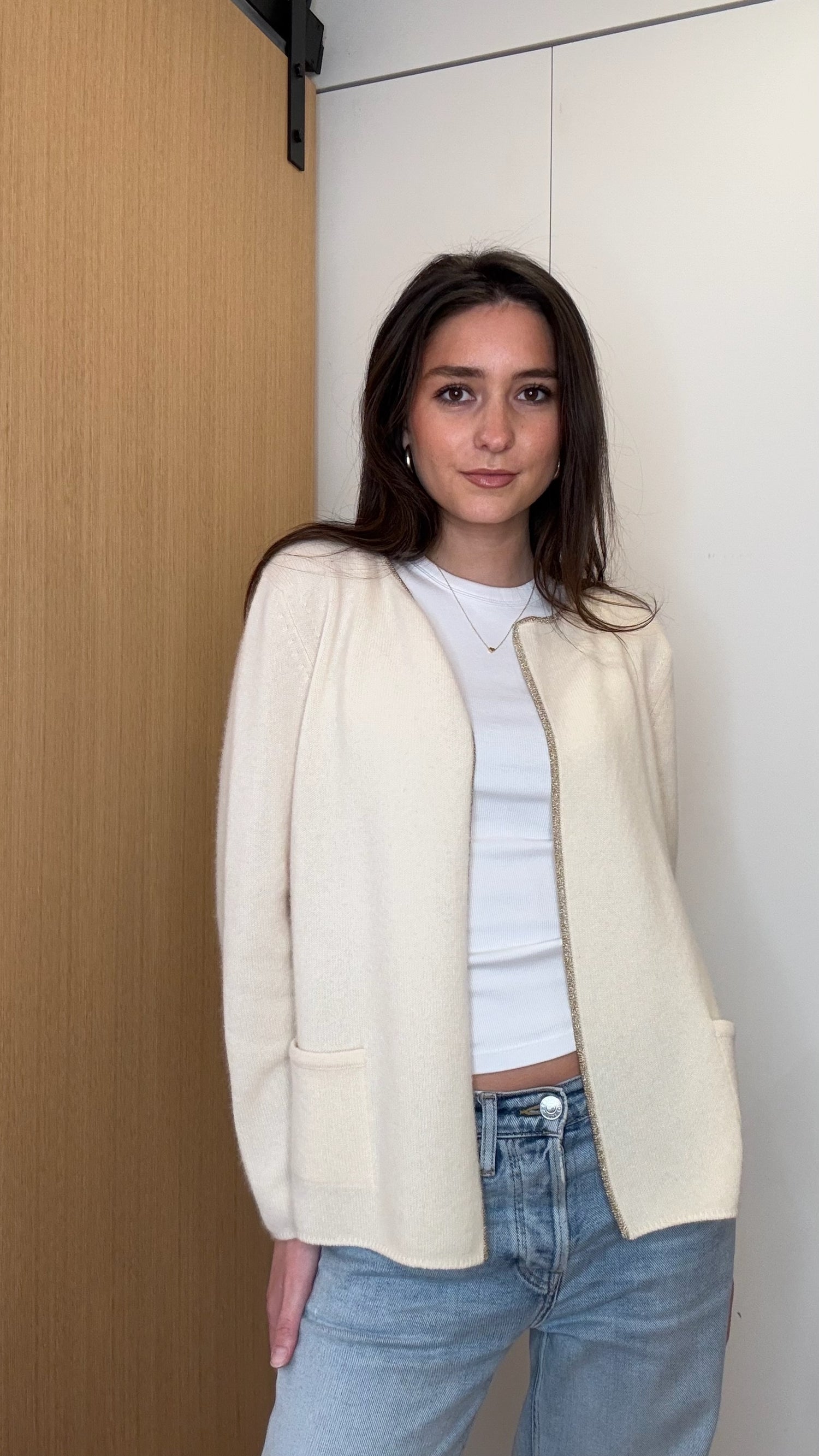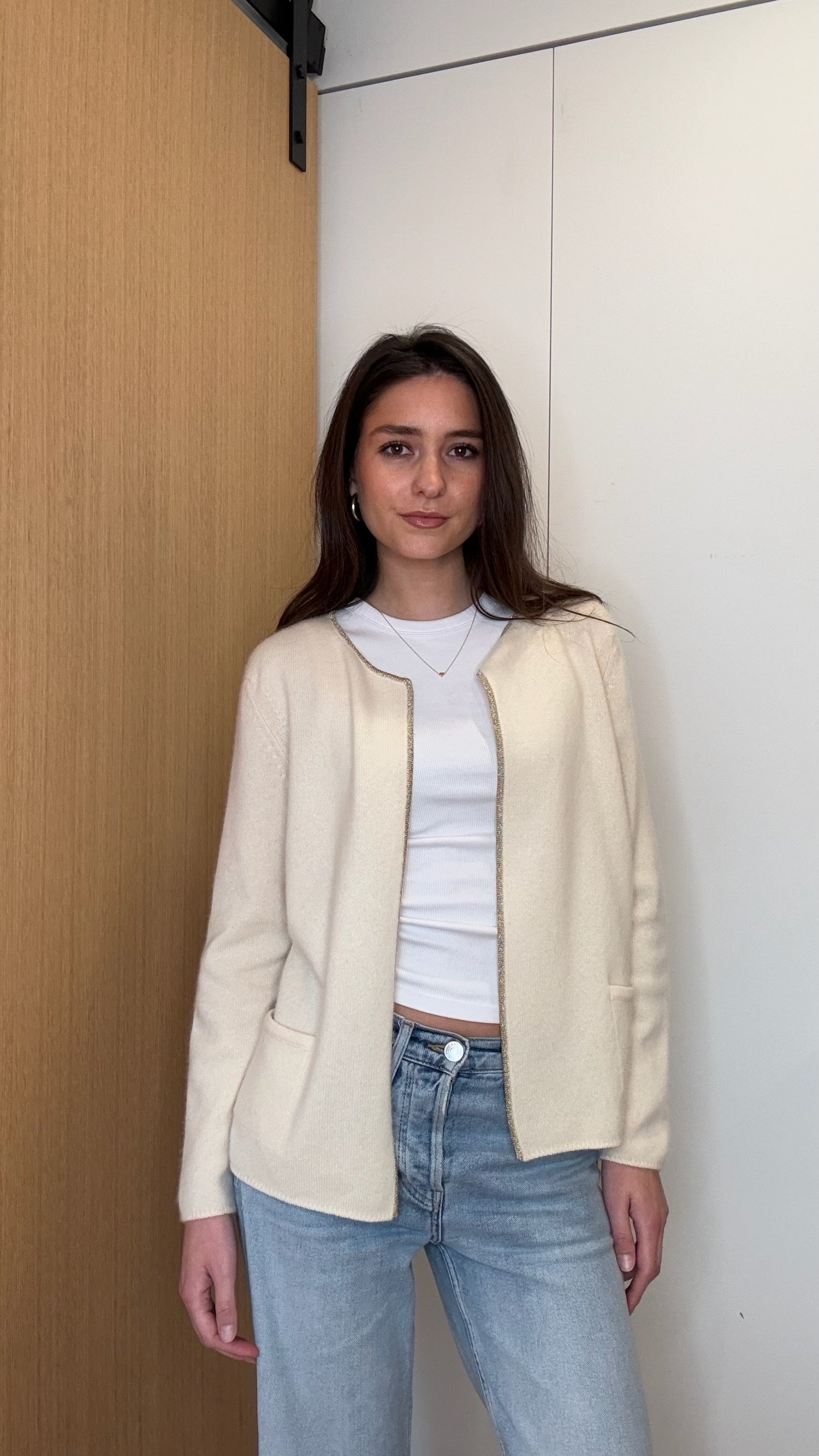 Chanel open front cashmere cardigan. Cruise 2001 collection. Cream color cashmere with gold trims. Pockets. Designer size 48.