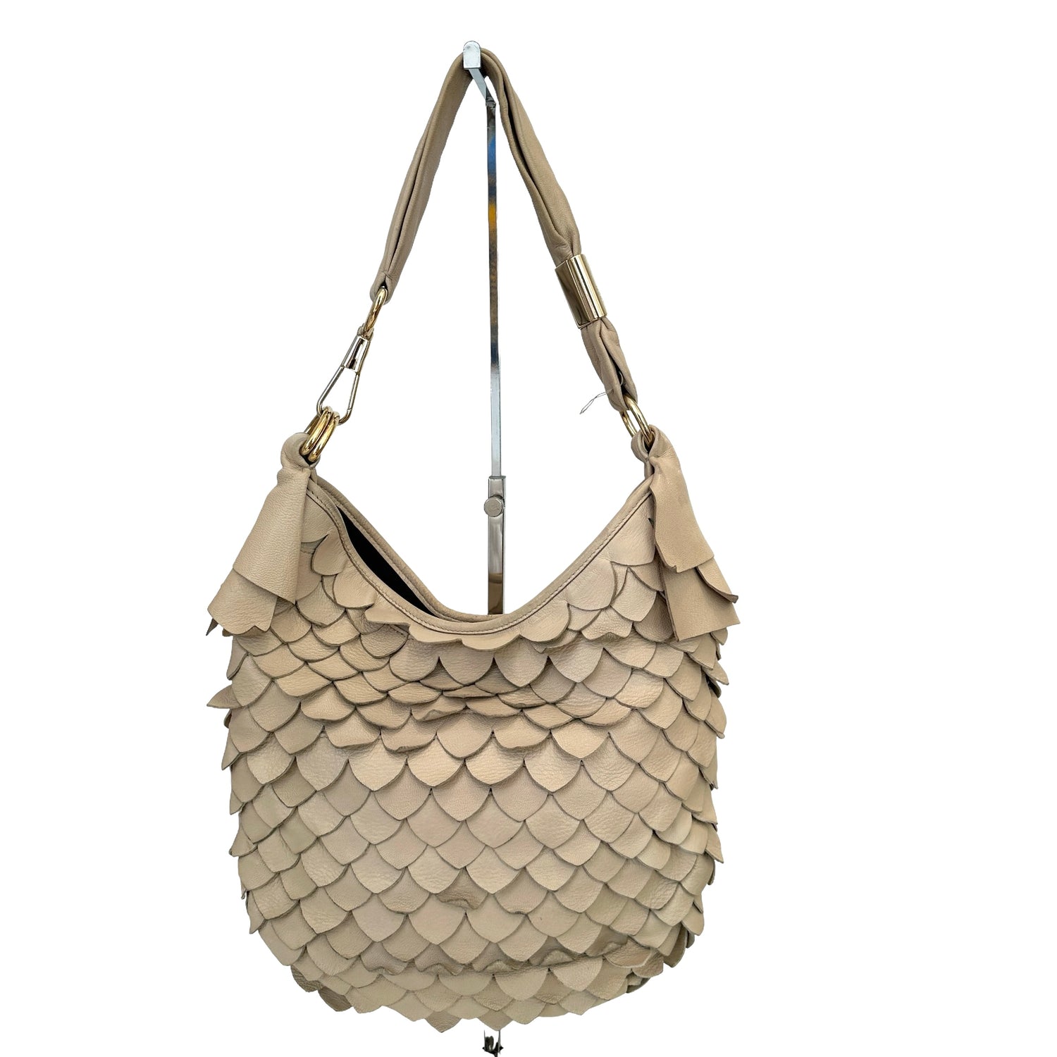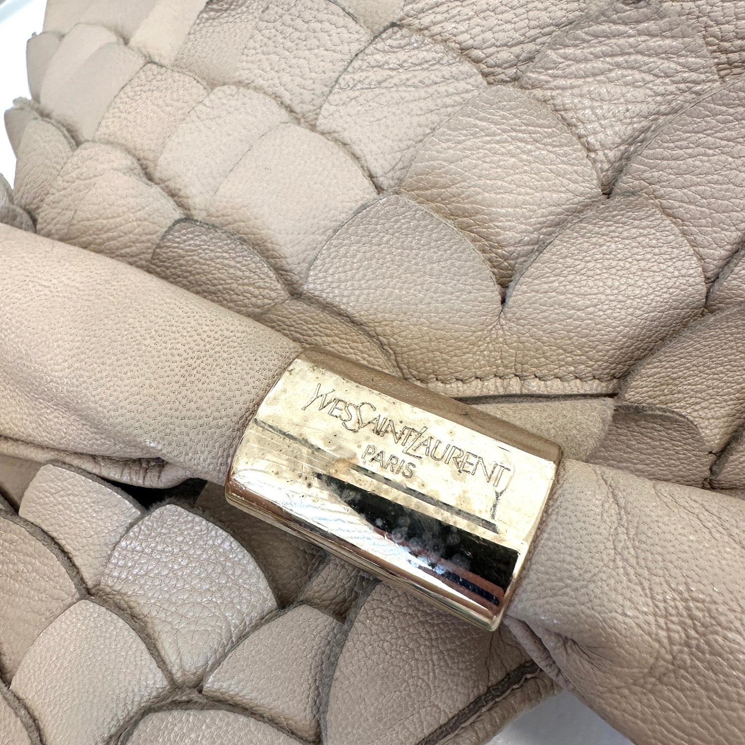 Yves Saint Laurent vintage hobo bag. Cream leather. One leather shoulder handle with YSL logo gold-tone hardware and clasp. Magnetic snap closure at top.