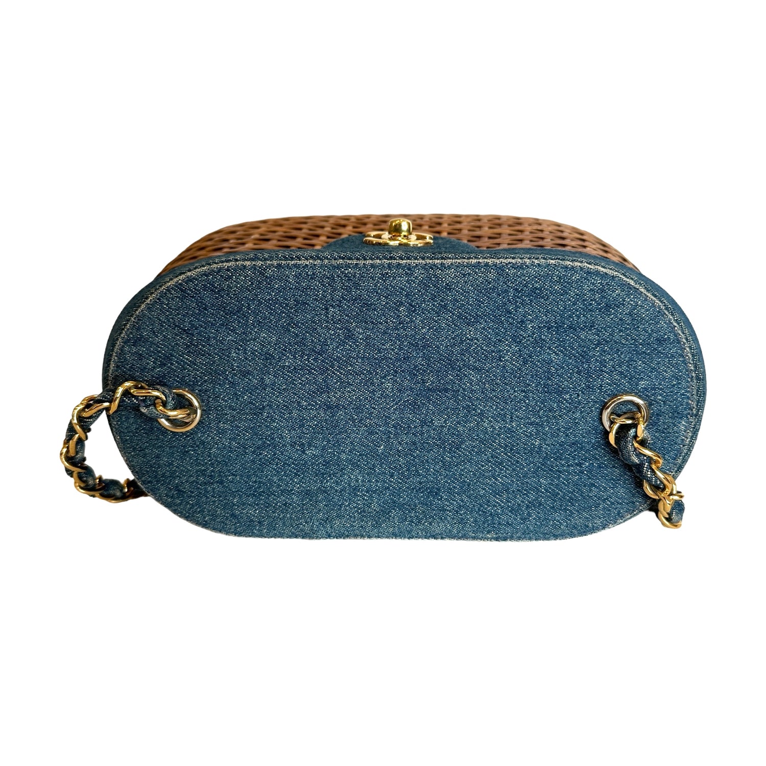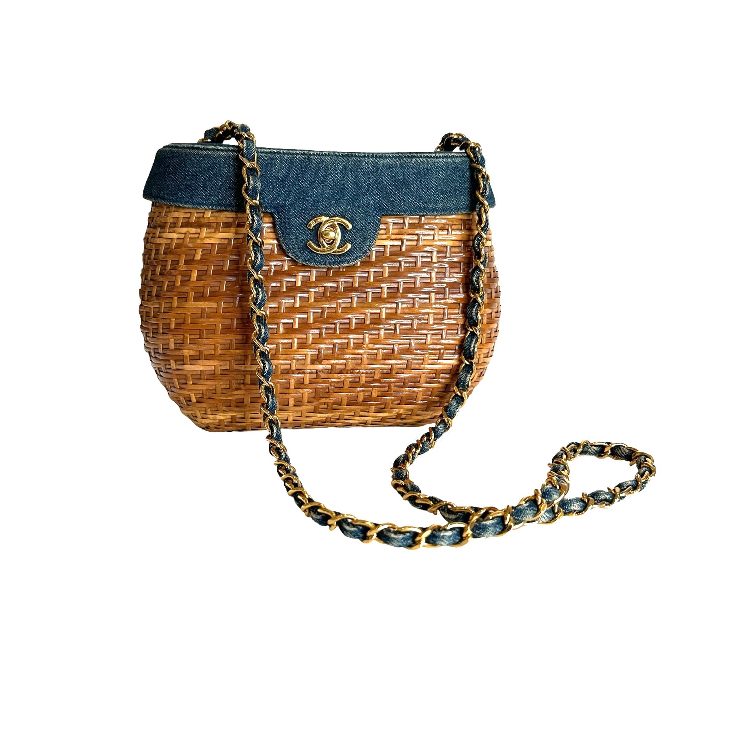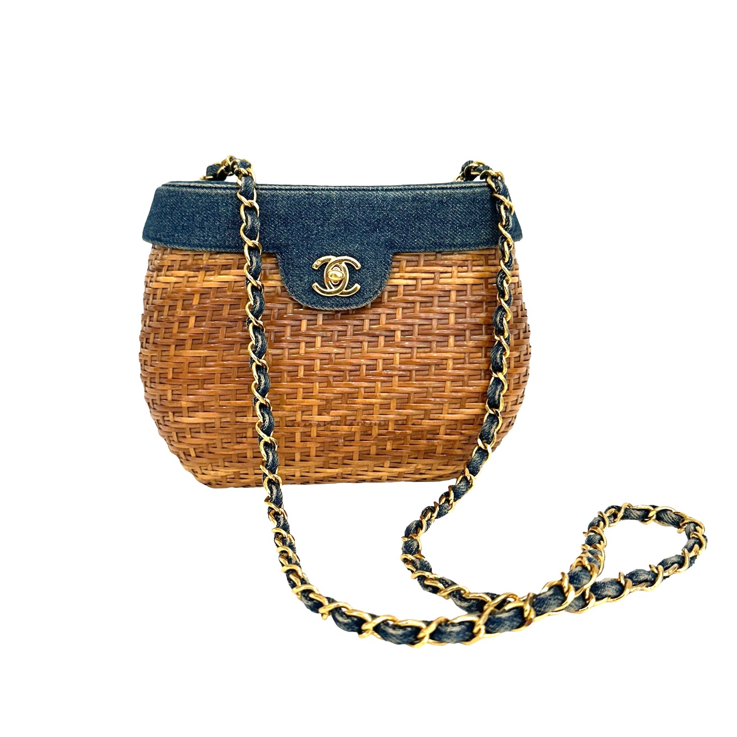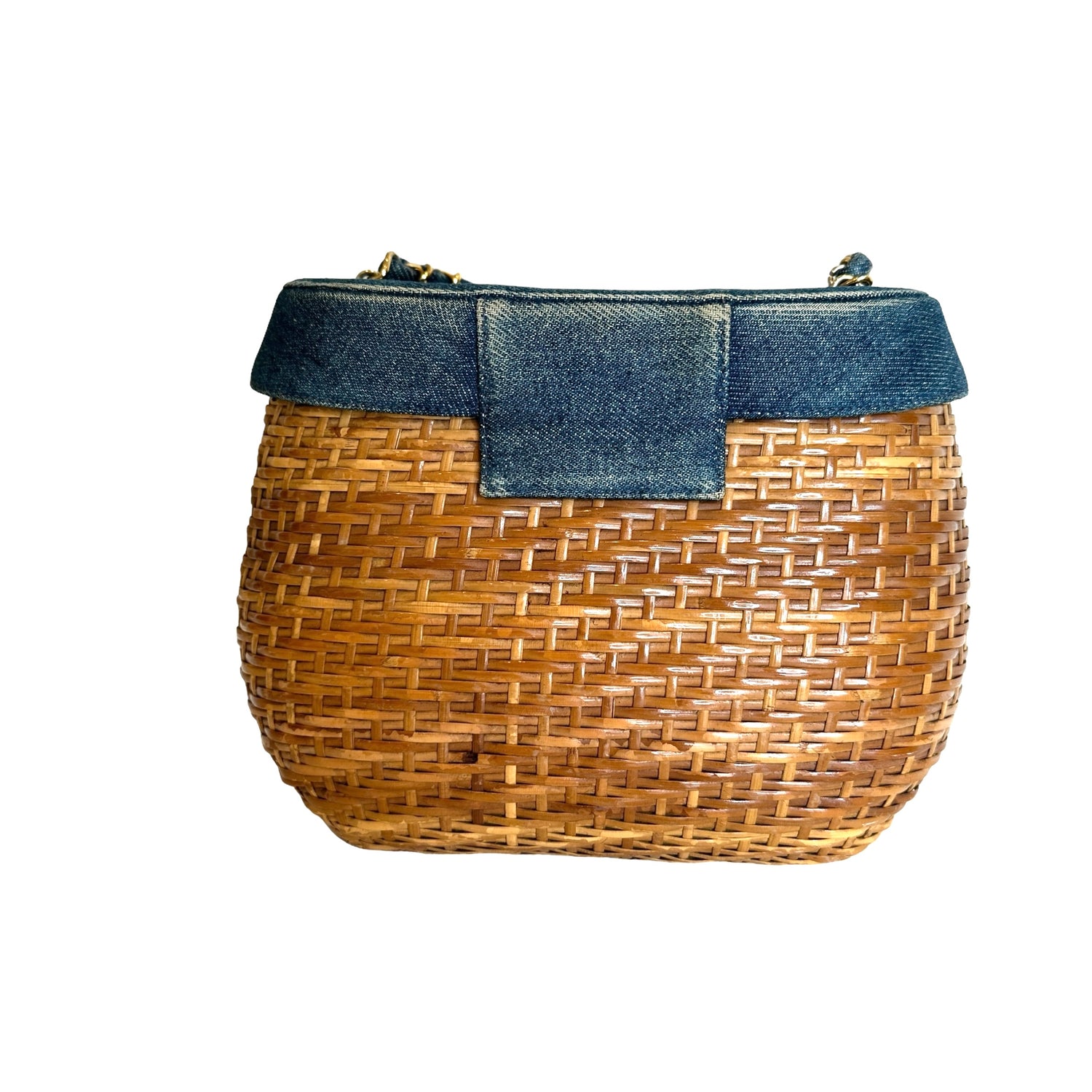 Chanel denim wicker bag. 1999 collection. Gold-plated hardware. Denim flap with denim and gold chain crossbody strap. Navy lambskin leather lining. One interior zipper pocket and one slit pocket.