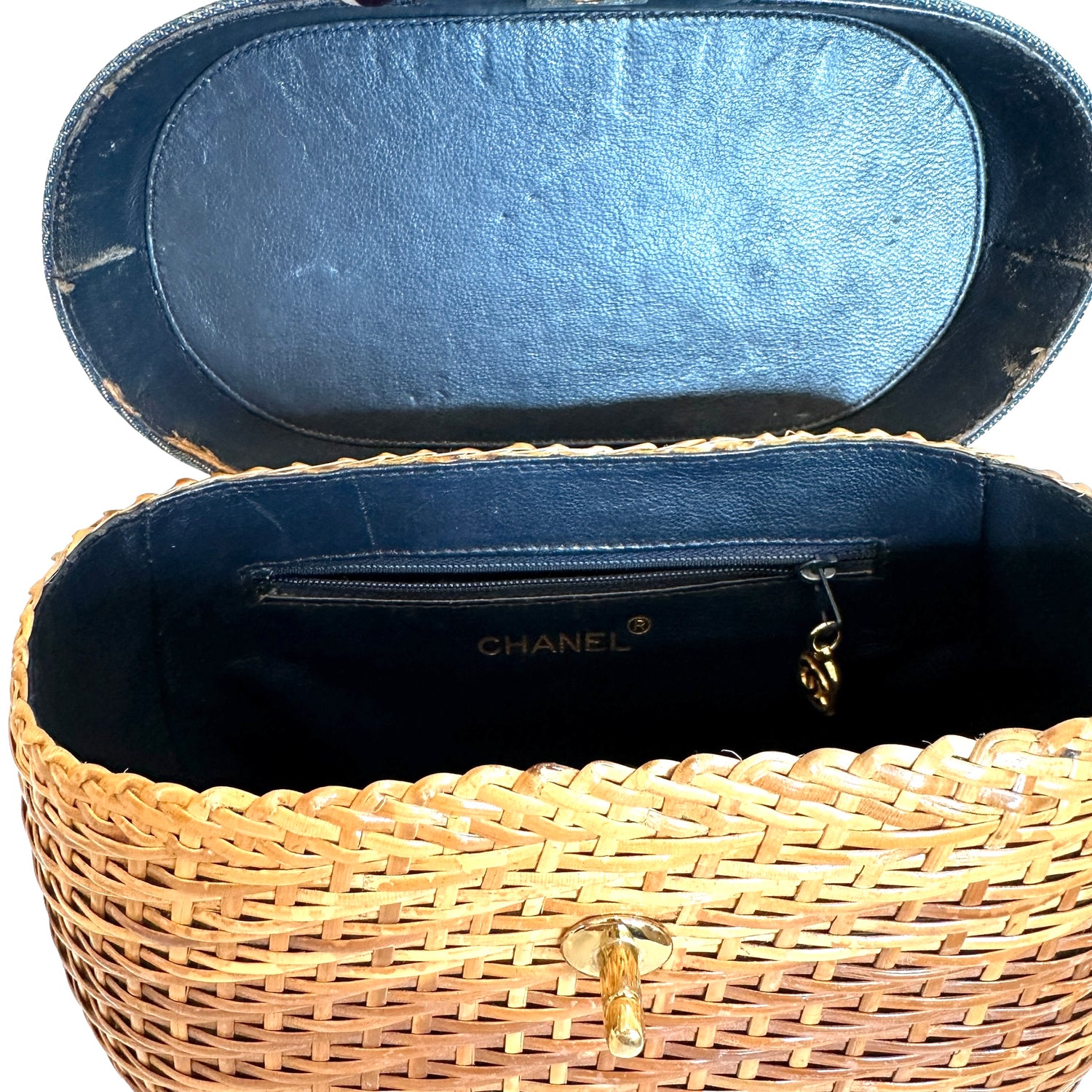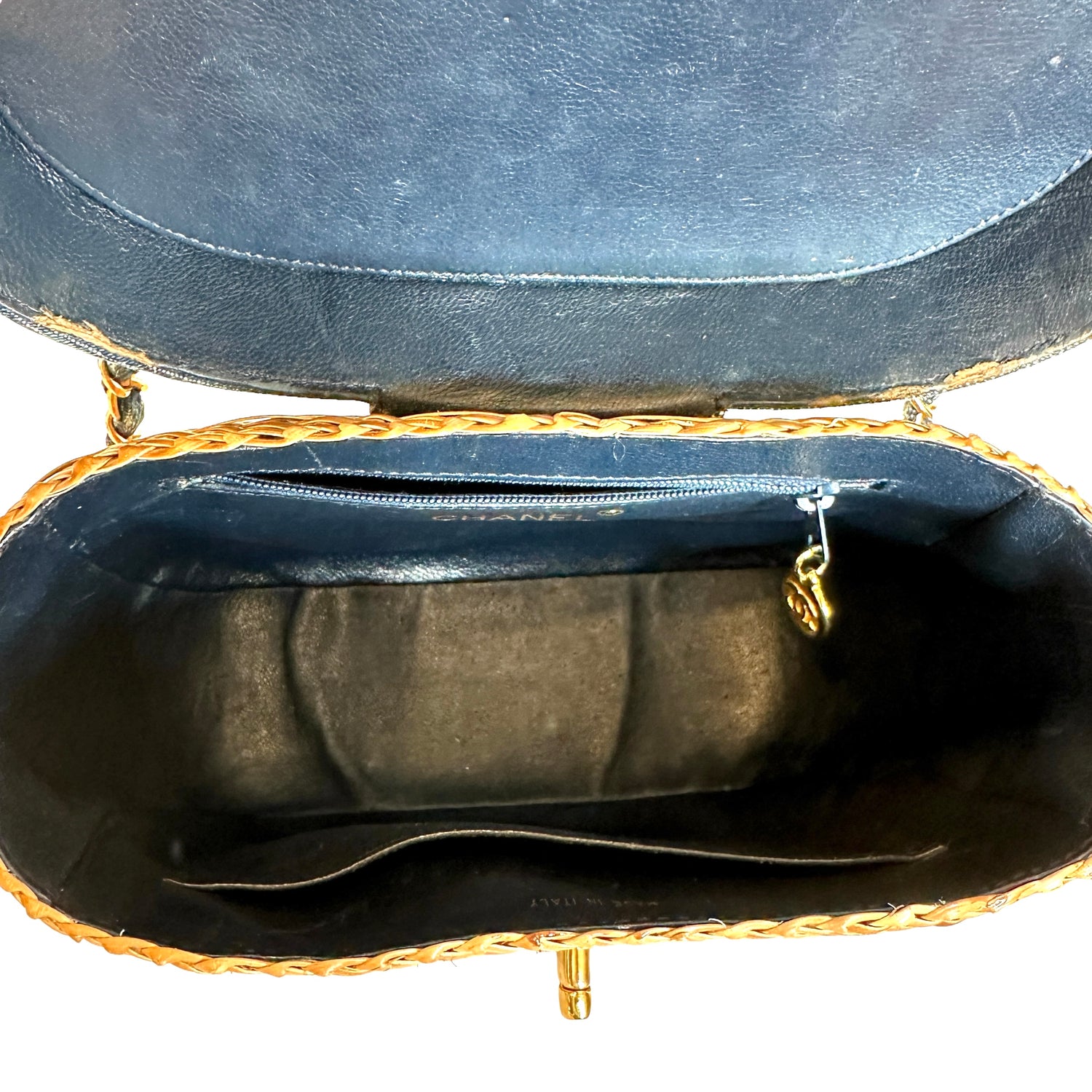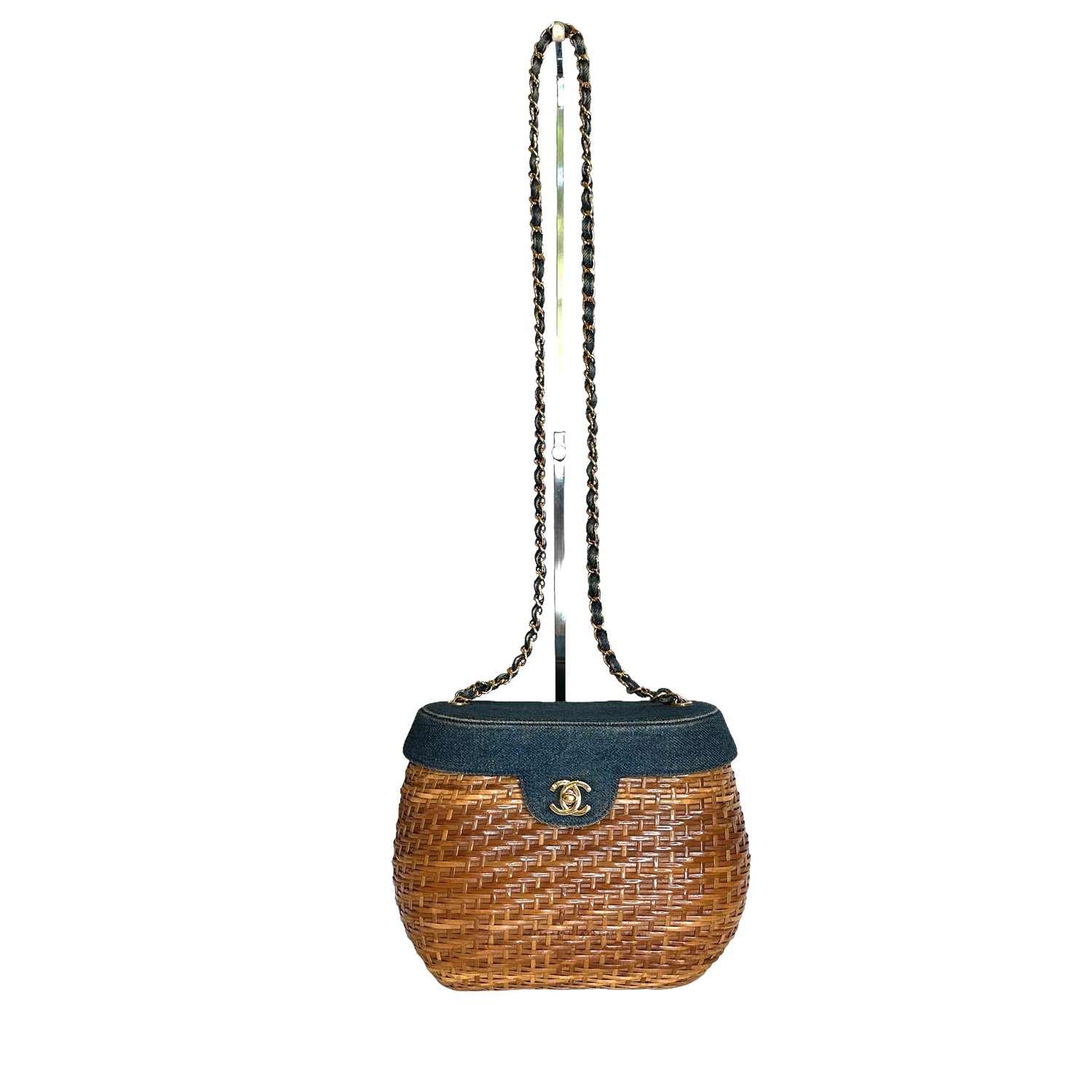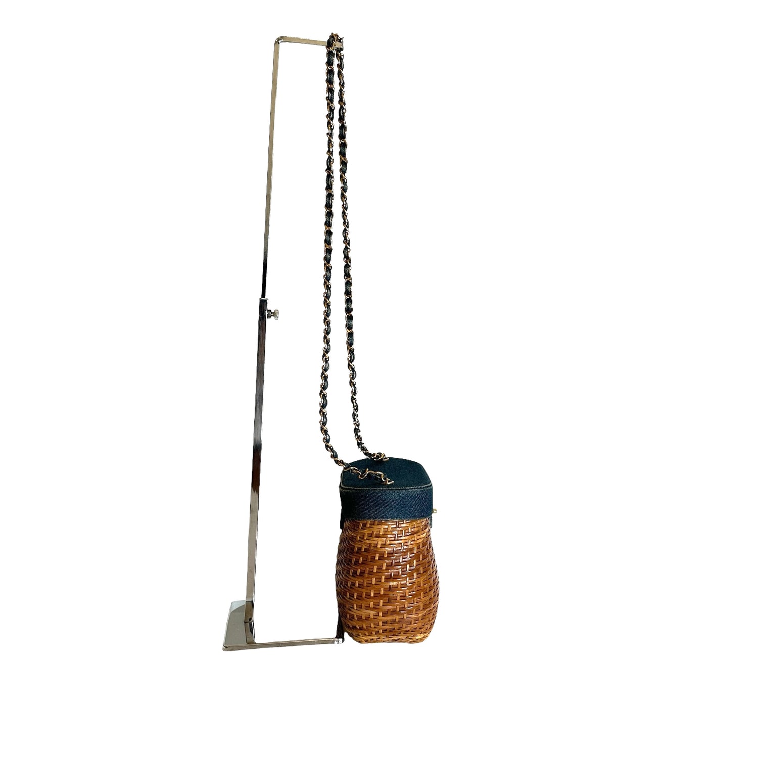 Chanel denim wicker bag. 1999 collection. Gold-plated hardware. Denim flap with denim and gold chain crossbody strap. Navy lambskin leather lining. One interior zipper pocket and one slit pocket.