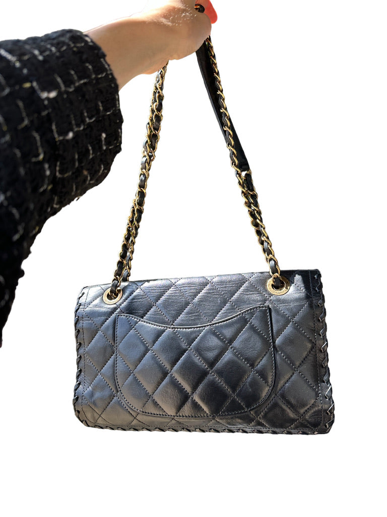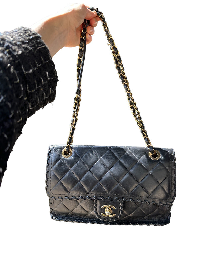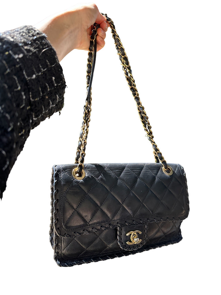 Chanel vintage black leather flap bag. Diamond quilted leather. Gold-tone hardware and chain. Flap bag with CC gold turnlock.