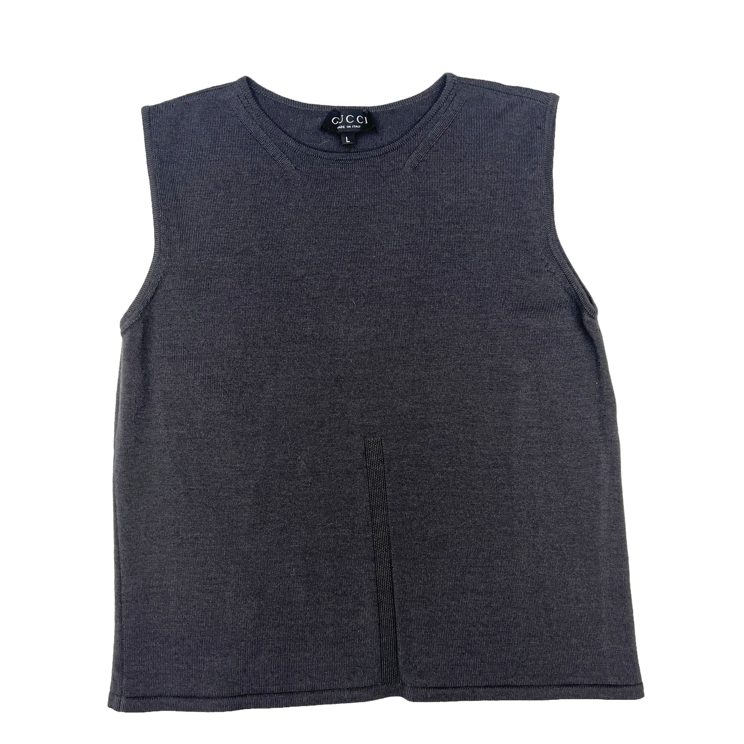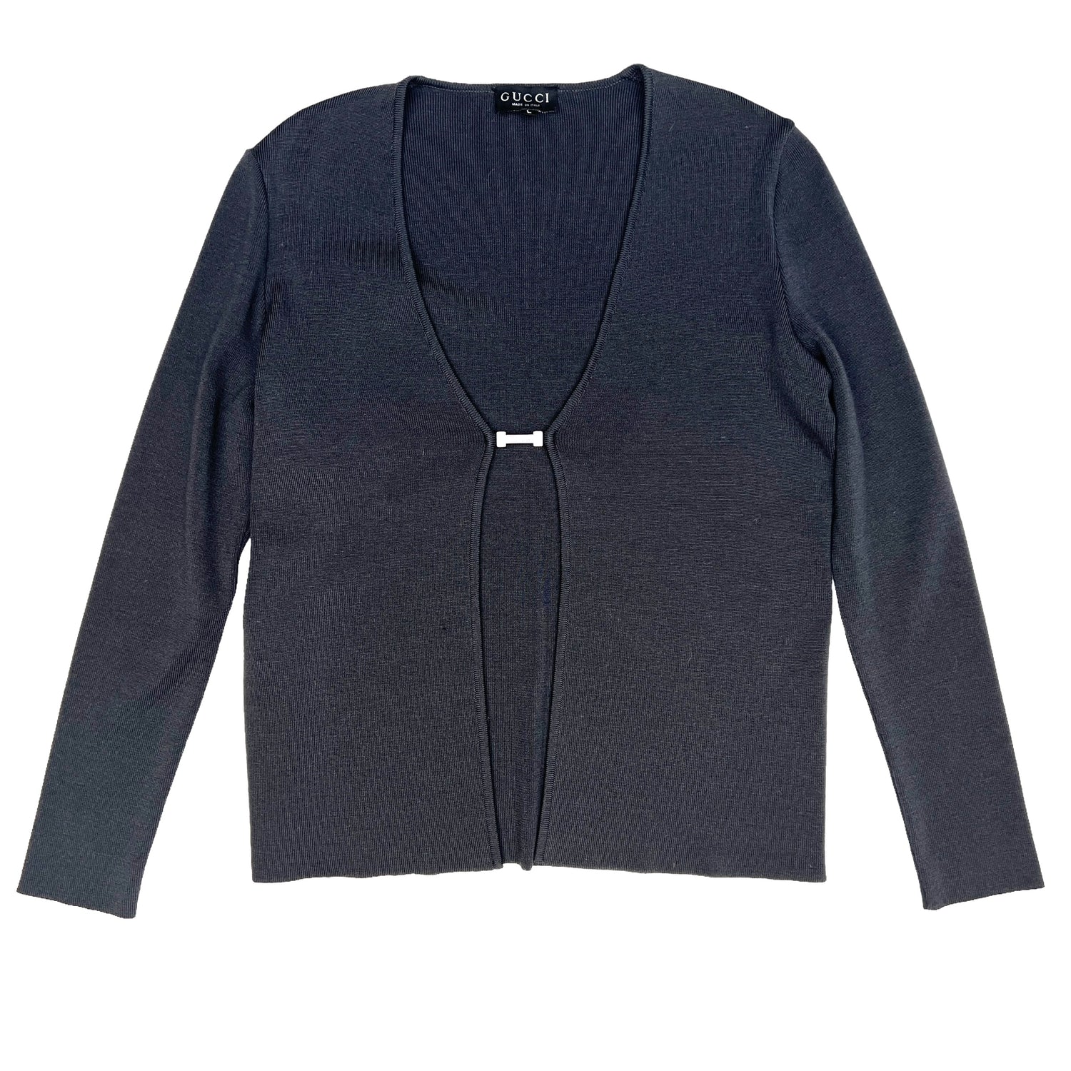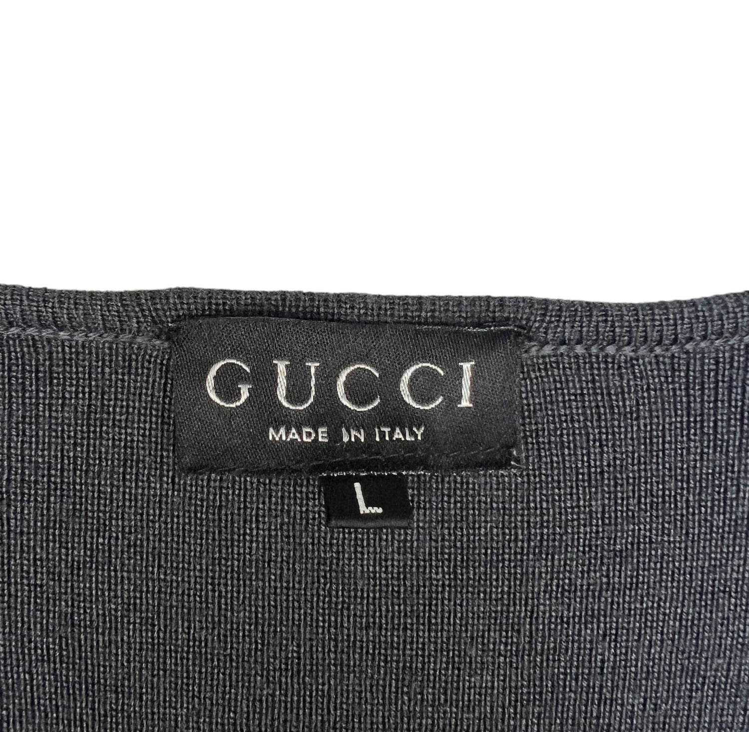 Gucci vintage set. Wool tank top and cardigan. Round neck tank top. Hook closure with logo brand at cardigan in gunmetal hardware. Designer size large.