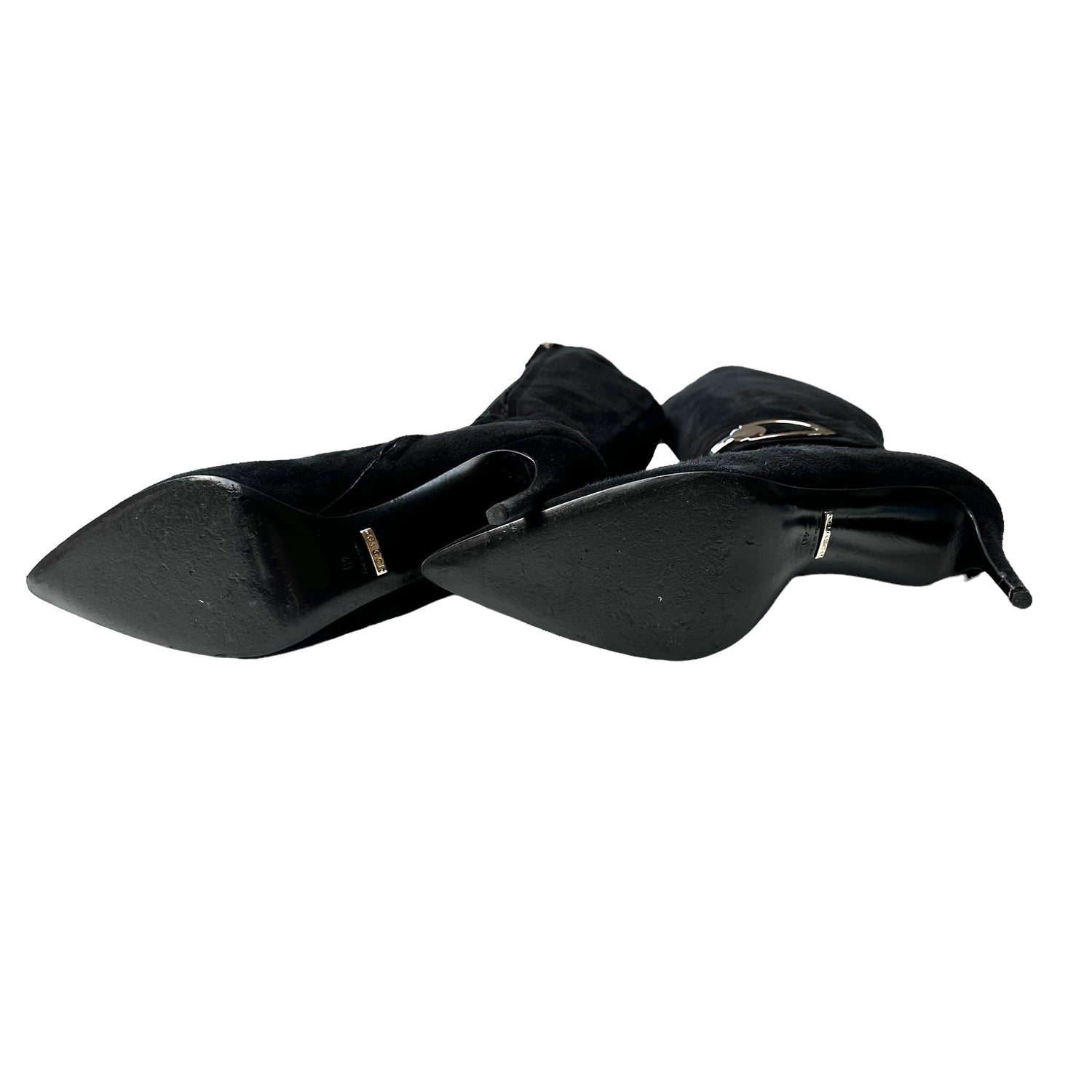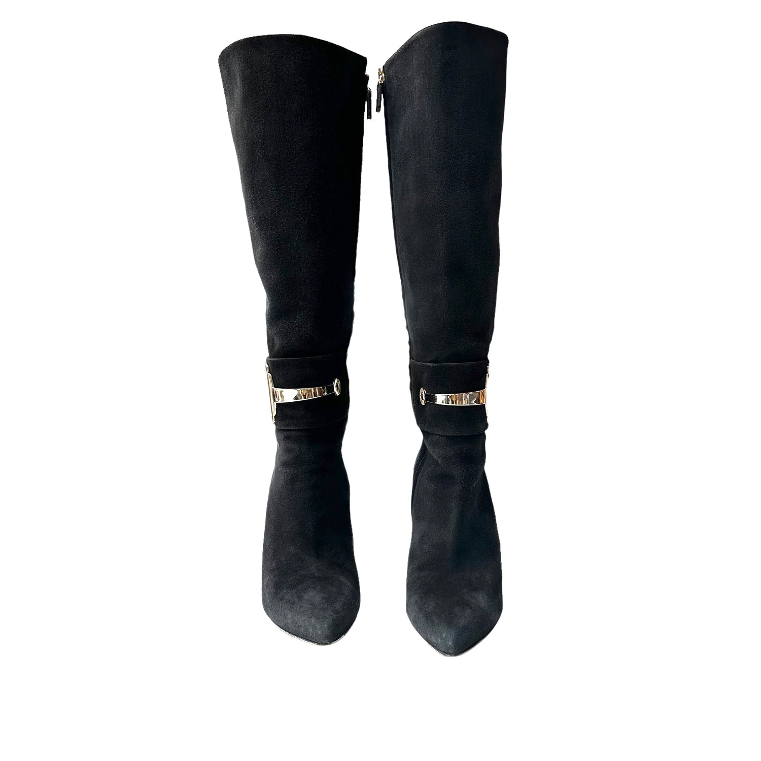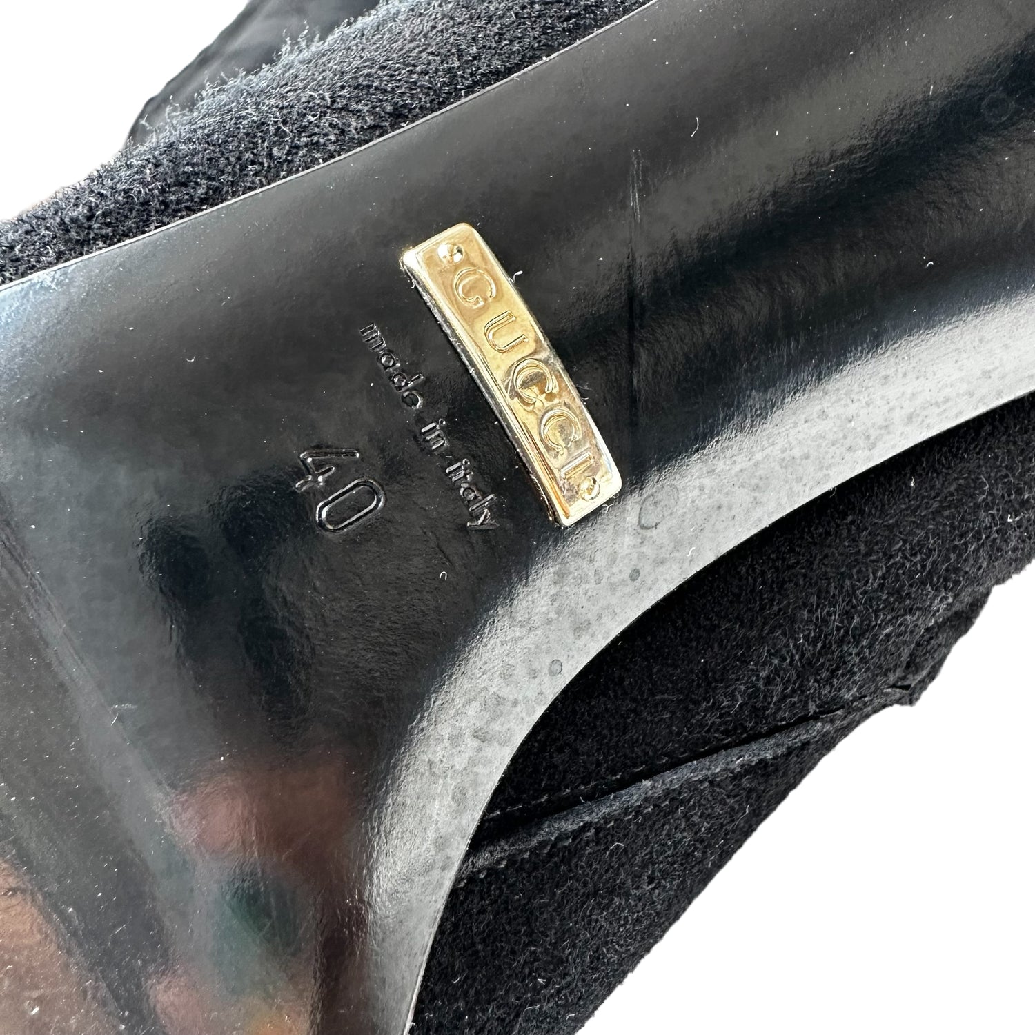 Gucci by Tom Ford high heeled boots. Black suede. Flat gold-tone horse bite detail at front. Pointed toe. Designer size 40.