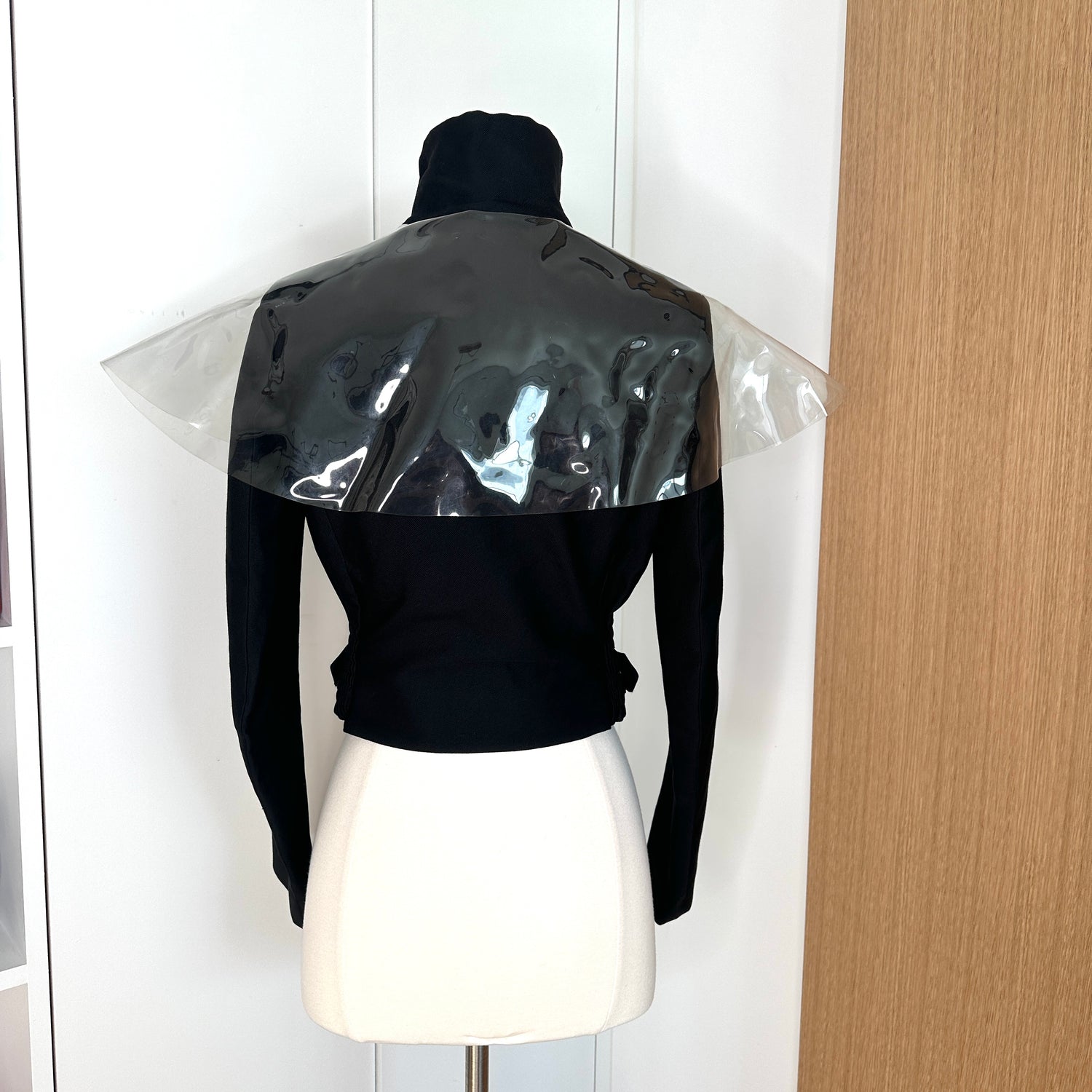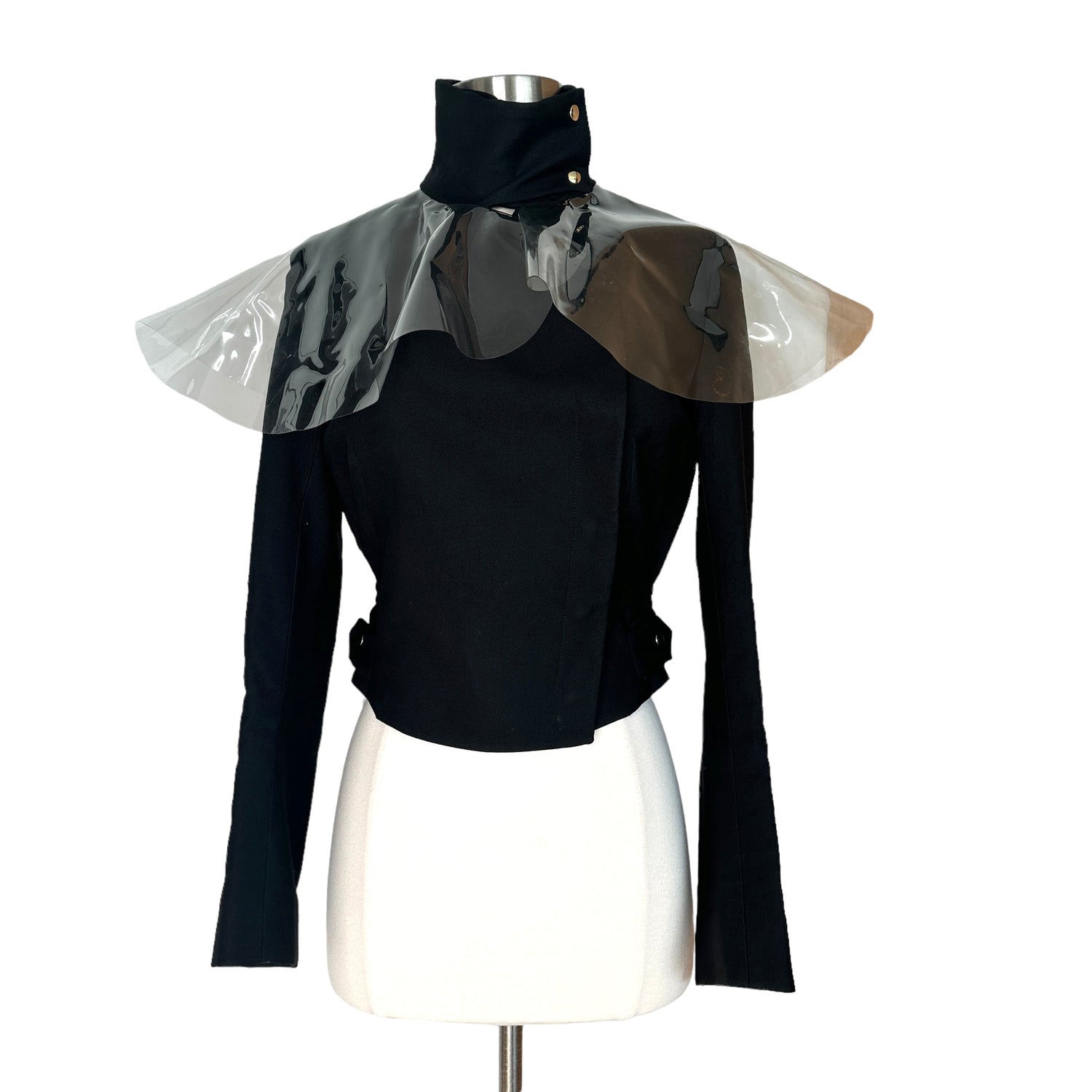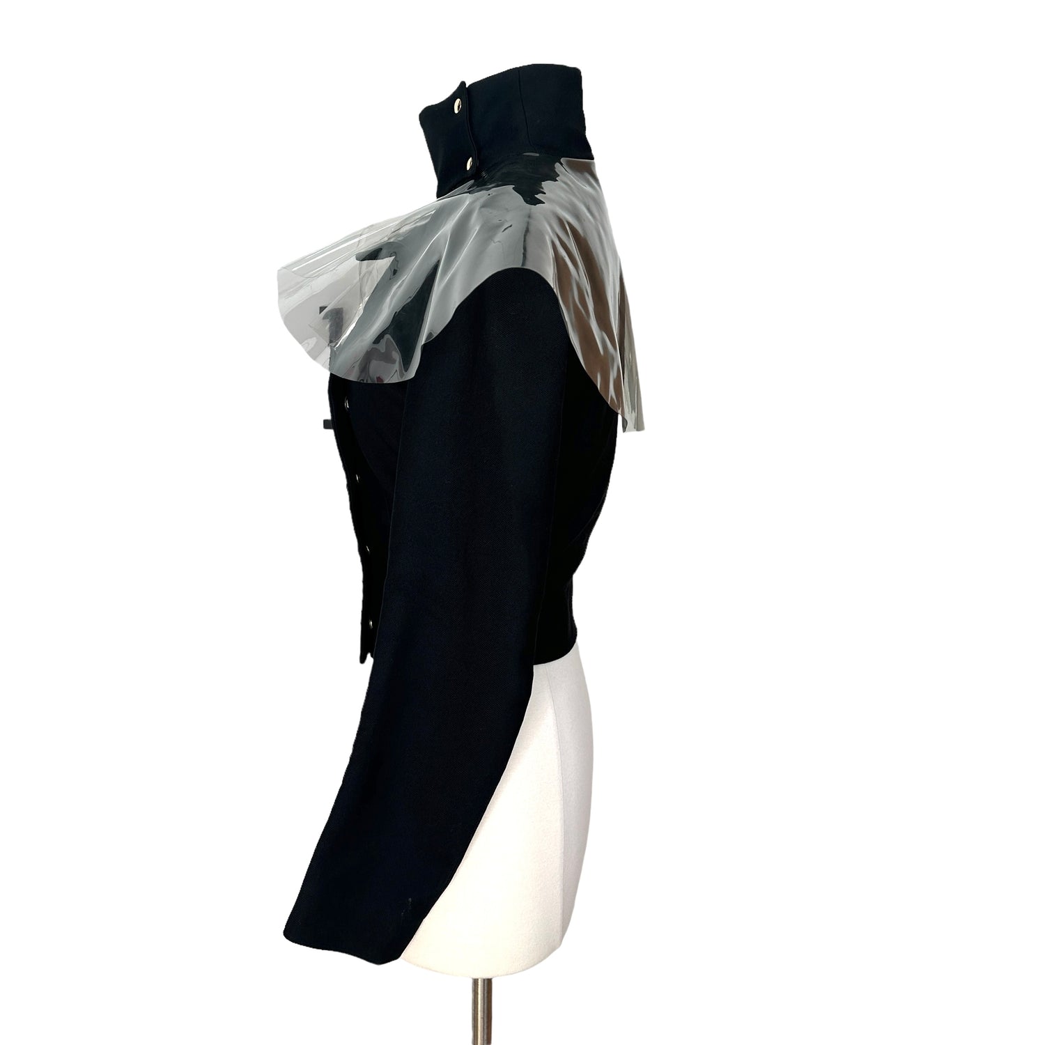 Yves Saint Laurent vintage black jacket. Snap button closure in gold-tone hardware. Stand alone collar with clear plexiglass shoulders. Fall/Winter 2010 collection. Designer size 36.