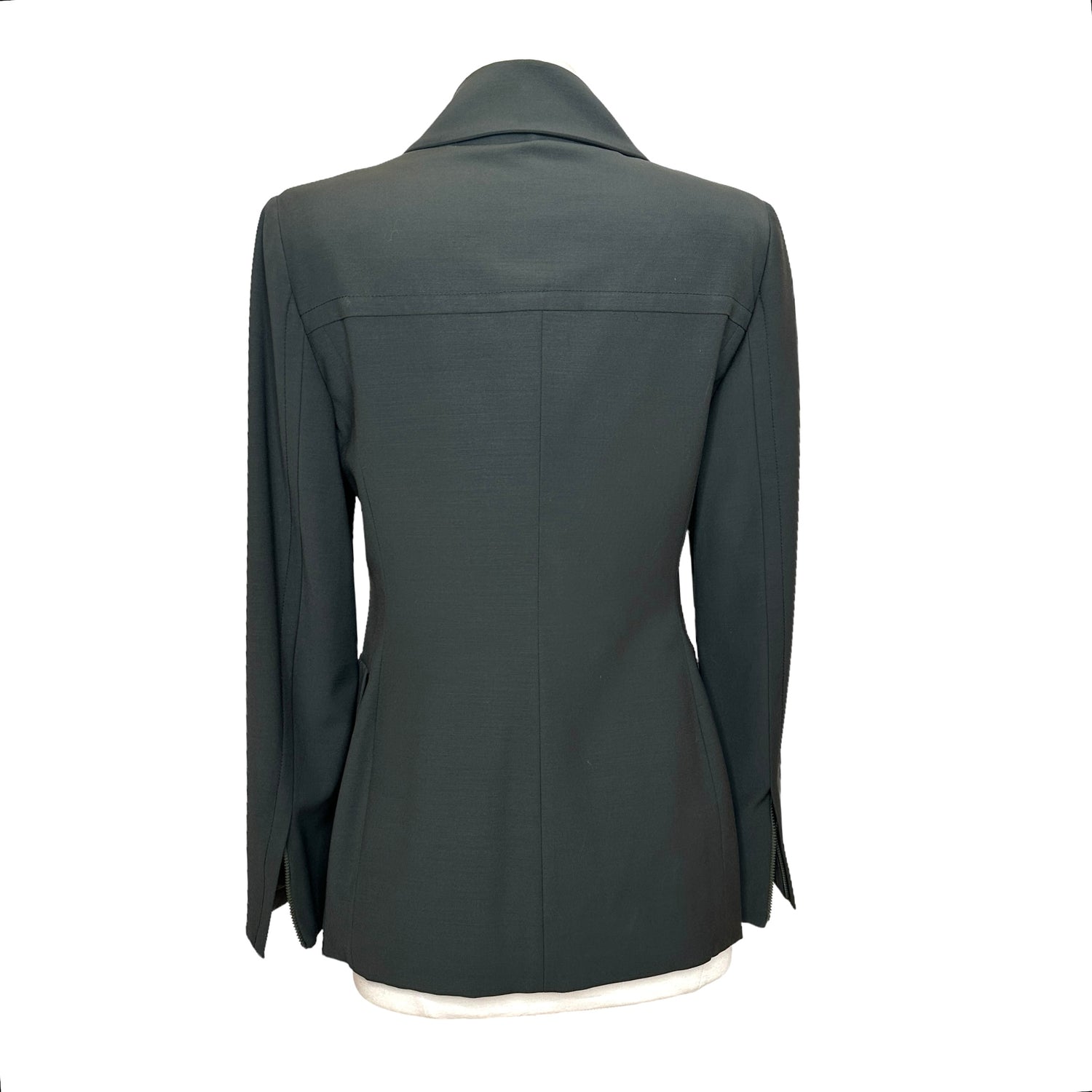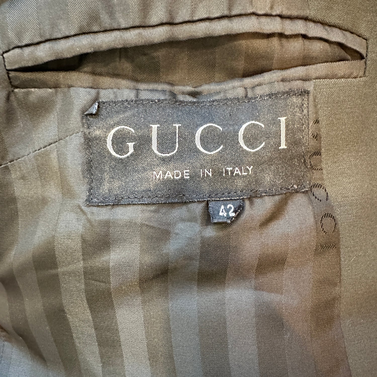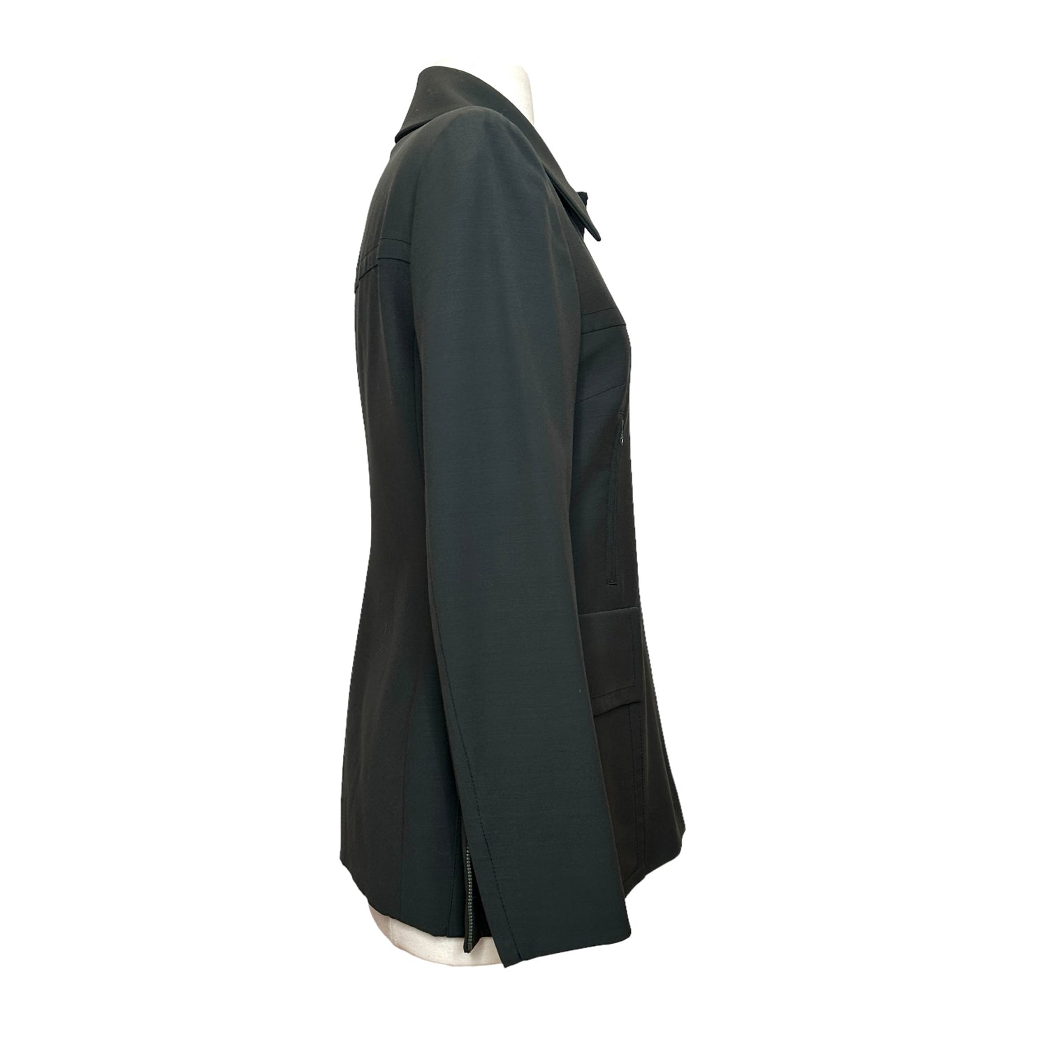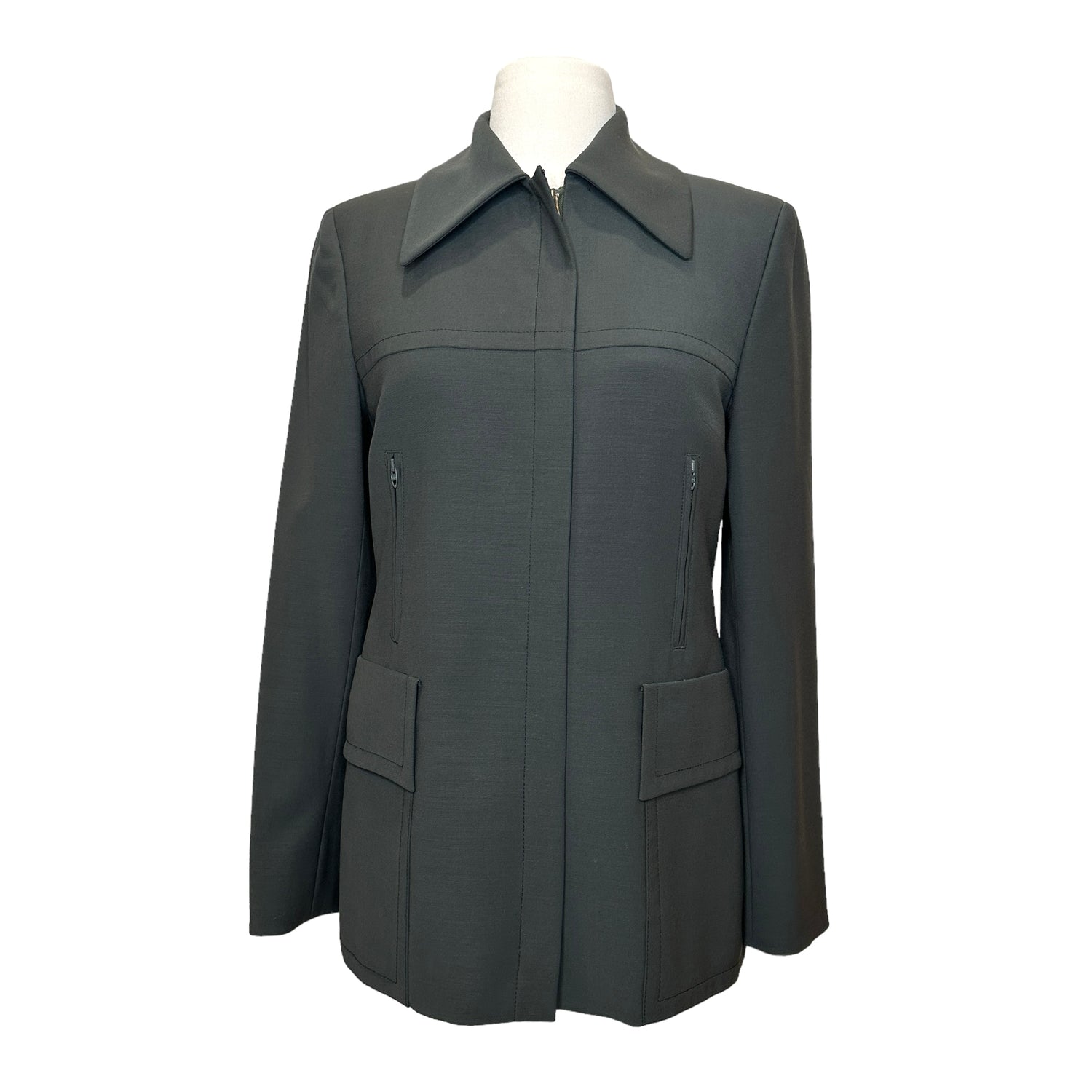 Gucci vintage dark kaki green blazer. From 1996 collection by Tom Ford. Zipper closure at front. Two flap pockets and two zipper pockets. Pointed collar. Designer size 42.