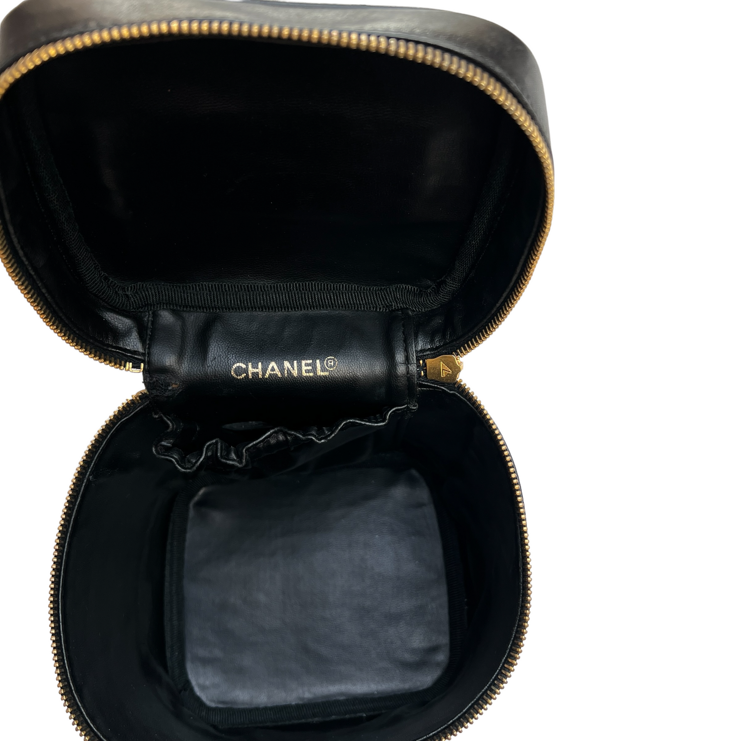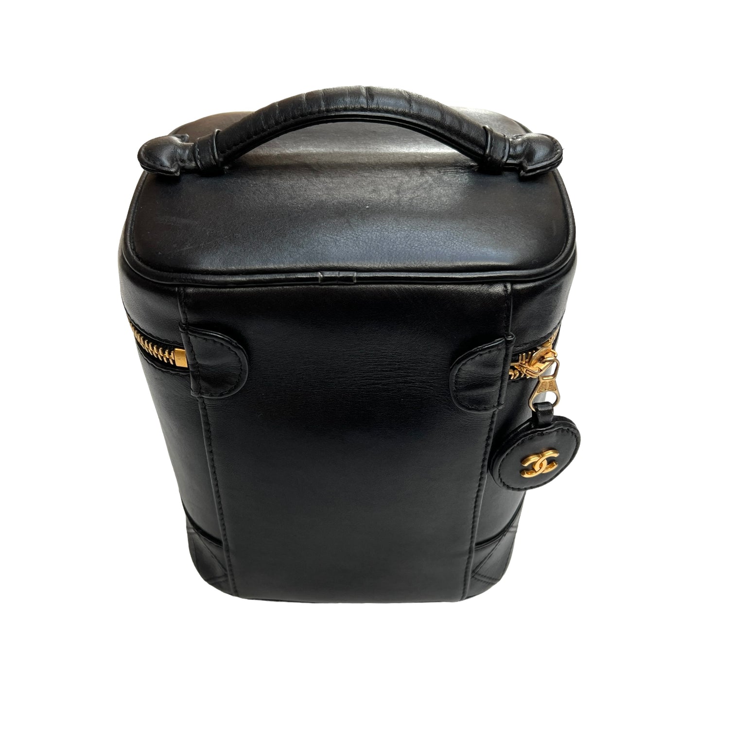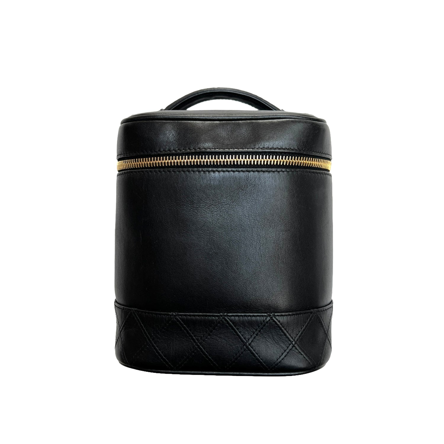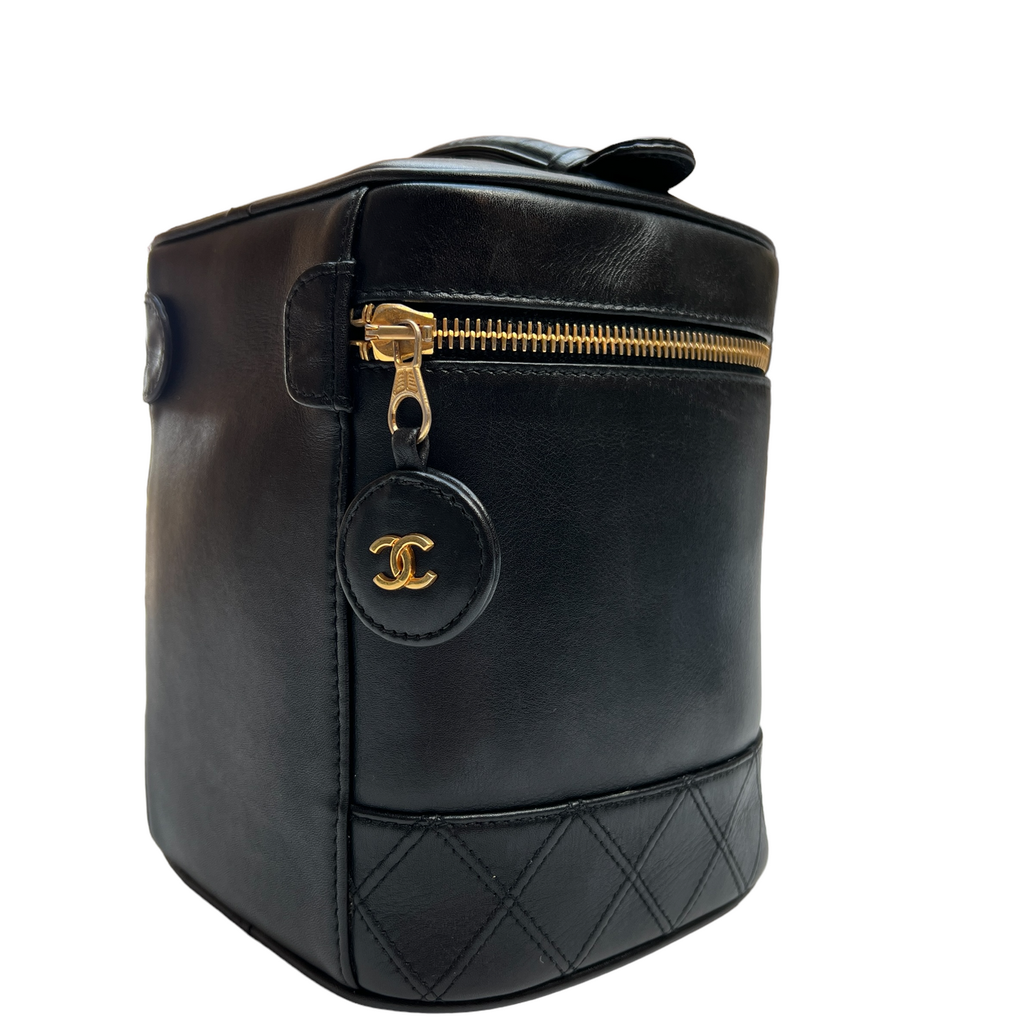 Chanel black leather vanity bag. Black smooth leather with Chanel iconic diamond quilted pattern at base. Gold-tone hardware. Zip around closure at top. CC gold-tone logo on the zipper. One elasticized inside pocket. Top handle. The perfect cosmetic bag!