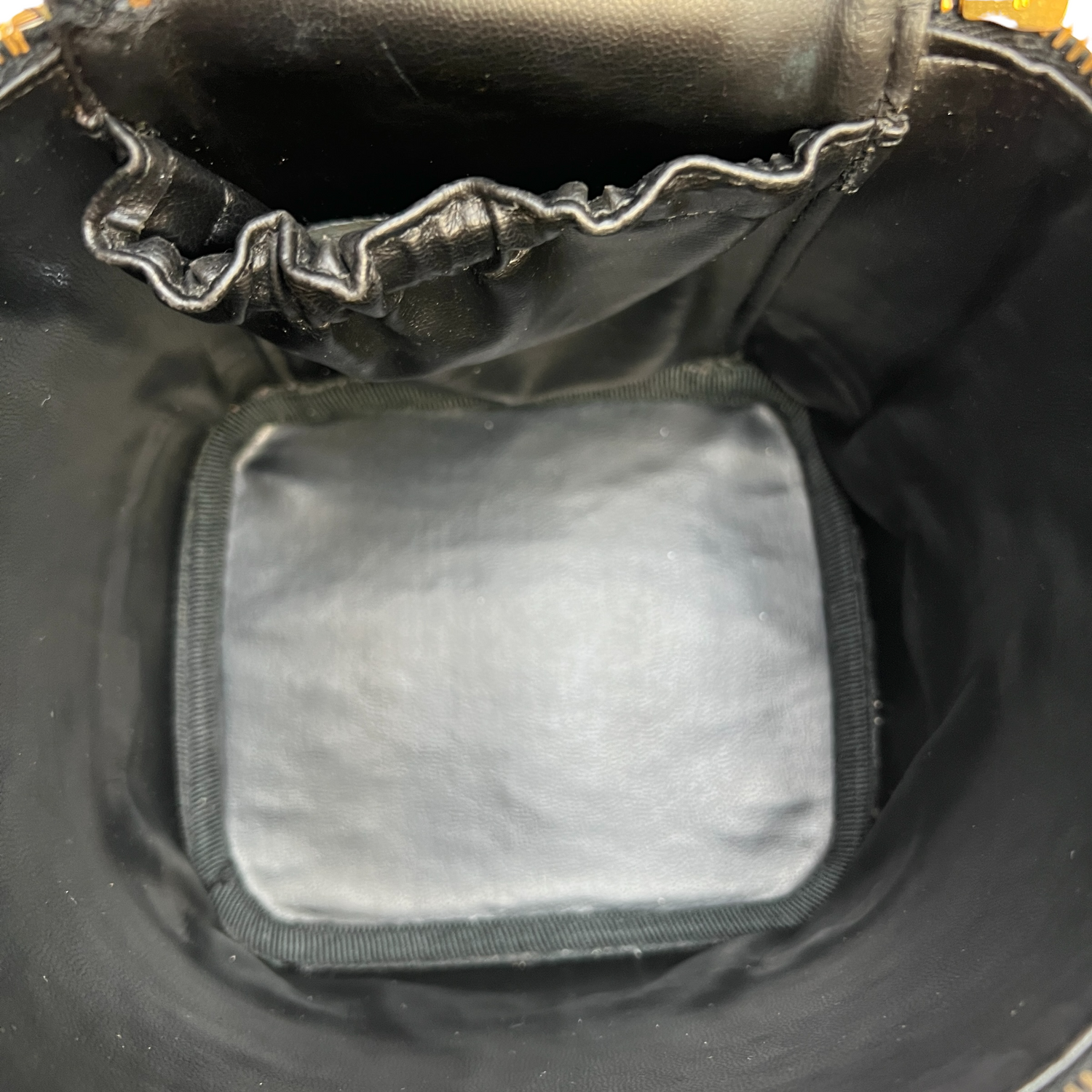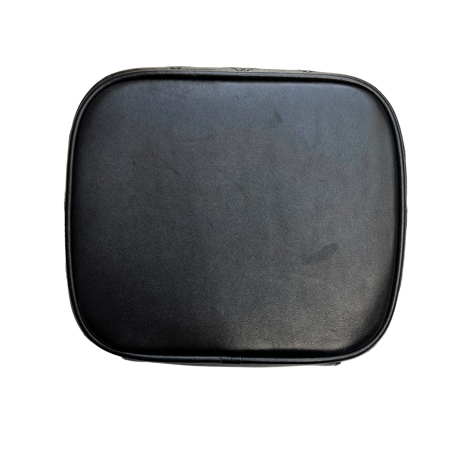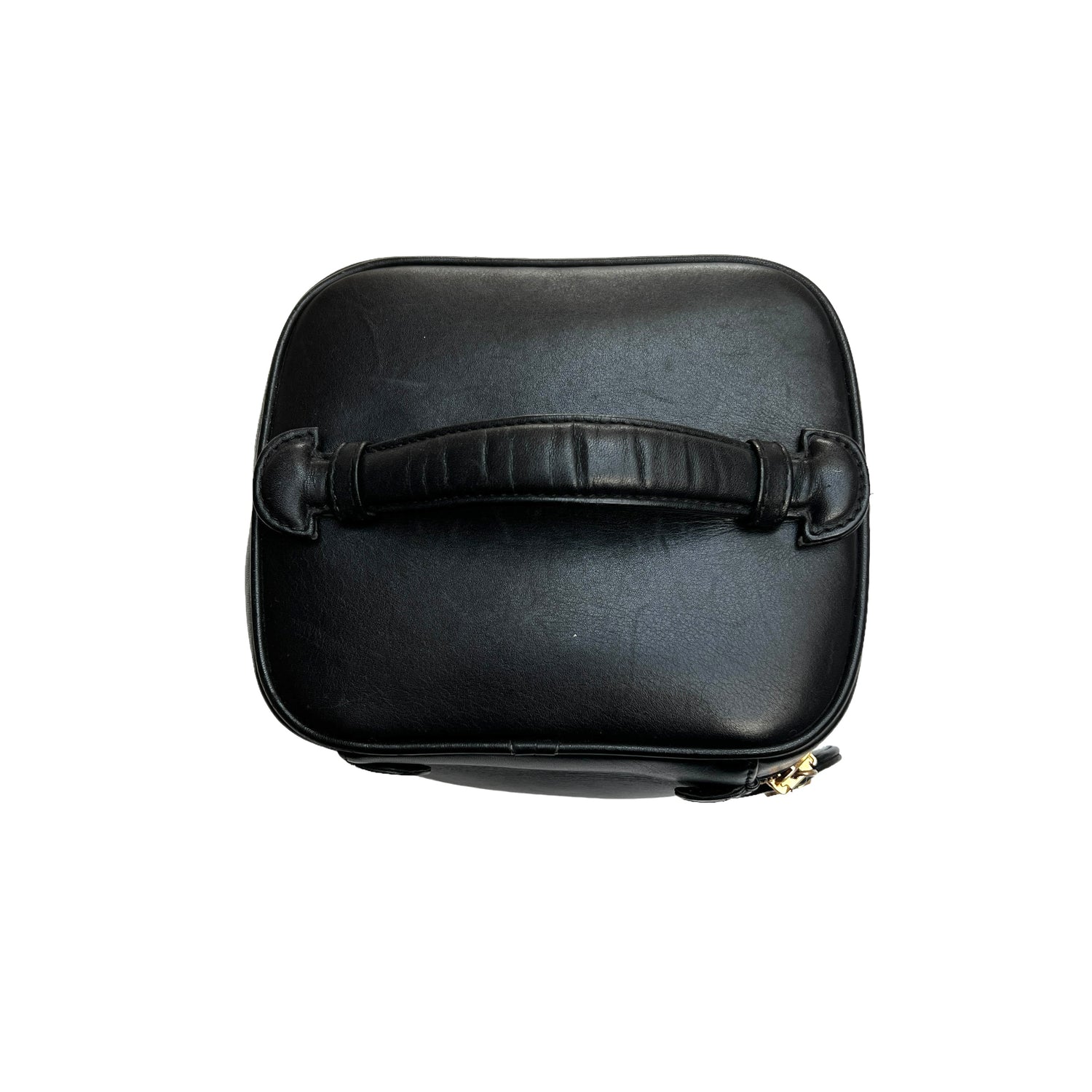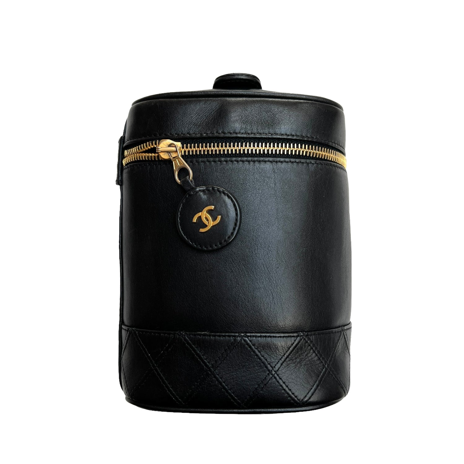 Chanel black leather vanity bag. Black smooth leather with Chanel iconic diamond quilted pattern at base. Gold-tone hardware. Zip around closure at top. CC gold-tone logo on the zipper. One elasticized inside pocket. Top handle. The perfect cosmetic bag!