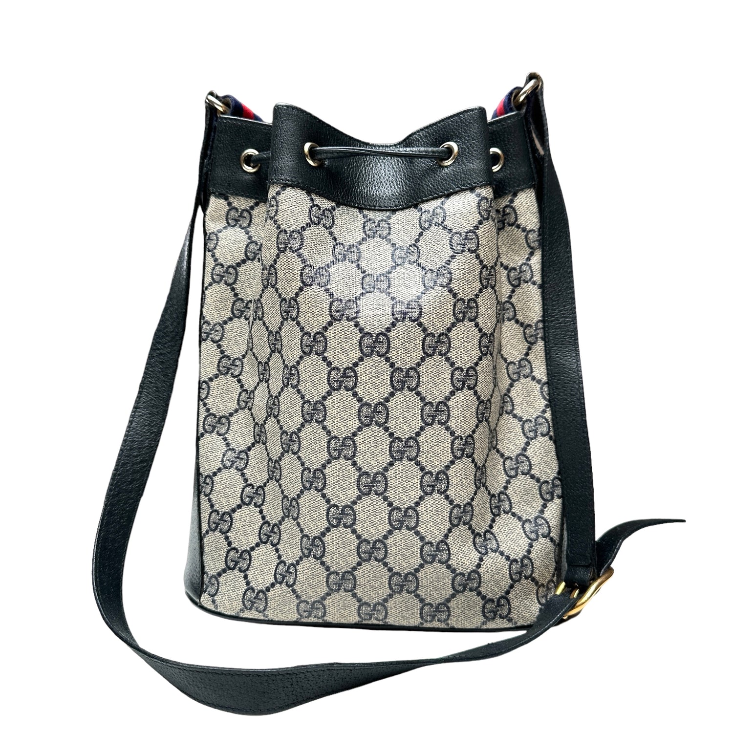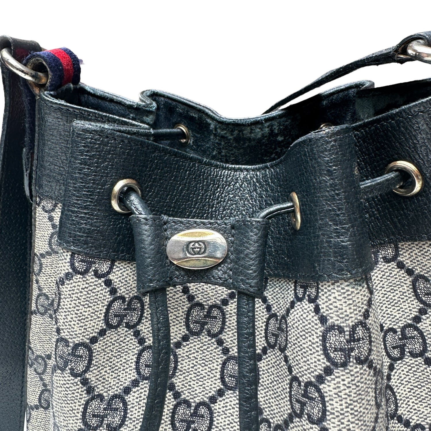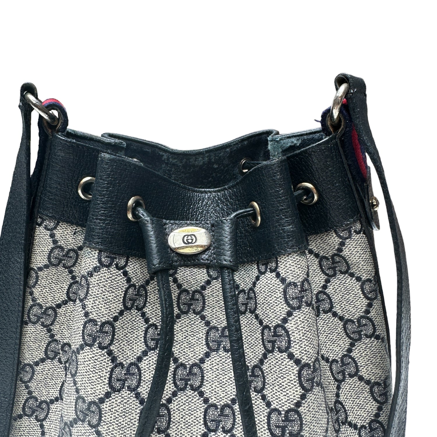 Gucci blue and cream monogram bucket bag. Blue leather. Red and blue canvas strips details. Drawstring closure at top.