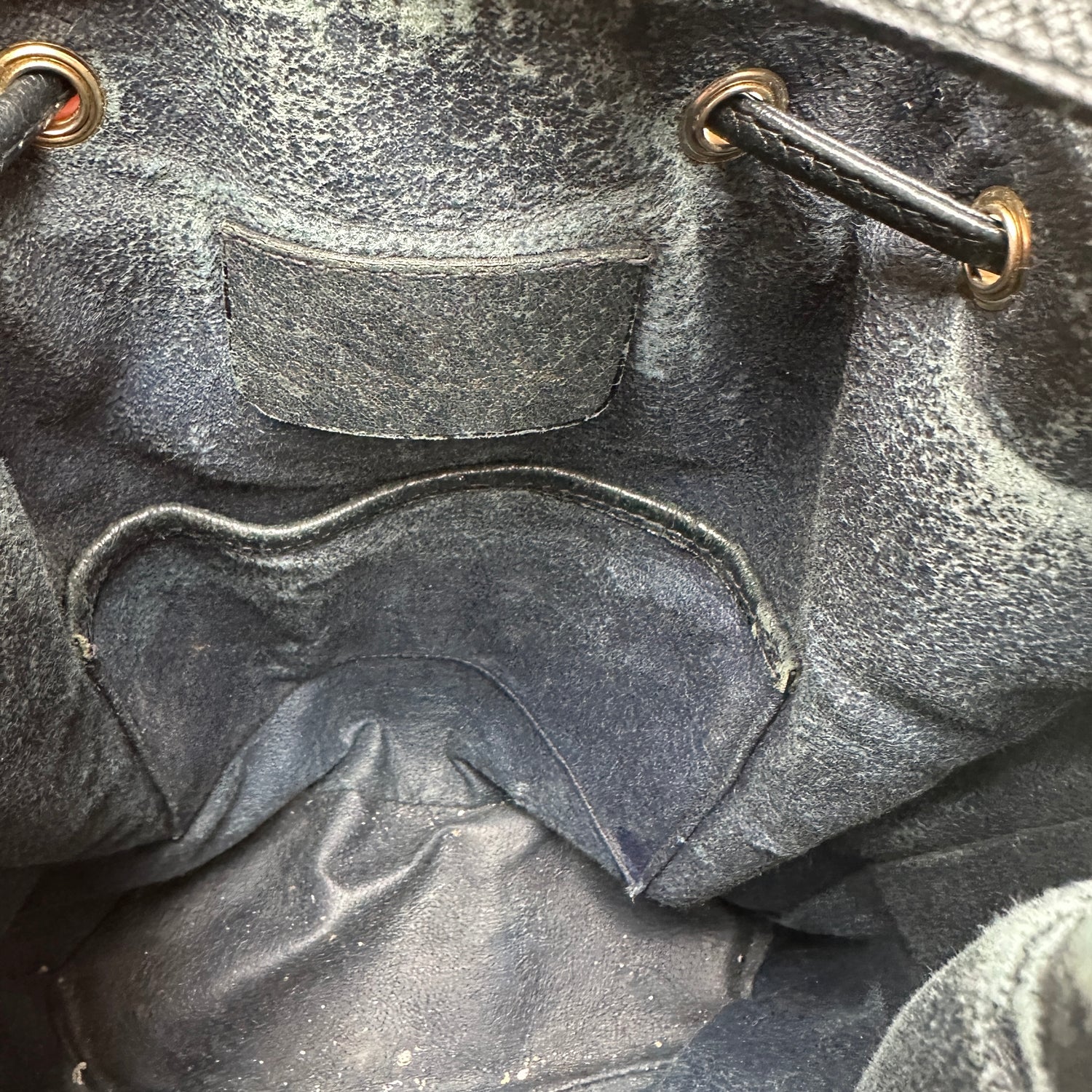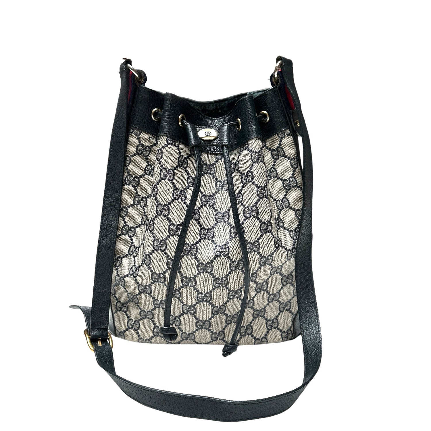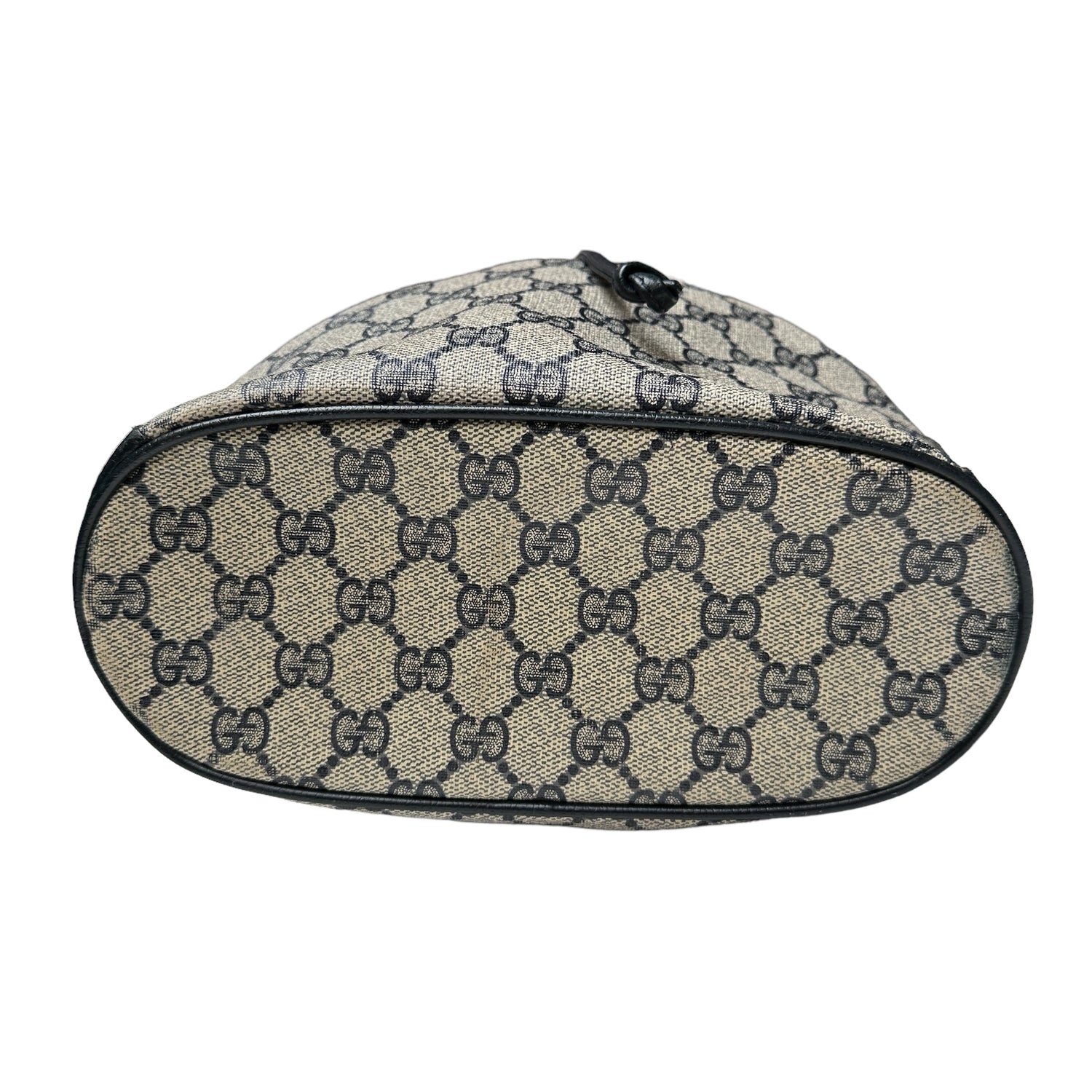 Gucci blue and cream monogram bucket bag. Blue leather. Red and blue canvas strips details. Drawstring closure at top.