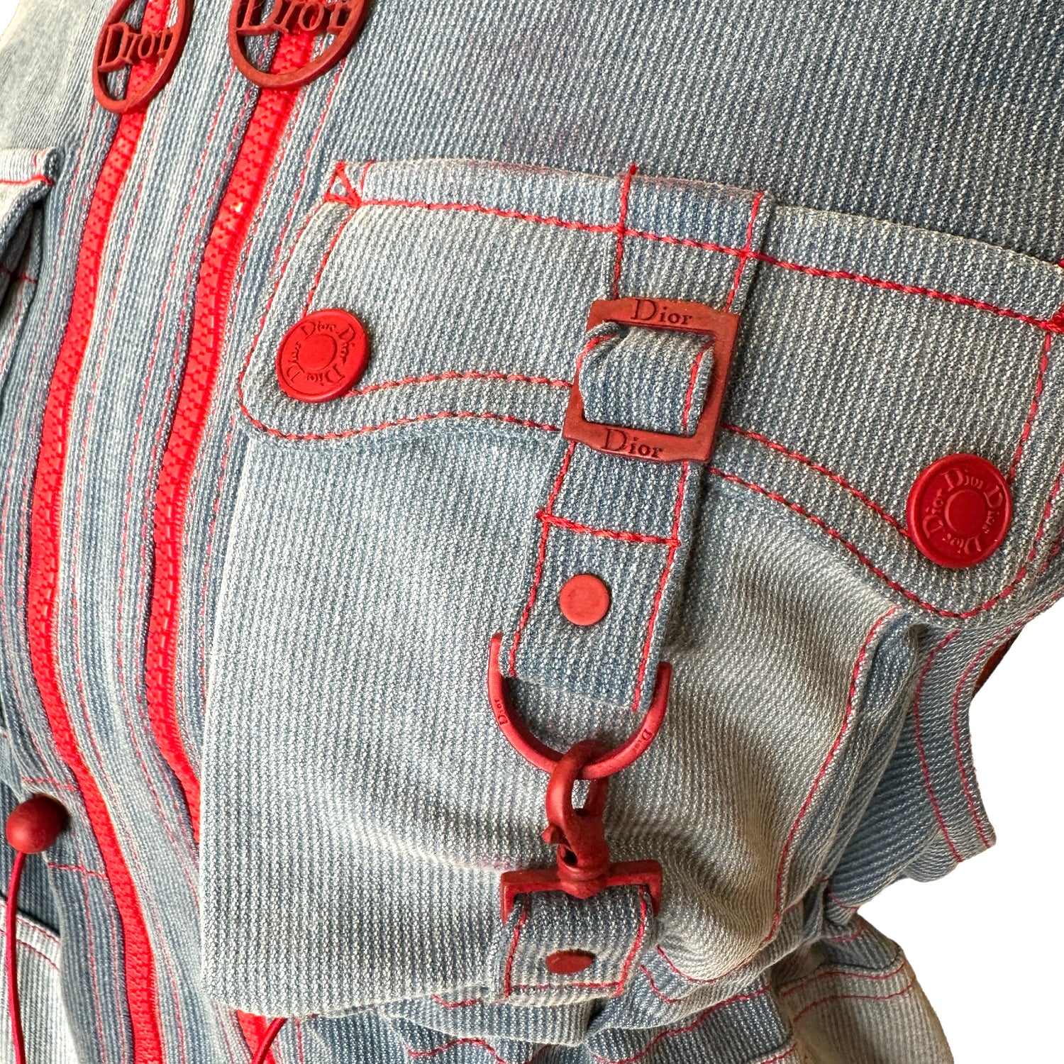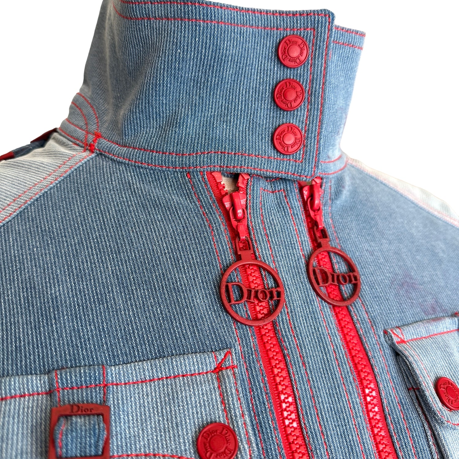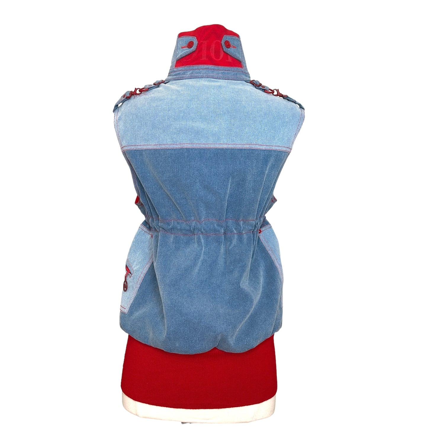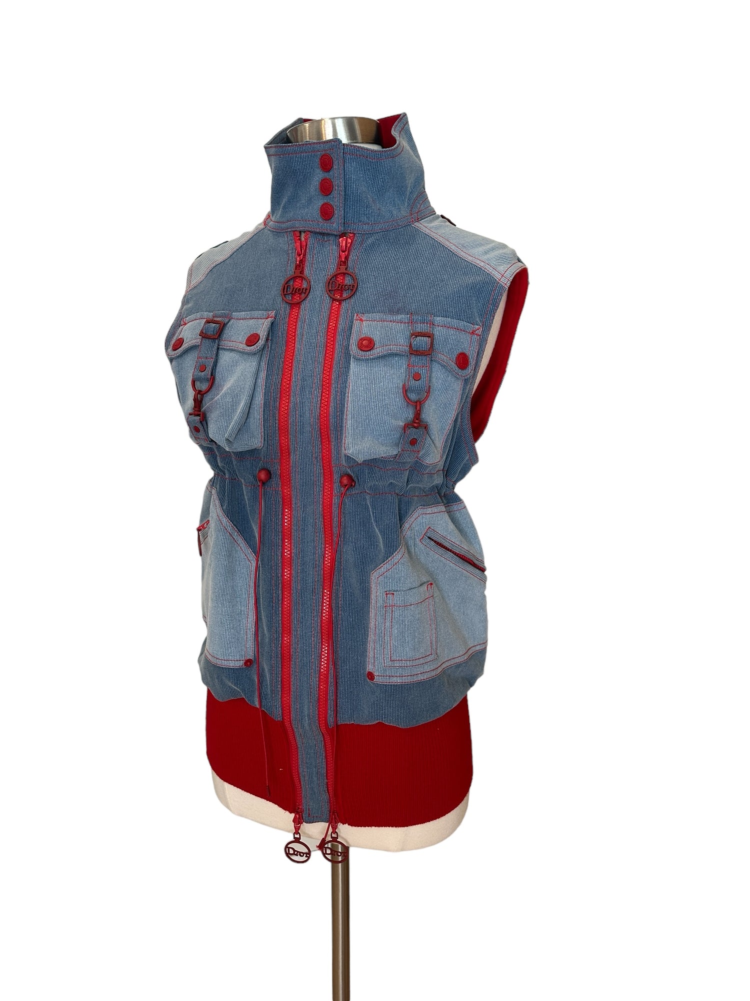 Christian Dior vintage vest. Iconic, from the Fall/Winter 2004 collection by John Galliano. Dior logos throughout. Blue denim and red trims. Stand alone collar. Large zipper pockets. Soft fleece lining. Designer size 38