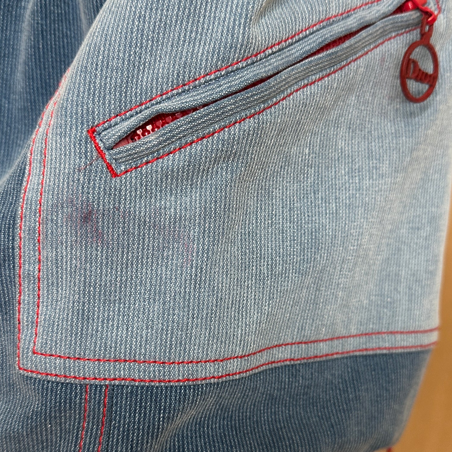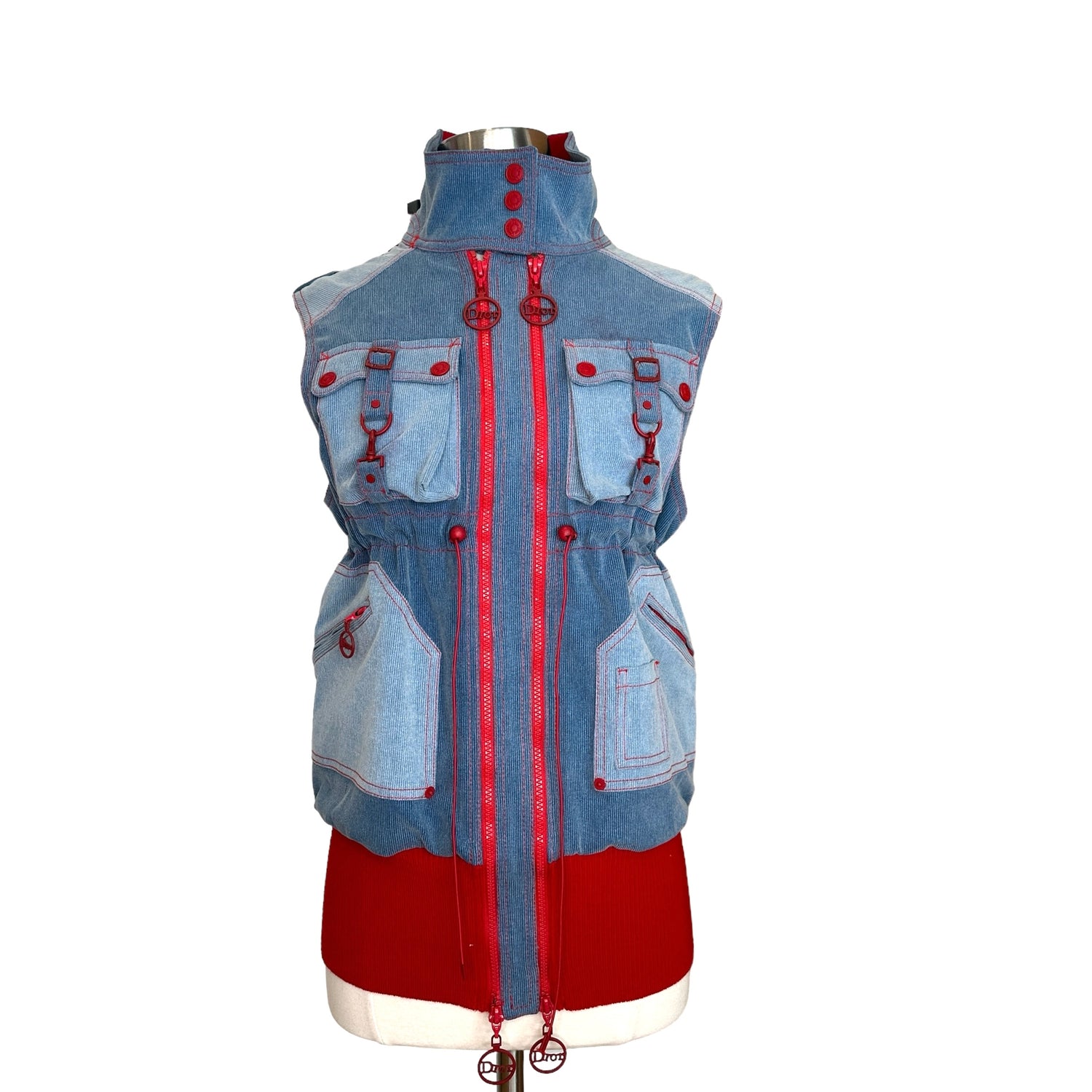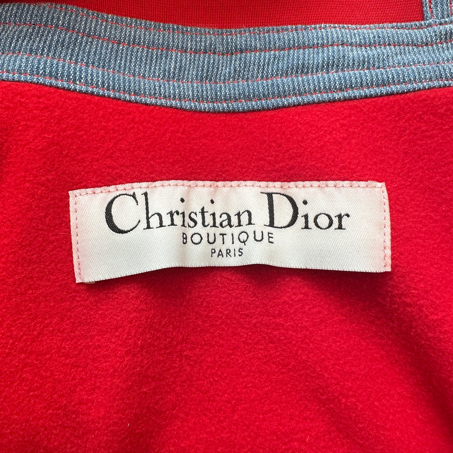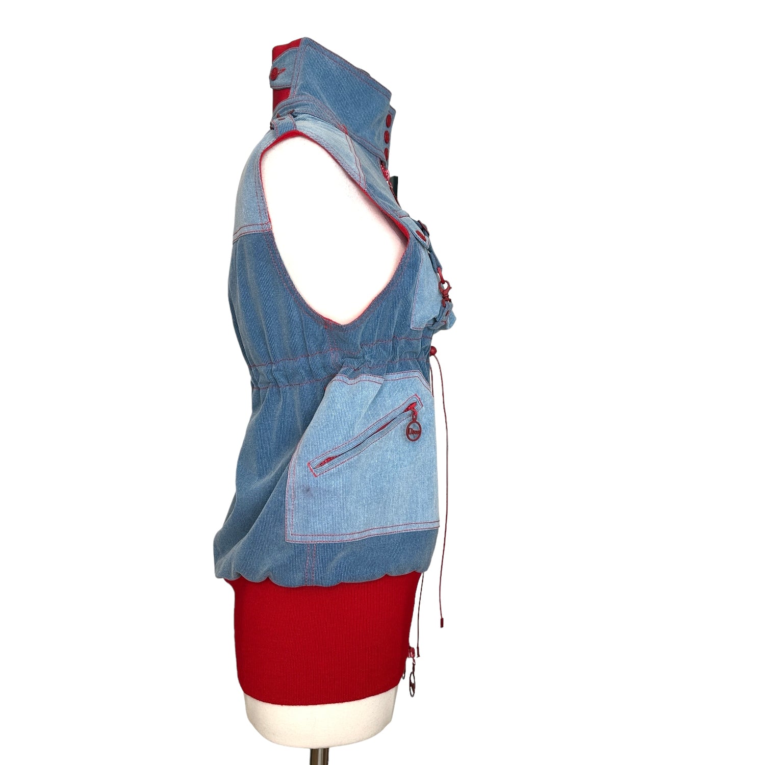 Christian Dior vintage vest. Iconic, from the Fall/Winter 2004 collection by John Galliano. Dior logos throughout. Blue denim and red trims. Stand alone collar. Large zipper pockets. Soft fleece lining. Designer size 38