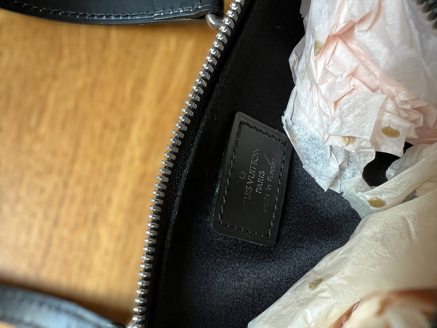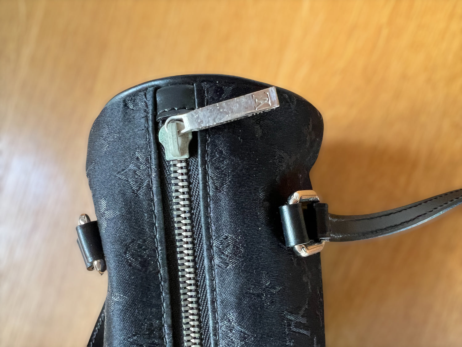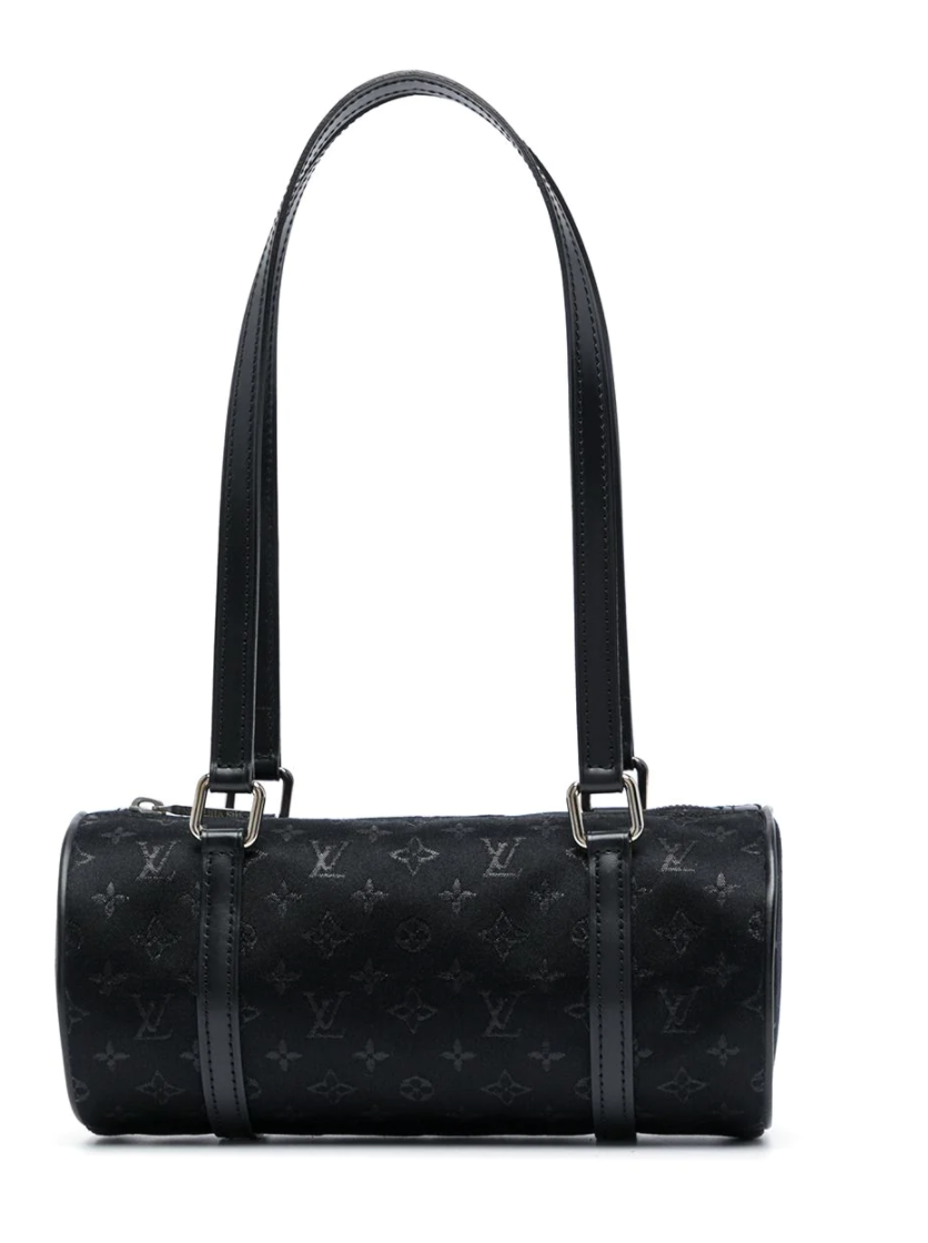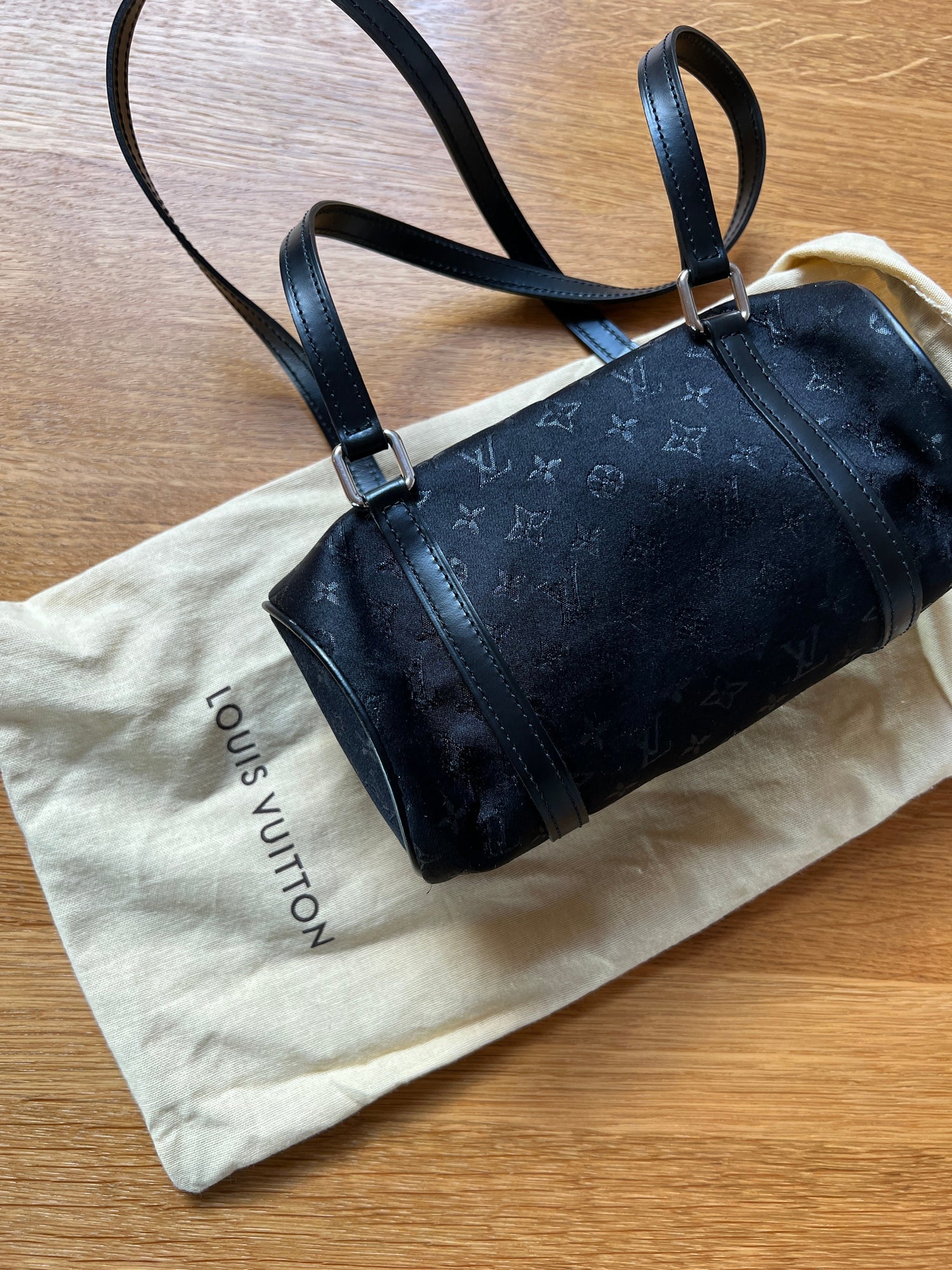 Details: Satin 100%, Leather 100%, true black, satin/leather, monogram pattern, top zip fastening, two long top handles, internal logo patch, full lining, silver-tone hardware, barrel body