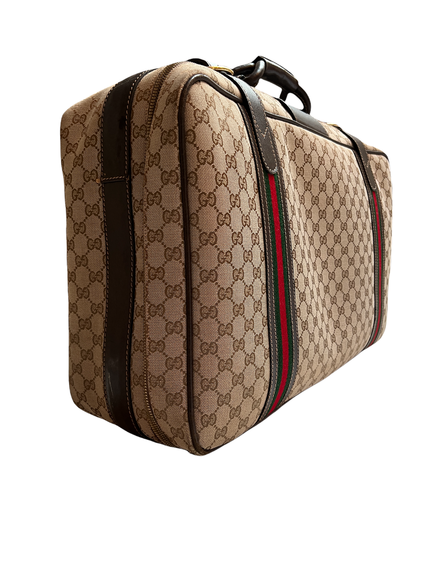 This is a vintage piece of Gucci luggage. Snap Closure and Double Belts. Two leather belts inside to keep clothing neat and together. Canvas monogram and iconic Gucci red stripes in fabric.