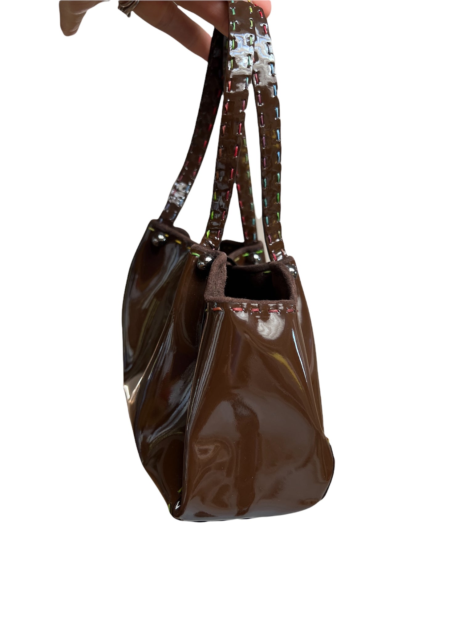 Brown Patent Leather. Zip pocket inside with double compartments. Multicolor stitches. Brown Suede Lining.