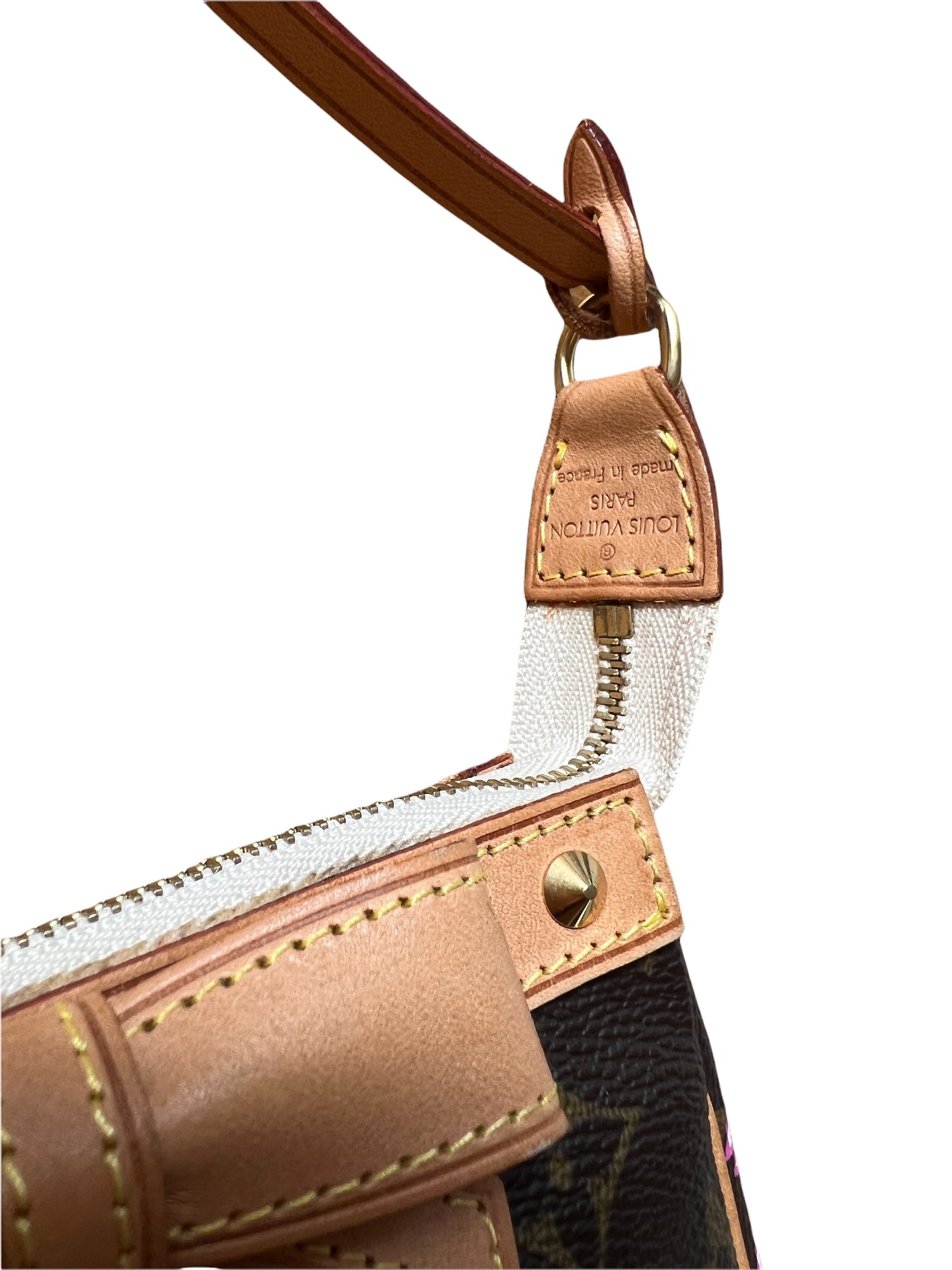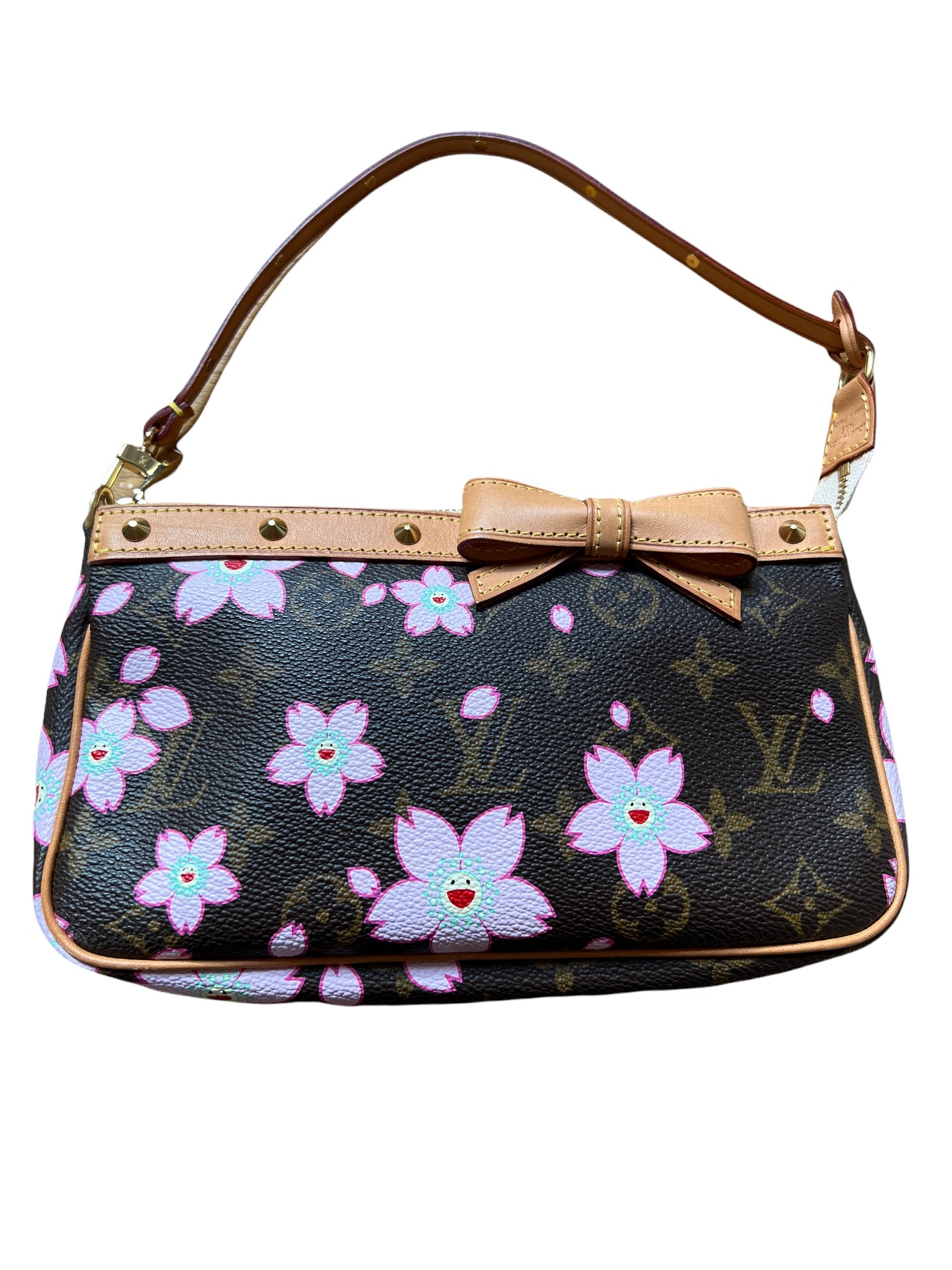 LV lovely pochette. Murakami Design. This is so cute and IN! Gorgeous brown monogram pink cherry blossoms canvas pochette featuring leather trim with brass spike details on handle and trim, a leather bow detail and brass zipper closure with beige microfiber interior.