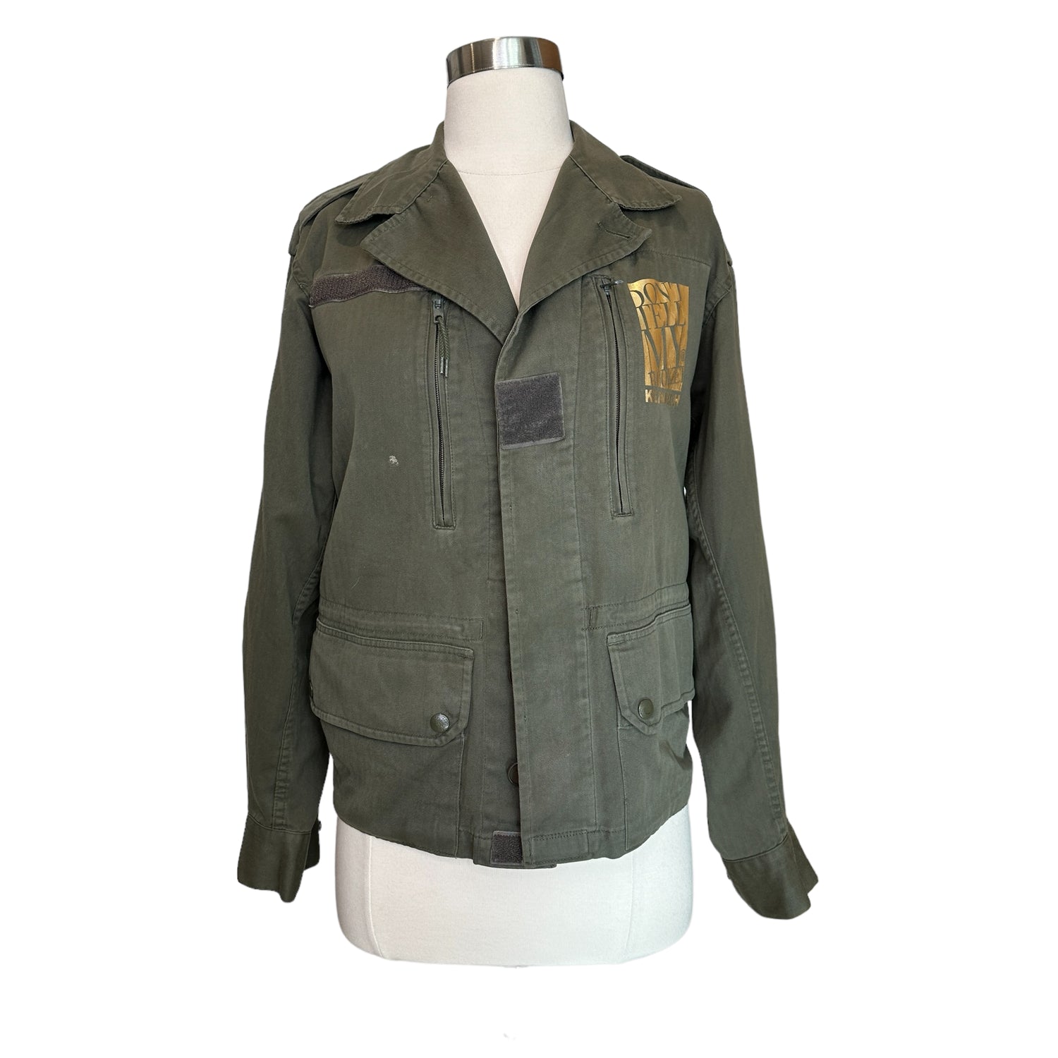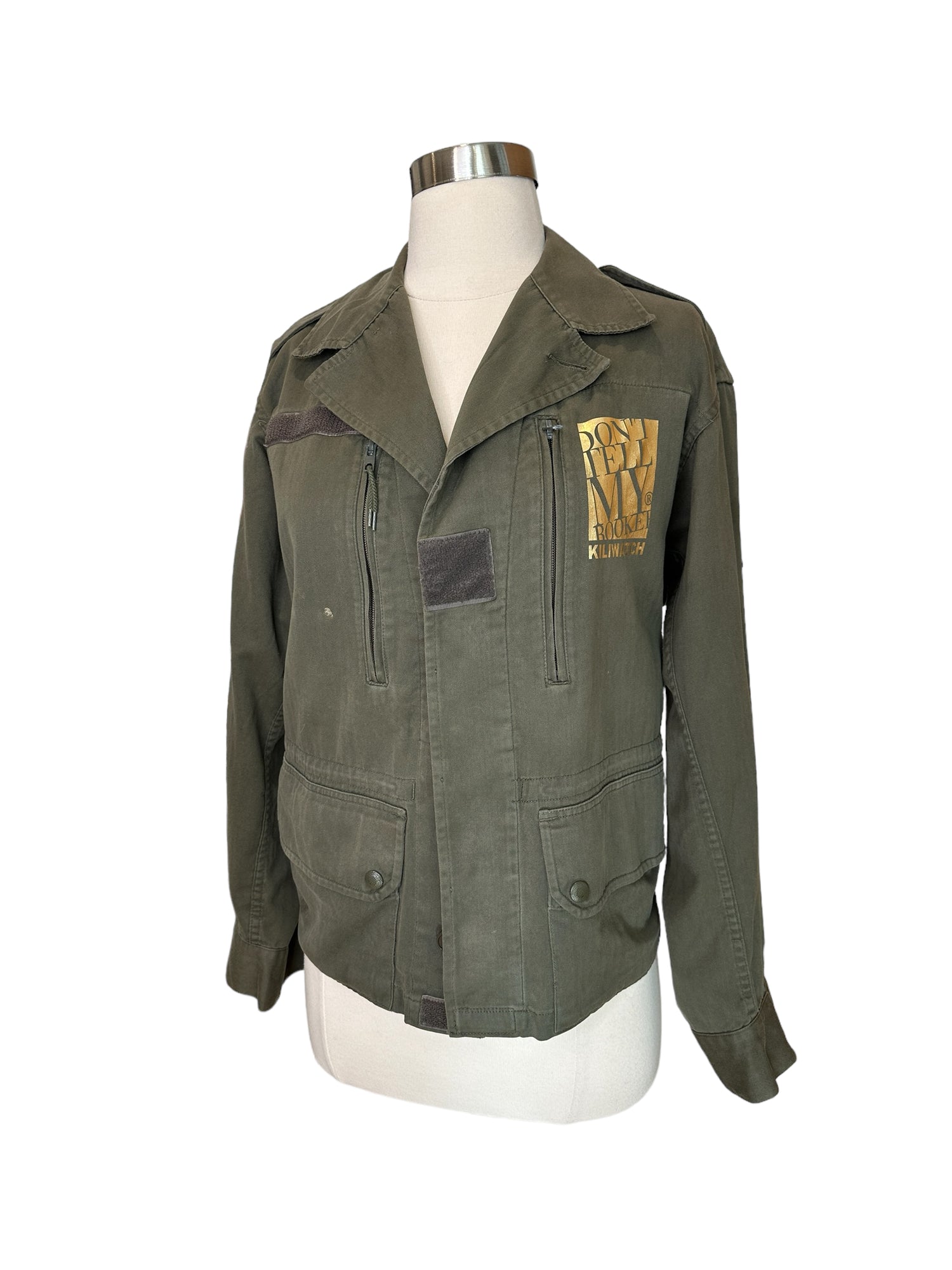 Vintage 2008 Kiliwatch utility jacket. Kaki with "don't tell my booker" gold logo at front. Paris vintage store collaboration with nightlife former event producers.