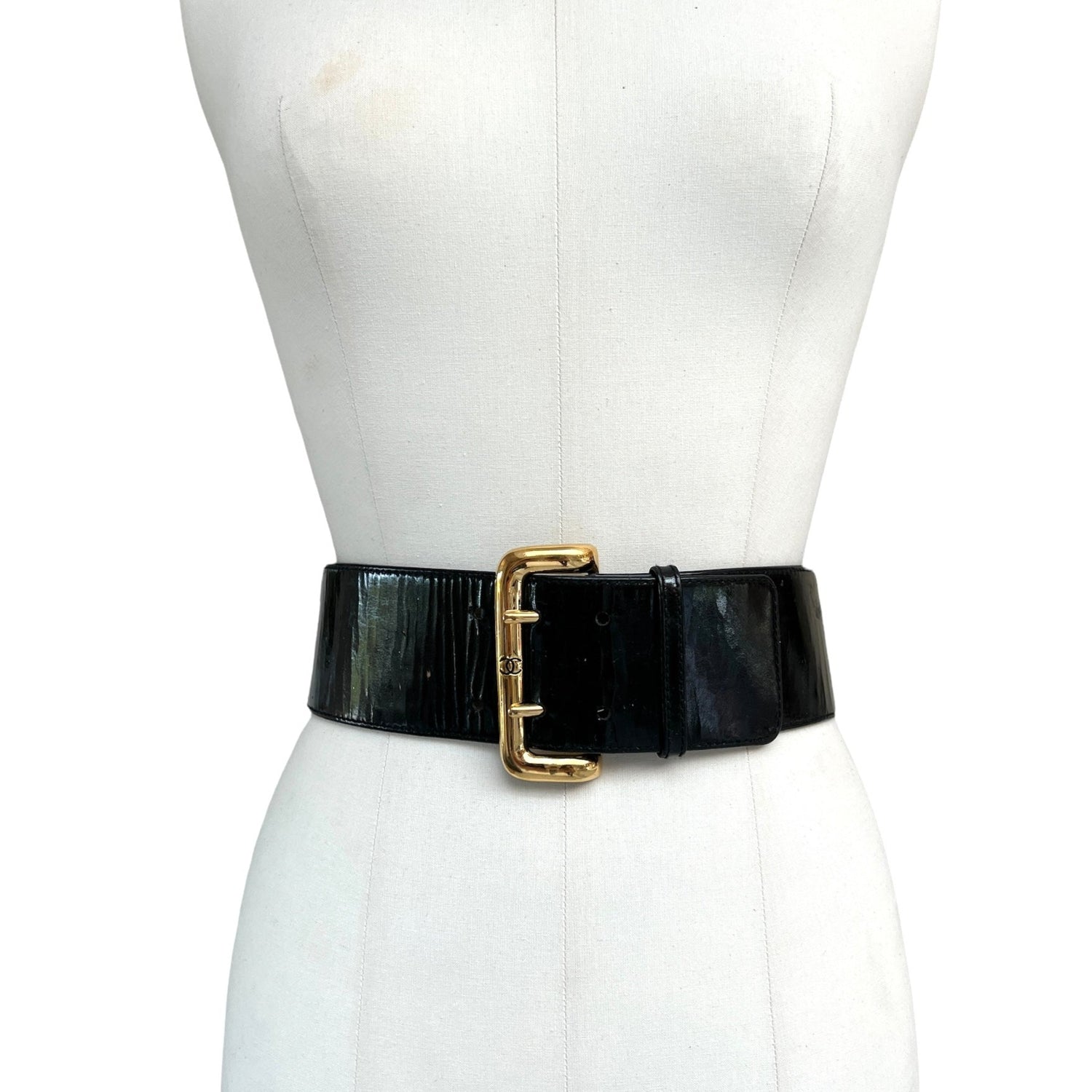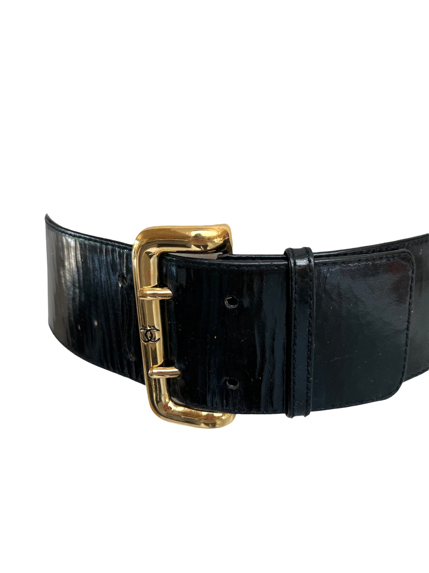 Black leather patent vintage belt from Chanel. Gold tone hardware. Interlocking CC logo at buckle. Three size holes options.