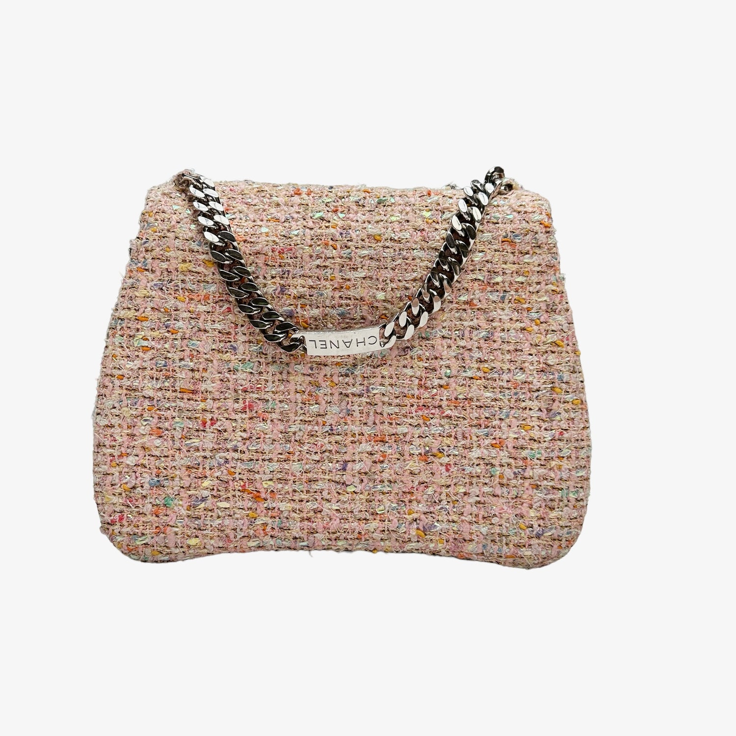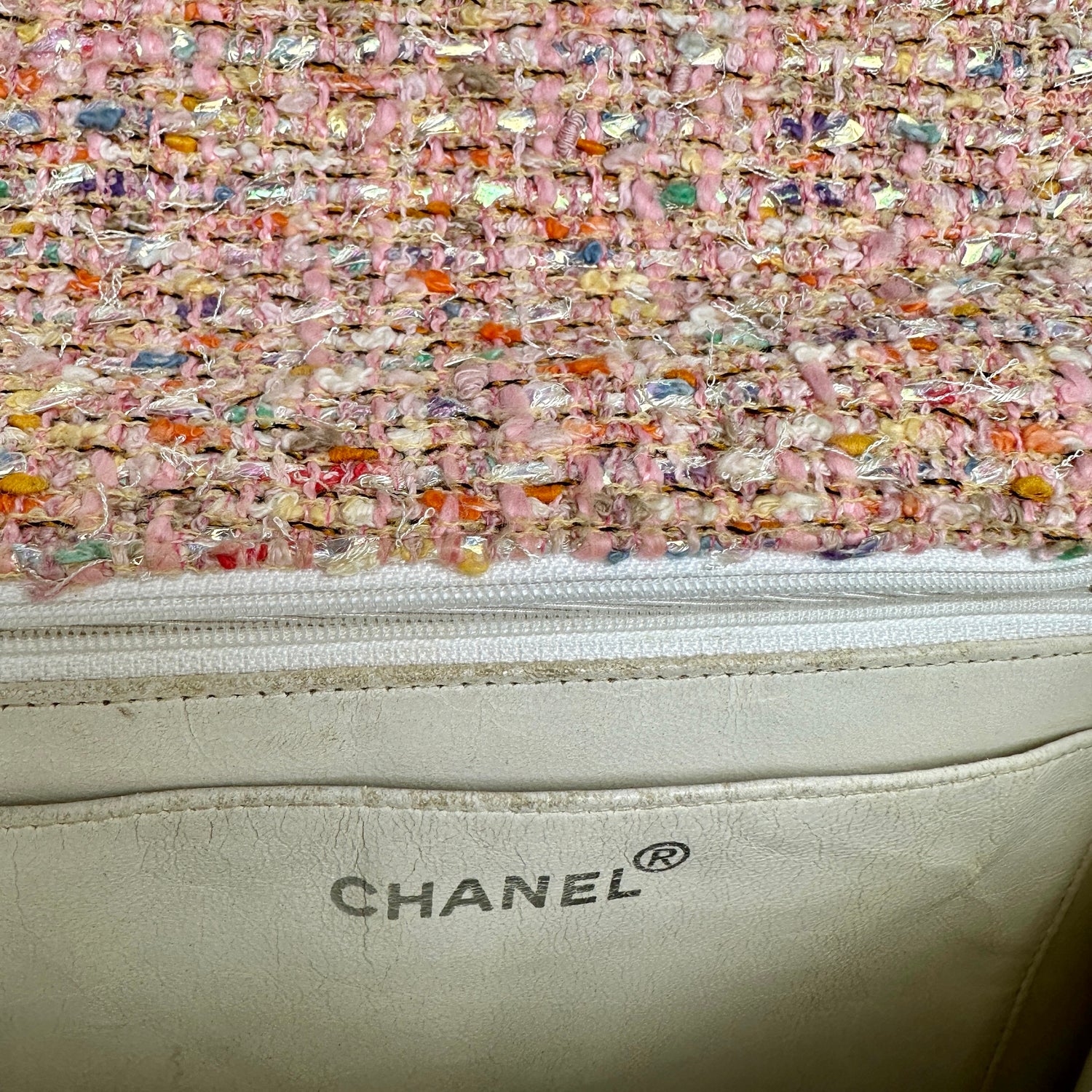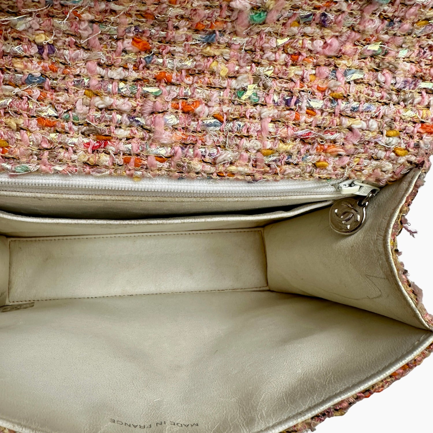 Chanel vintage tweed and leather bracelet bag. Silver-tone hardware. Bracelet-like handle with Chanel logo on top. Magnetic flap closure on top. White leather lining. One zipper interior pockets. Silver leather CC logo at front.