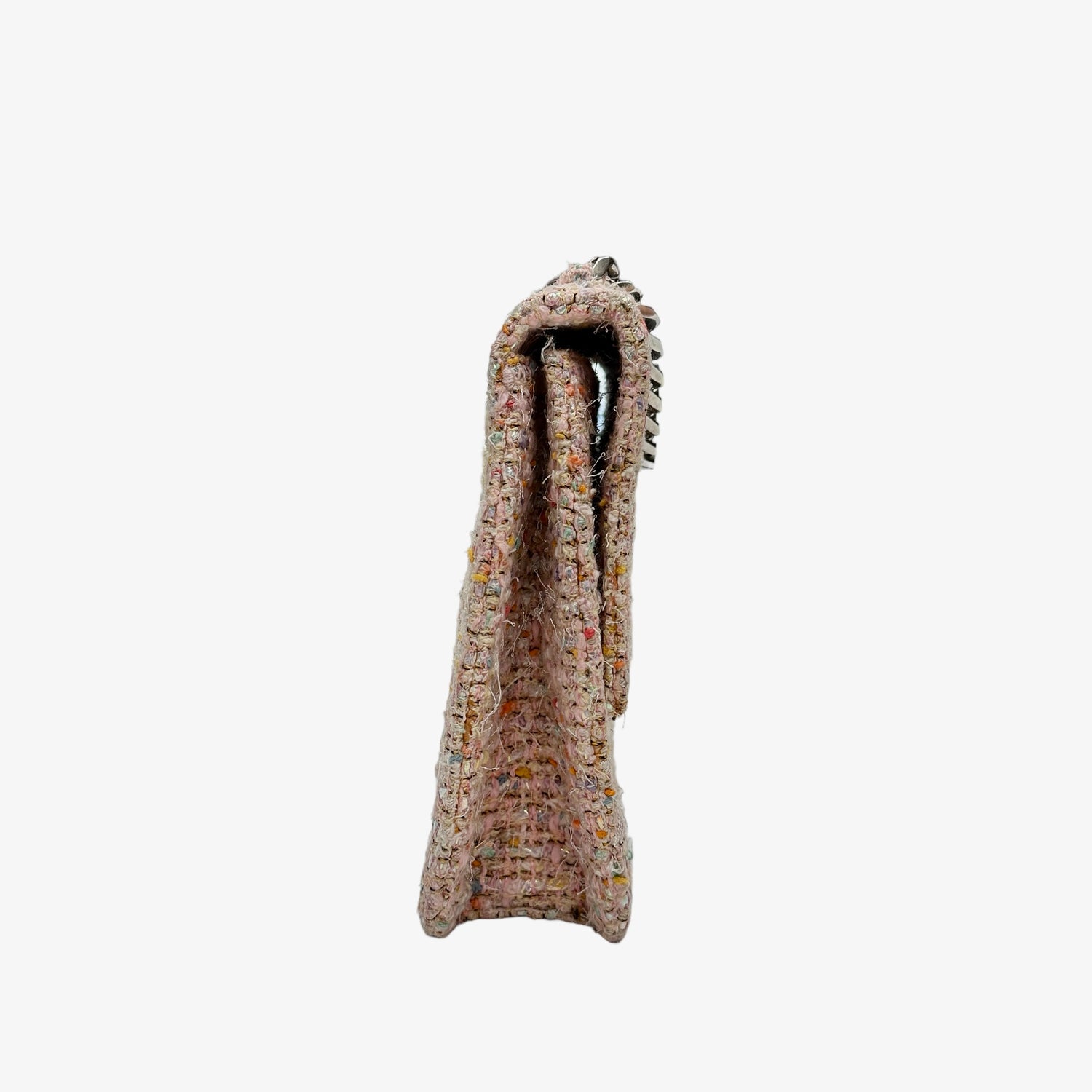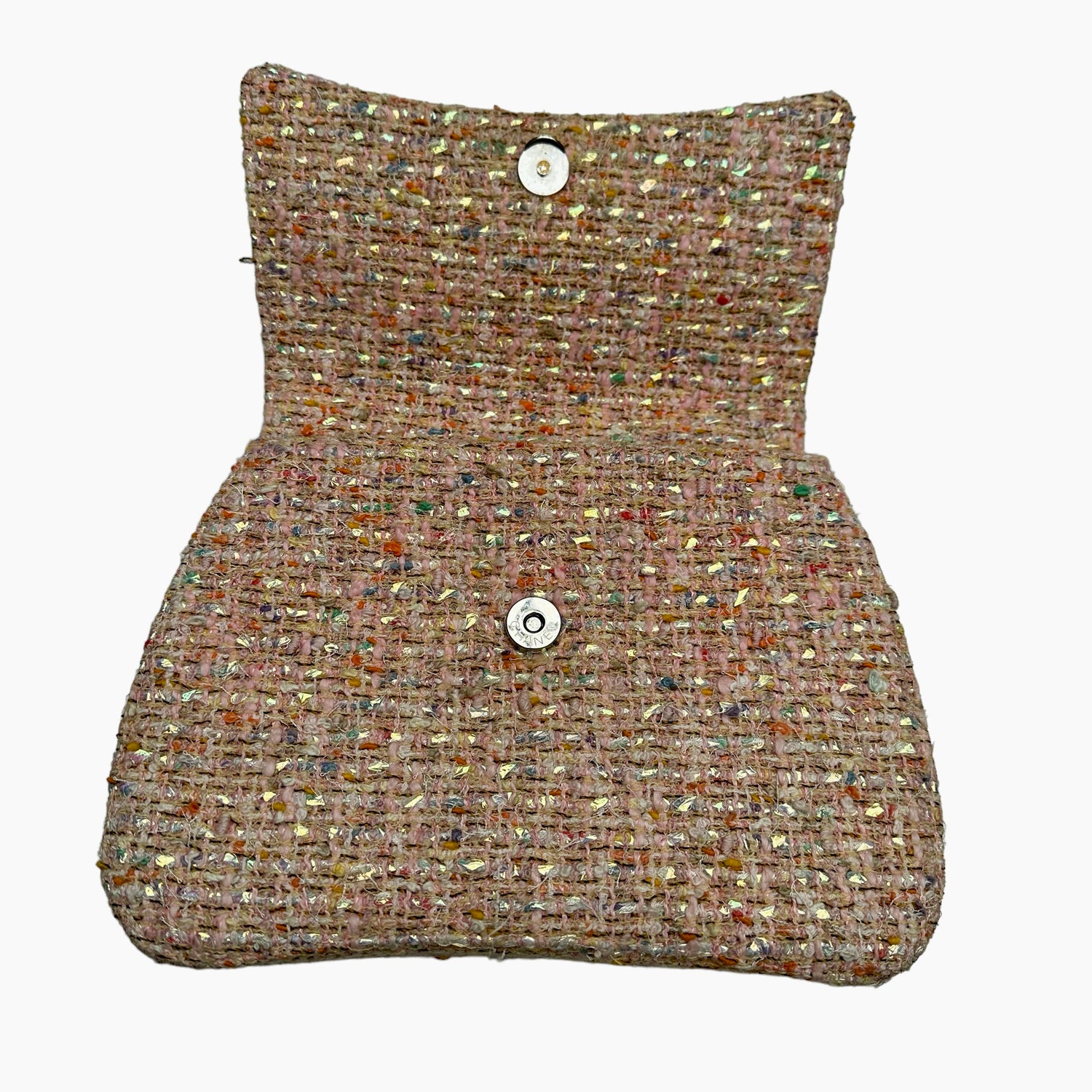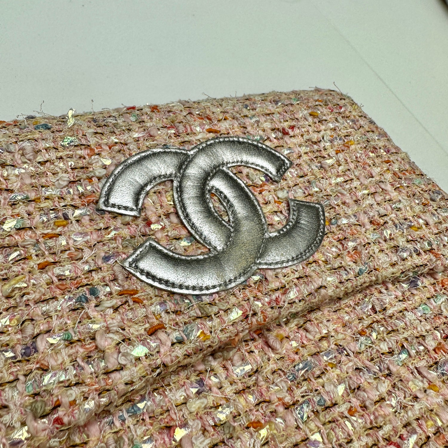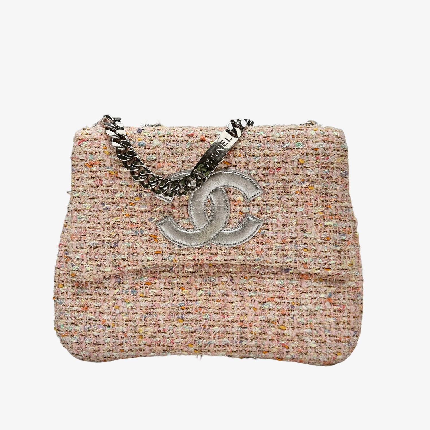 Chanel vintage tweed and leather bracelet bag. Silver-tone hardware. Bracelet-like handle with Chanel logo on top. Magnetic flap closure on top. White leather lining. One zipper interior pockets. Silver leather CC logo at front.