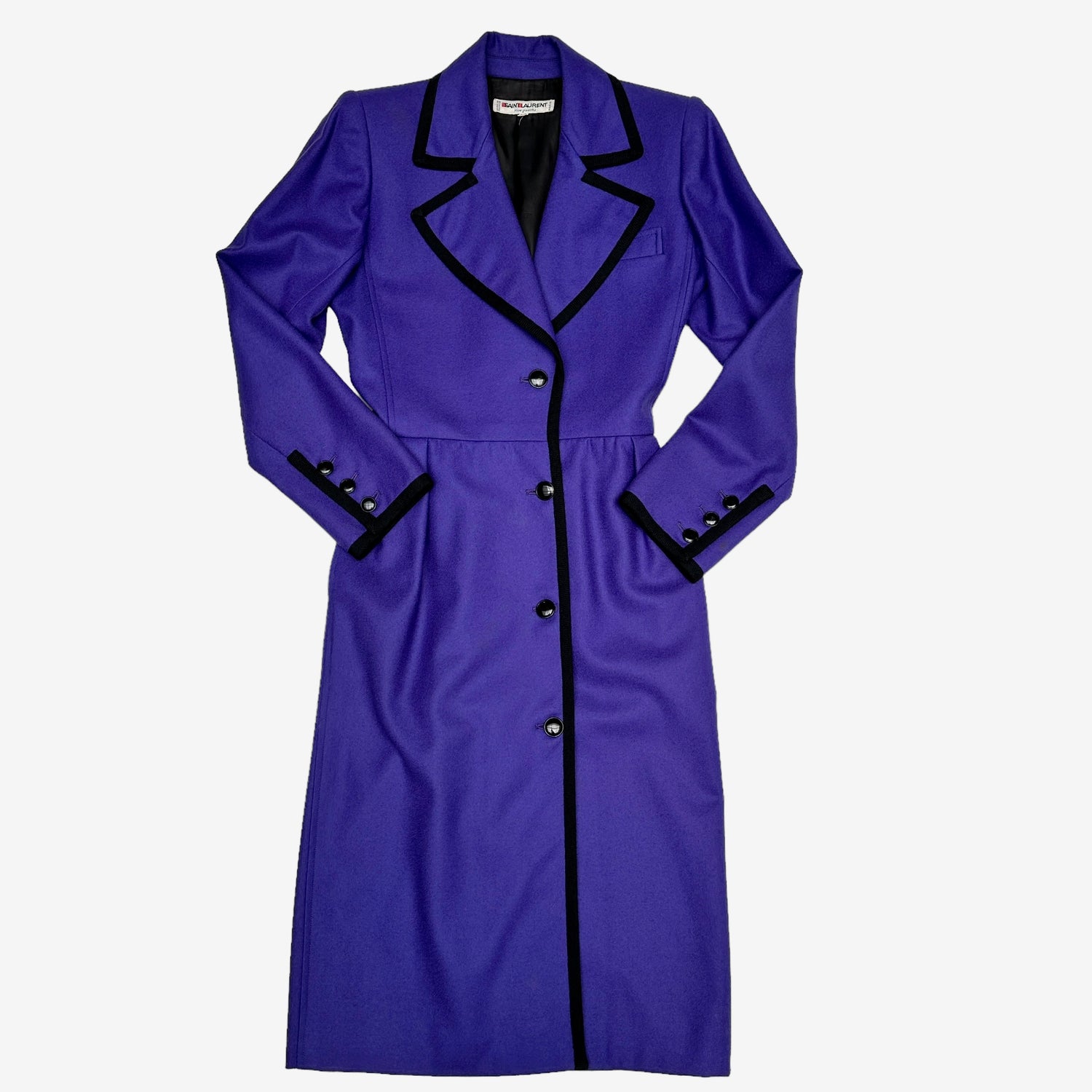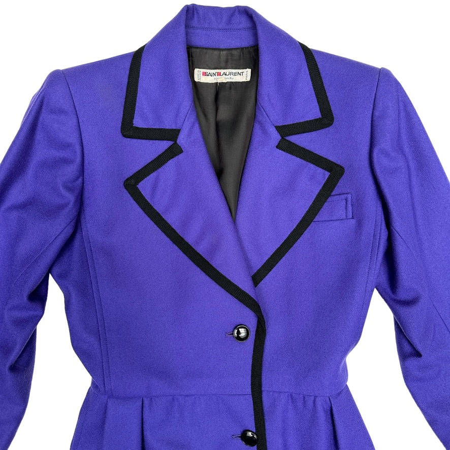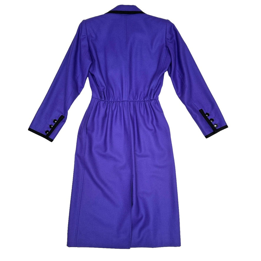 Yves Saint Laurent vintage purple coat. Long coat with pointed collar. Purple body with black trims. Button closure at front. Two pockets. Designer size 38.