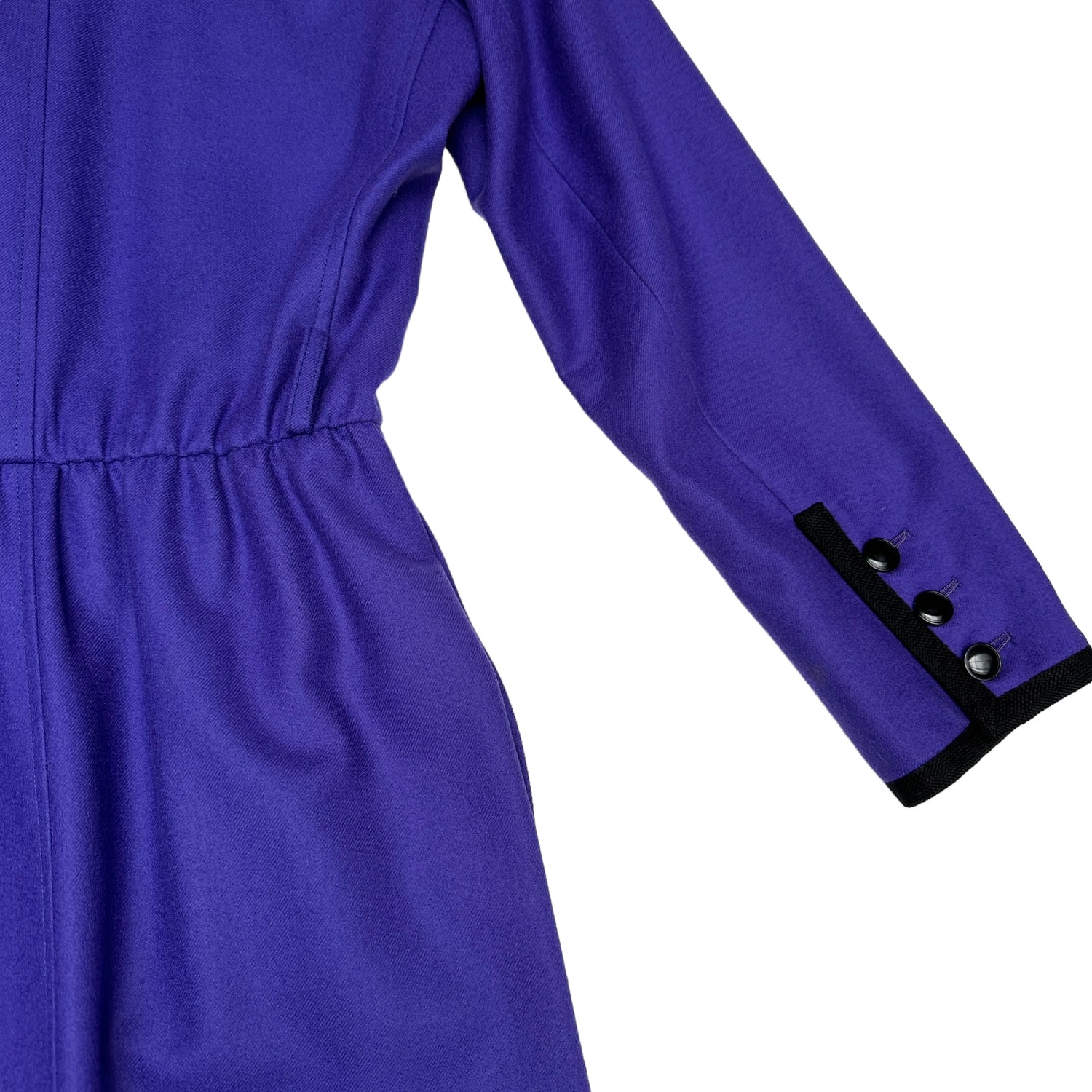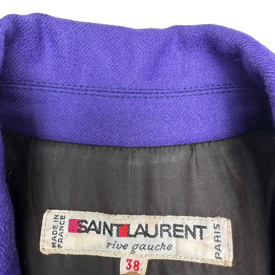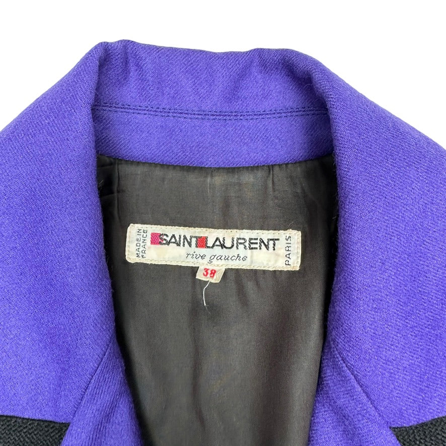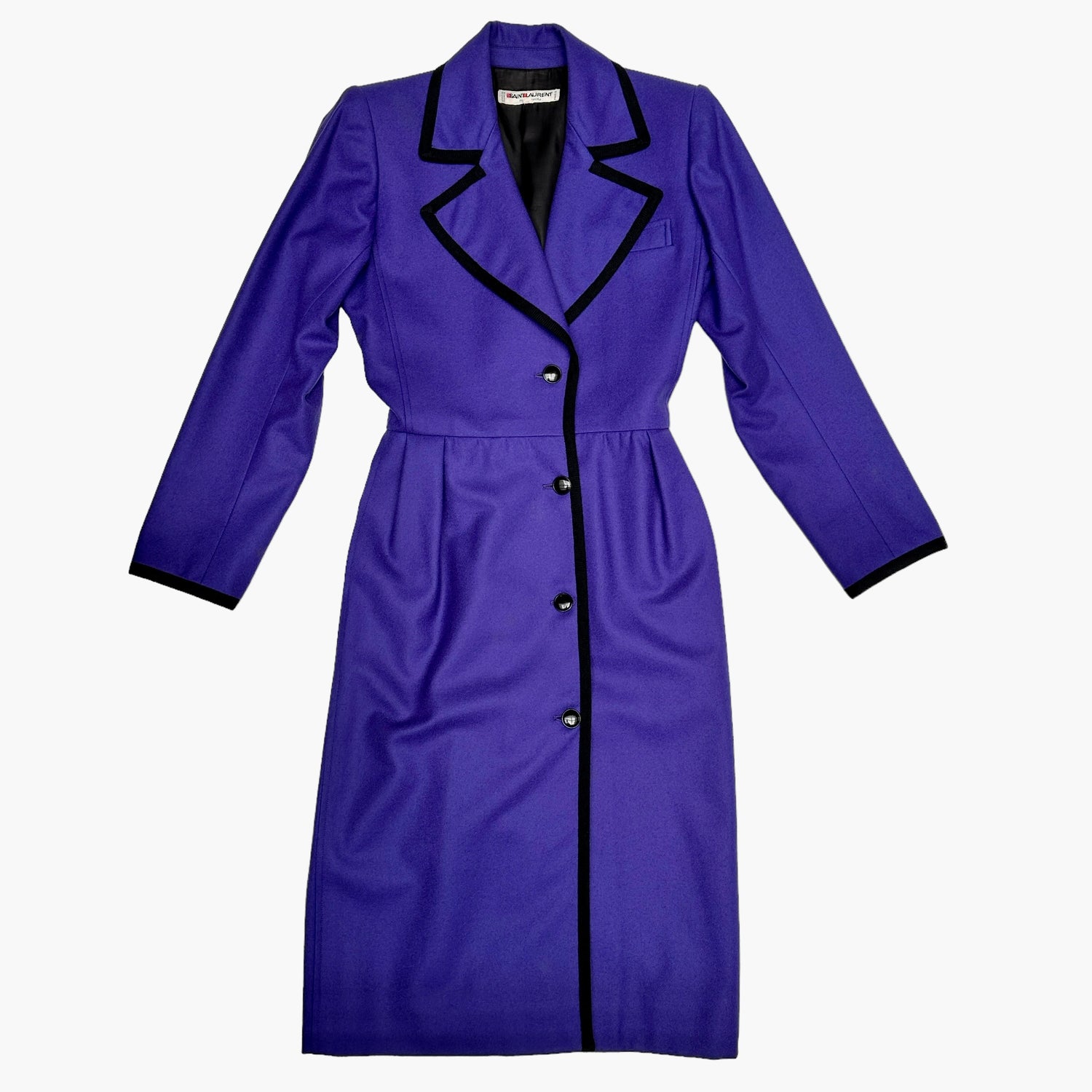 Yves Saint Laurent vintage purple coat. Long coat with pointed collar. Purple body with black trims. Button closure at front. Two pockets. Designer size 38.