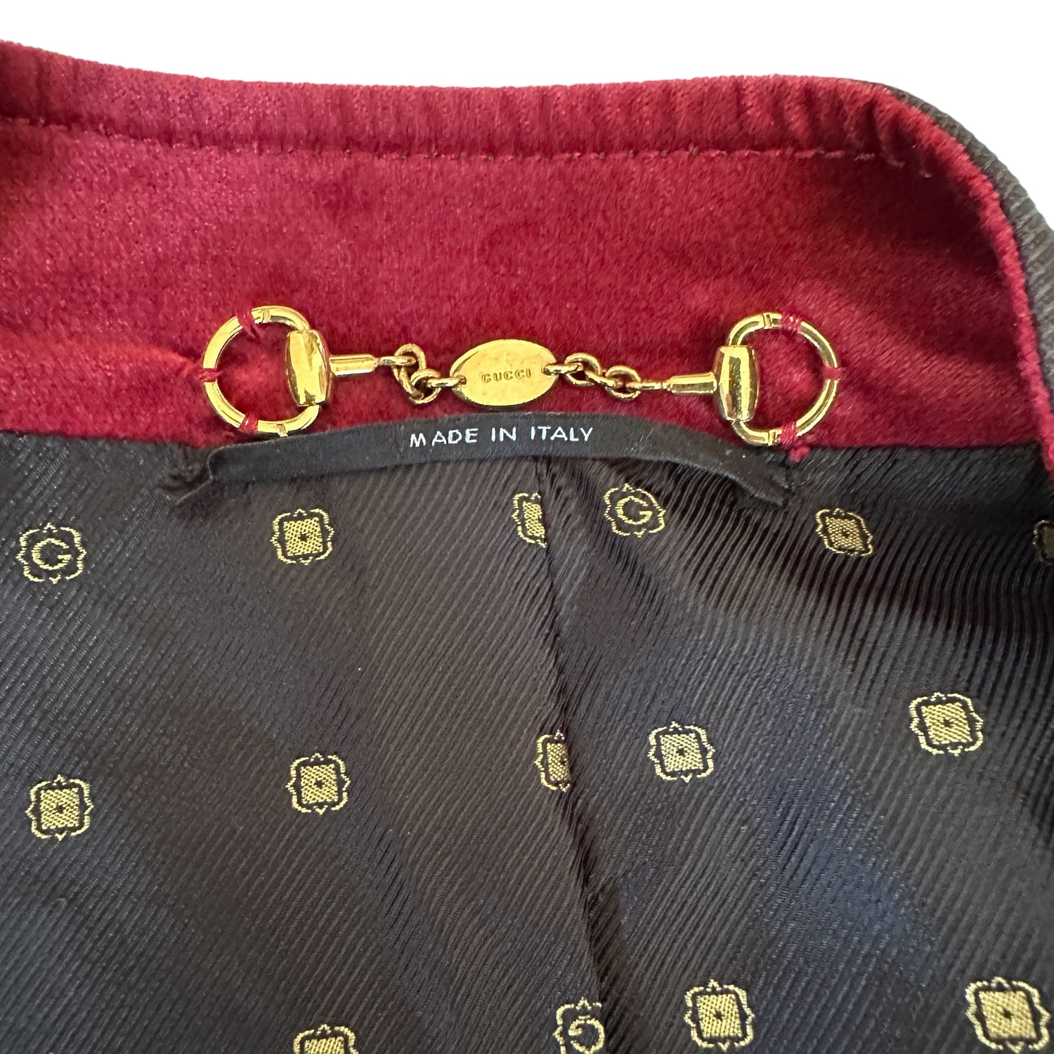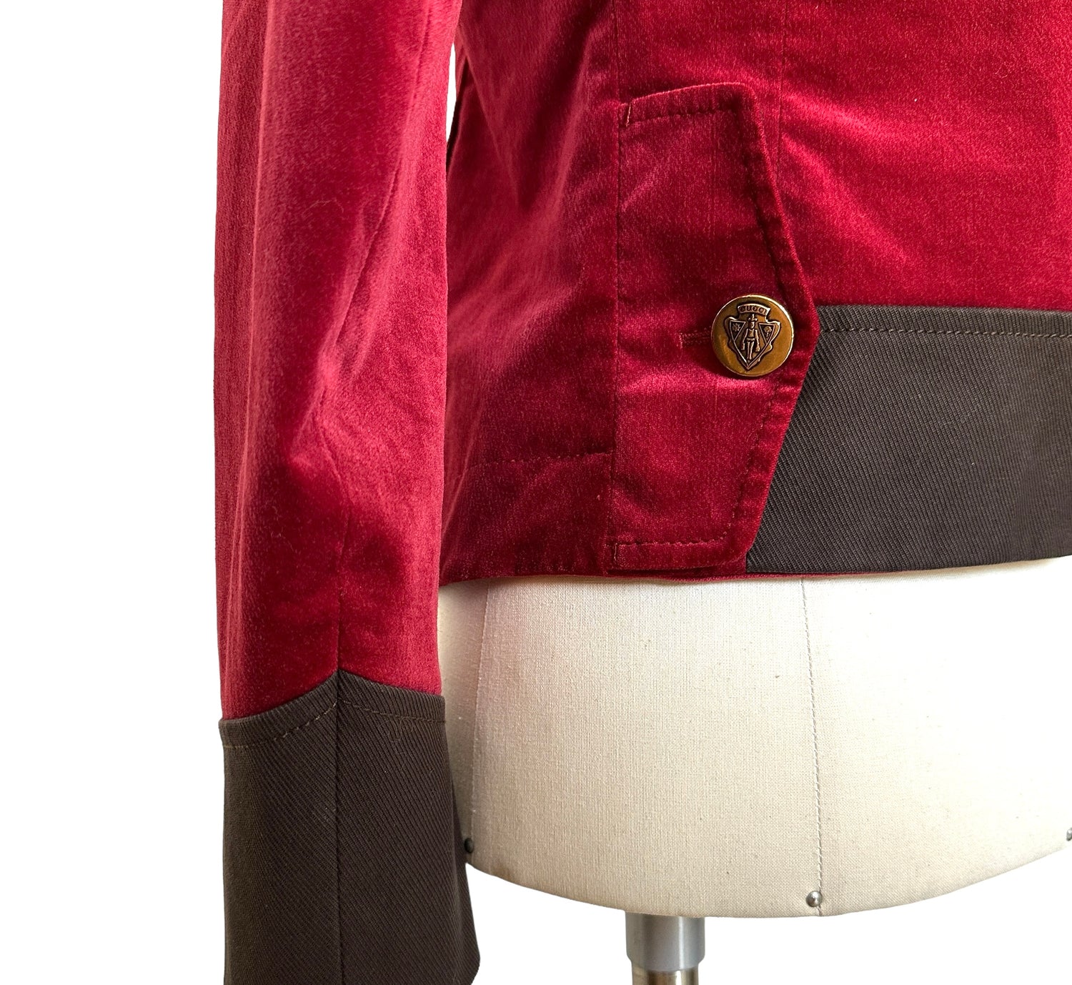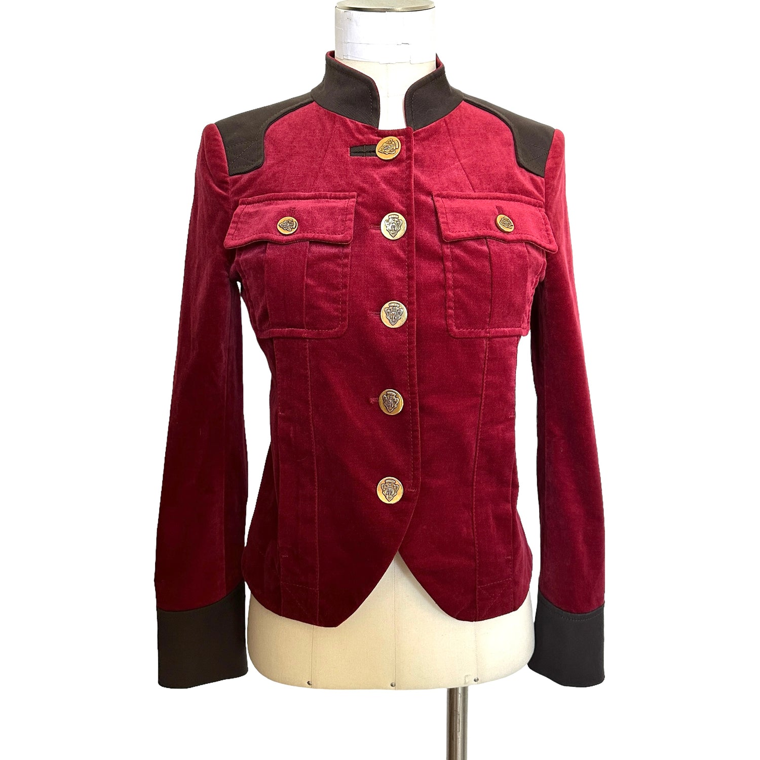 Gucci evening jacket. Vintage from the 2008 Collection by Frida Giannini. Red velvet. Gold-tone buttons. Stand collar. Flap pockets. Button closure at front. Designer size 40.