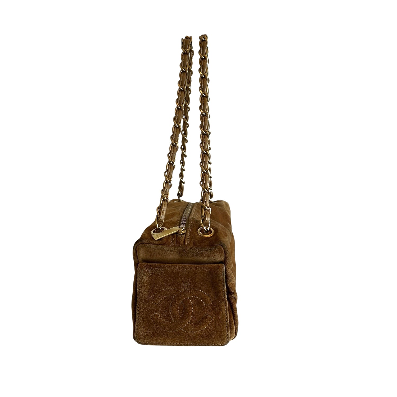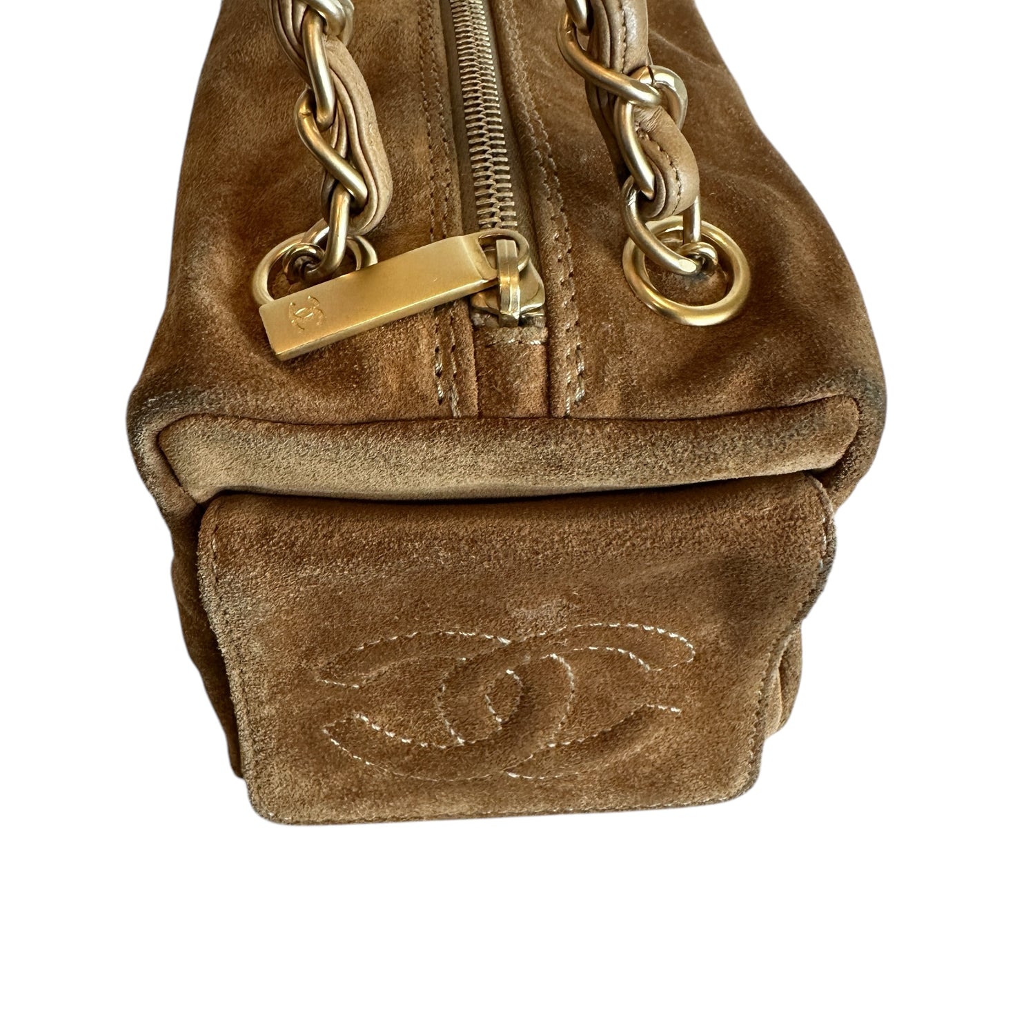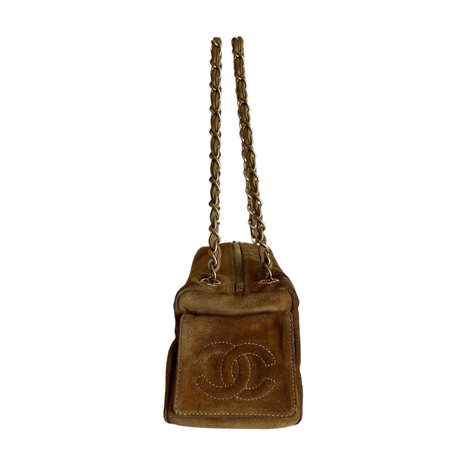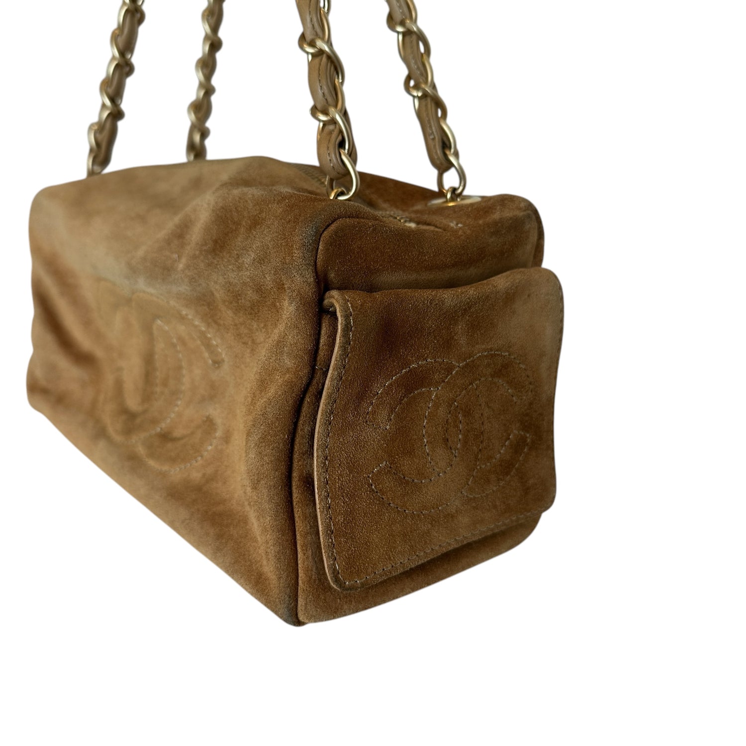 Chanel vintage square bowler bag. Tan suede. 2003 collection. CC logo at front and sides. Zipper closure. Double chain shoulder straps. Logo nylon lining. One interior pocket.