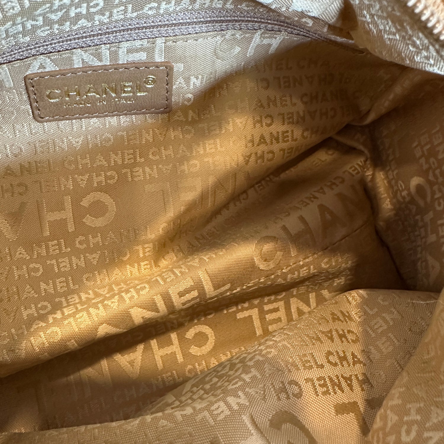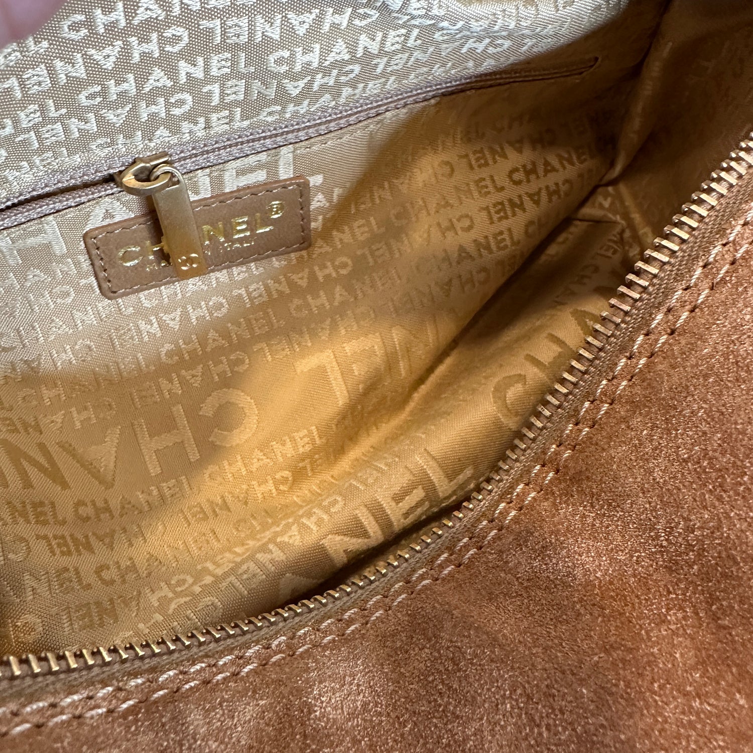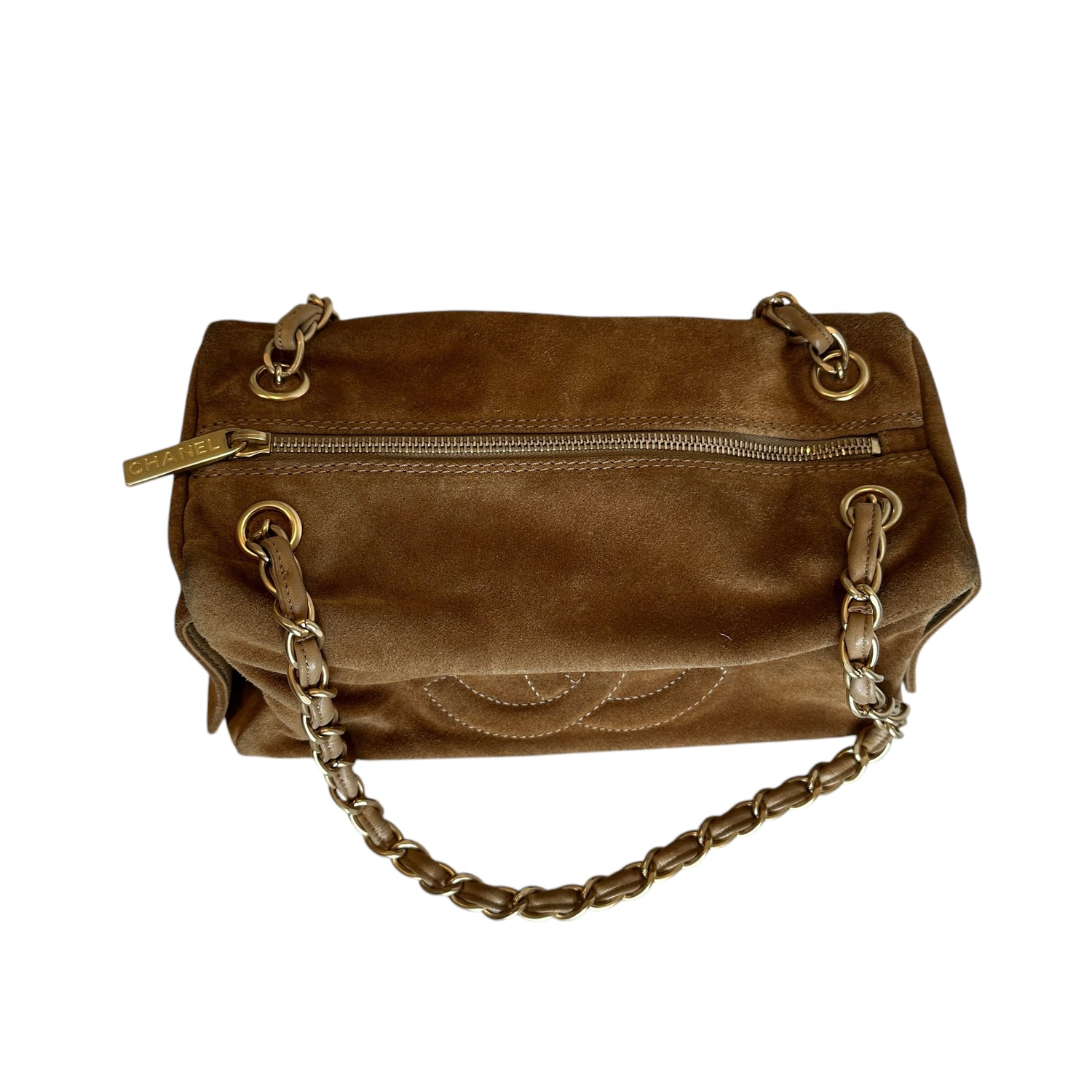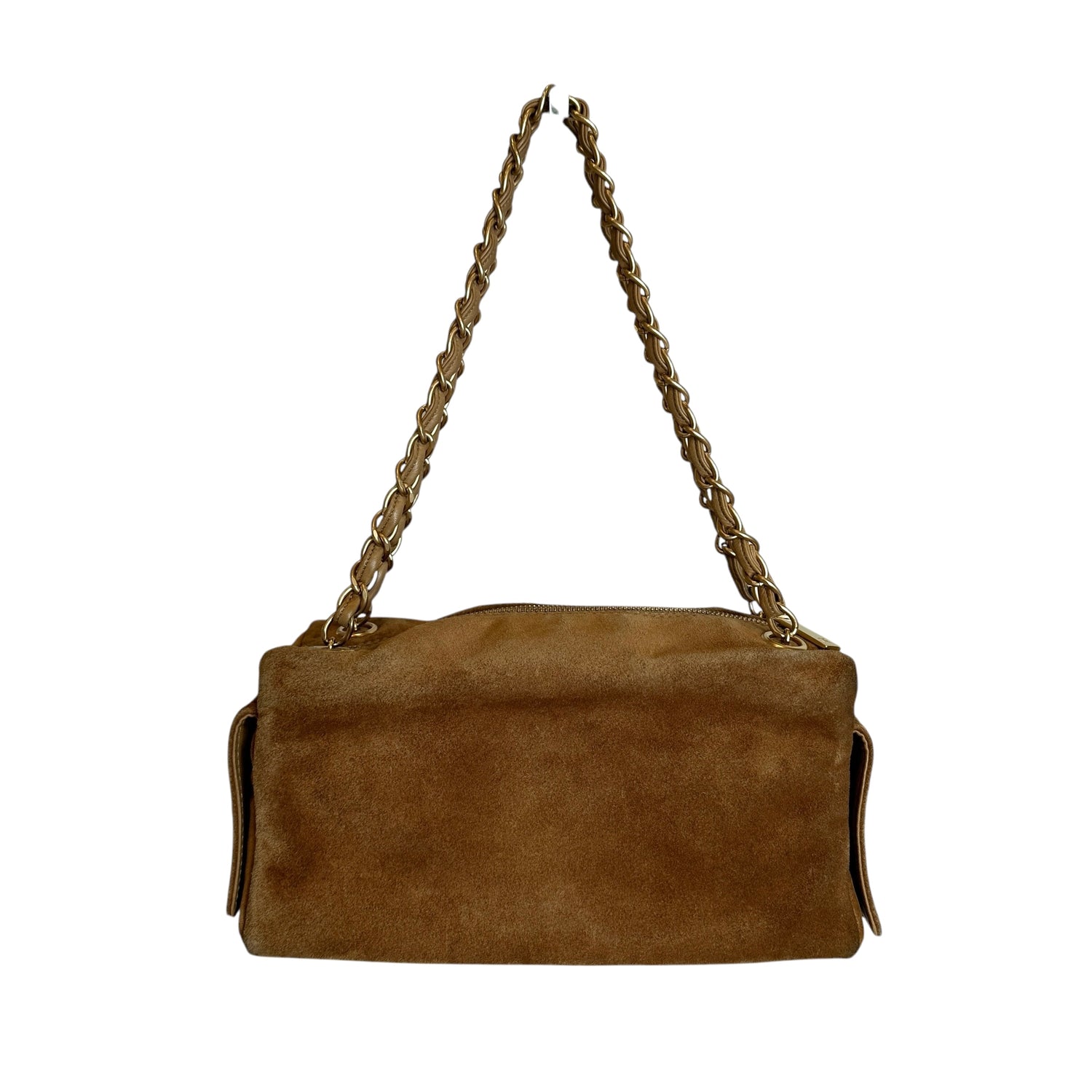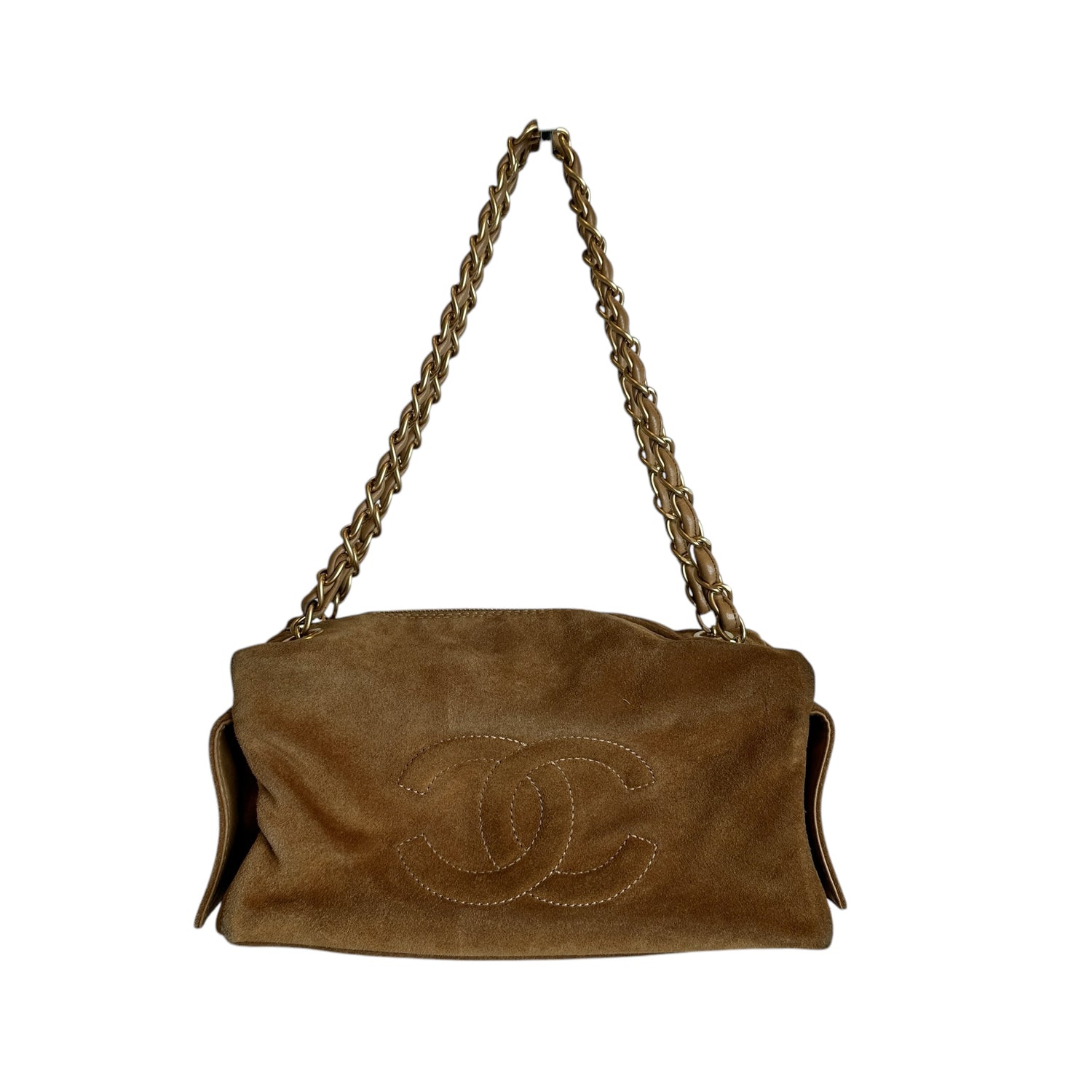 Chanel vintage square bowler bag. Tan suede. 2003 collection. CC logo at front and sides. Zipper closure. Double chain shoulder straps. Logo nylon lining. One interior pocket.