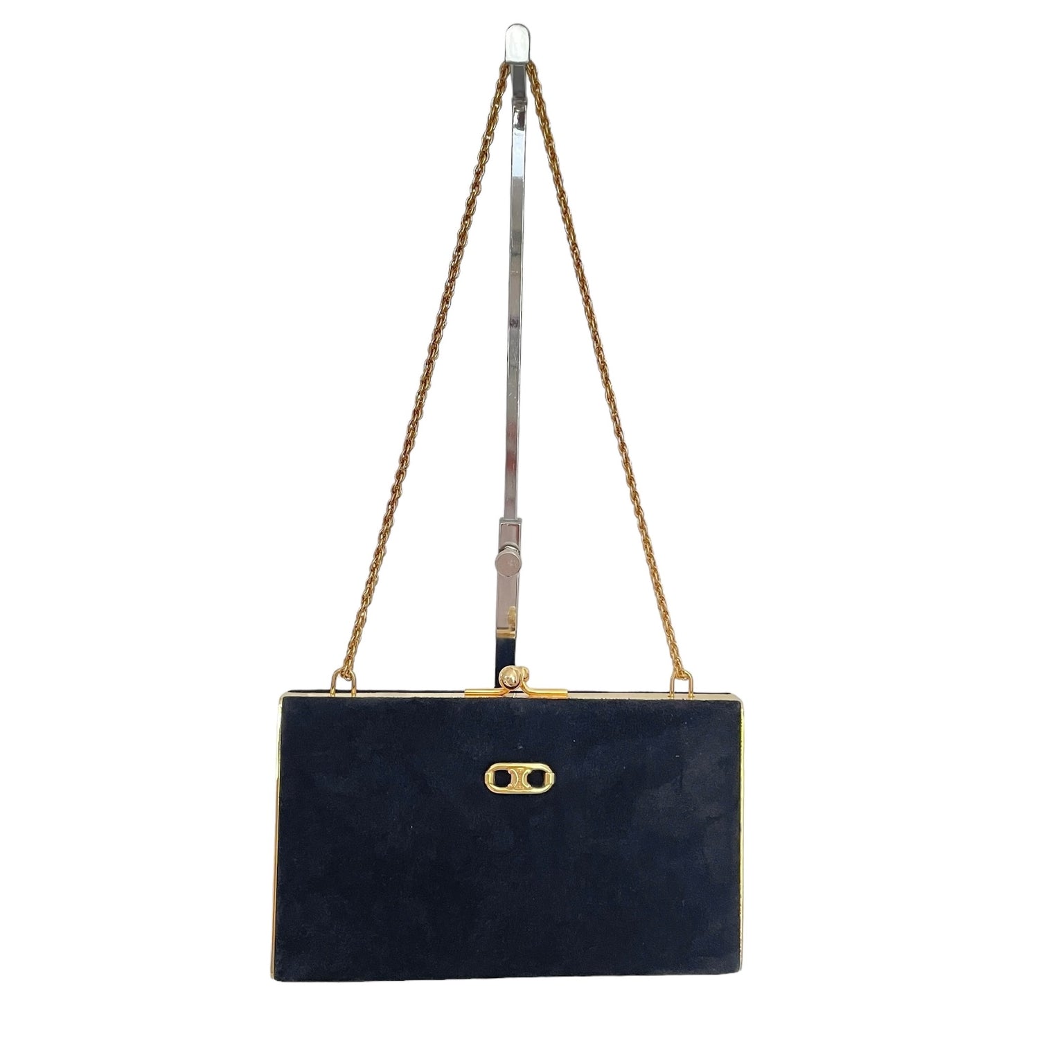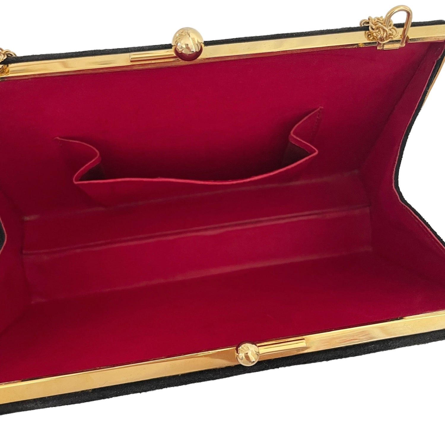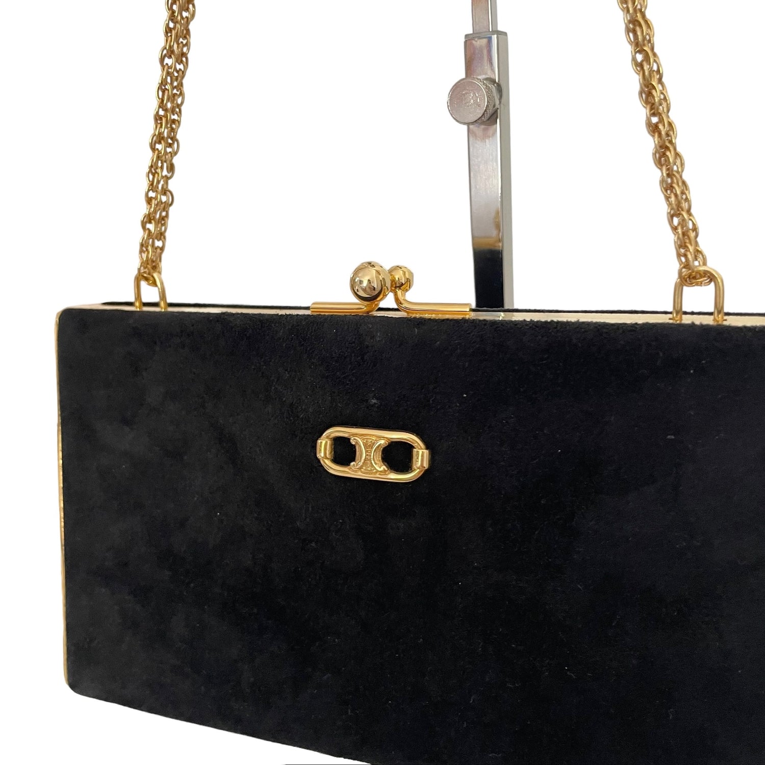Celine vintage bag. Gold-tone triomphe logo at front. Black suede. Gold-tone hardware and chain strap. Red lambskin leather lining. Clic-clac closure at top.