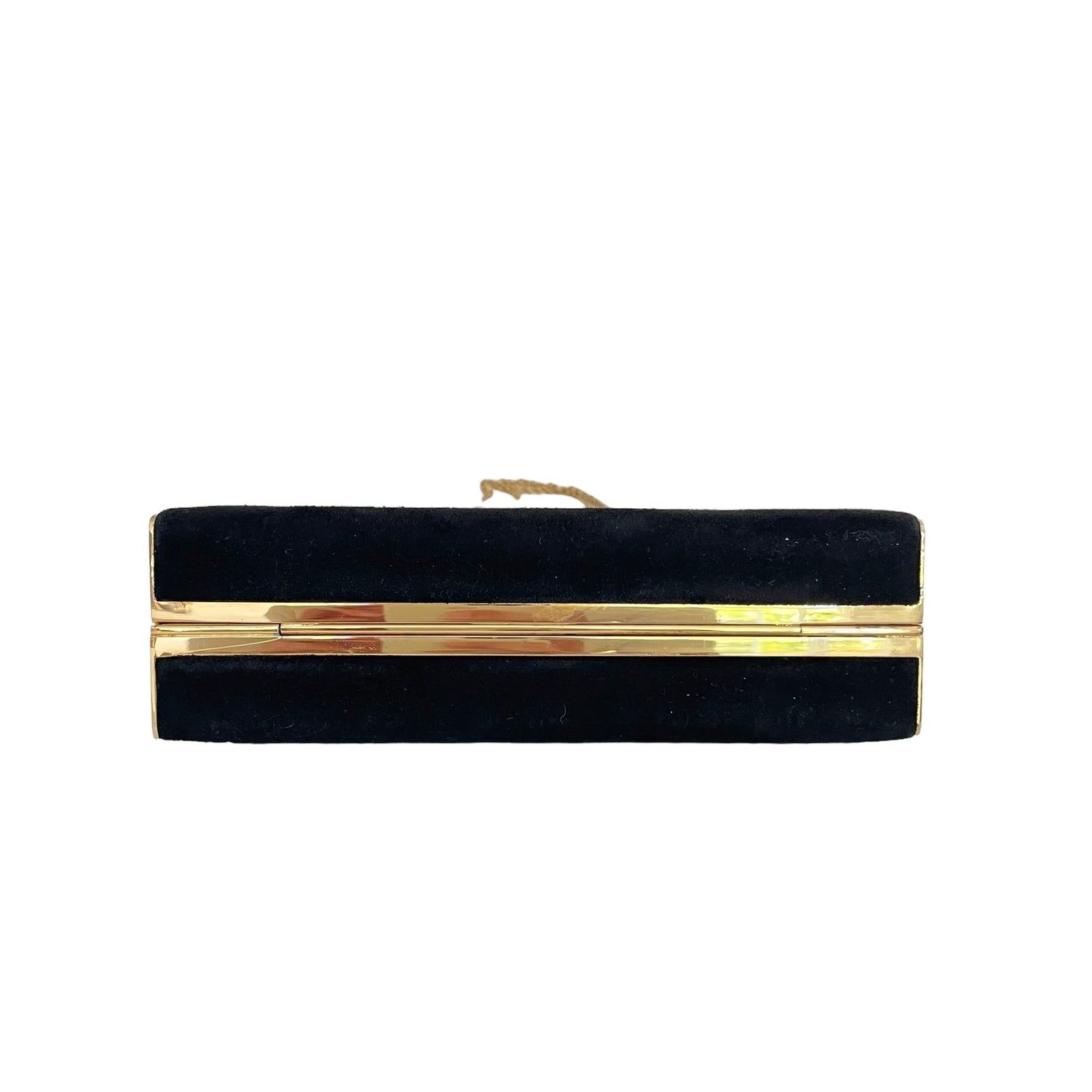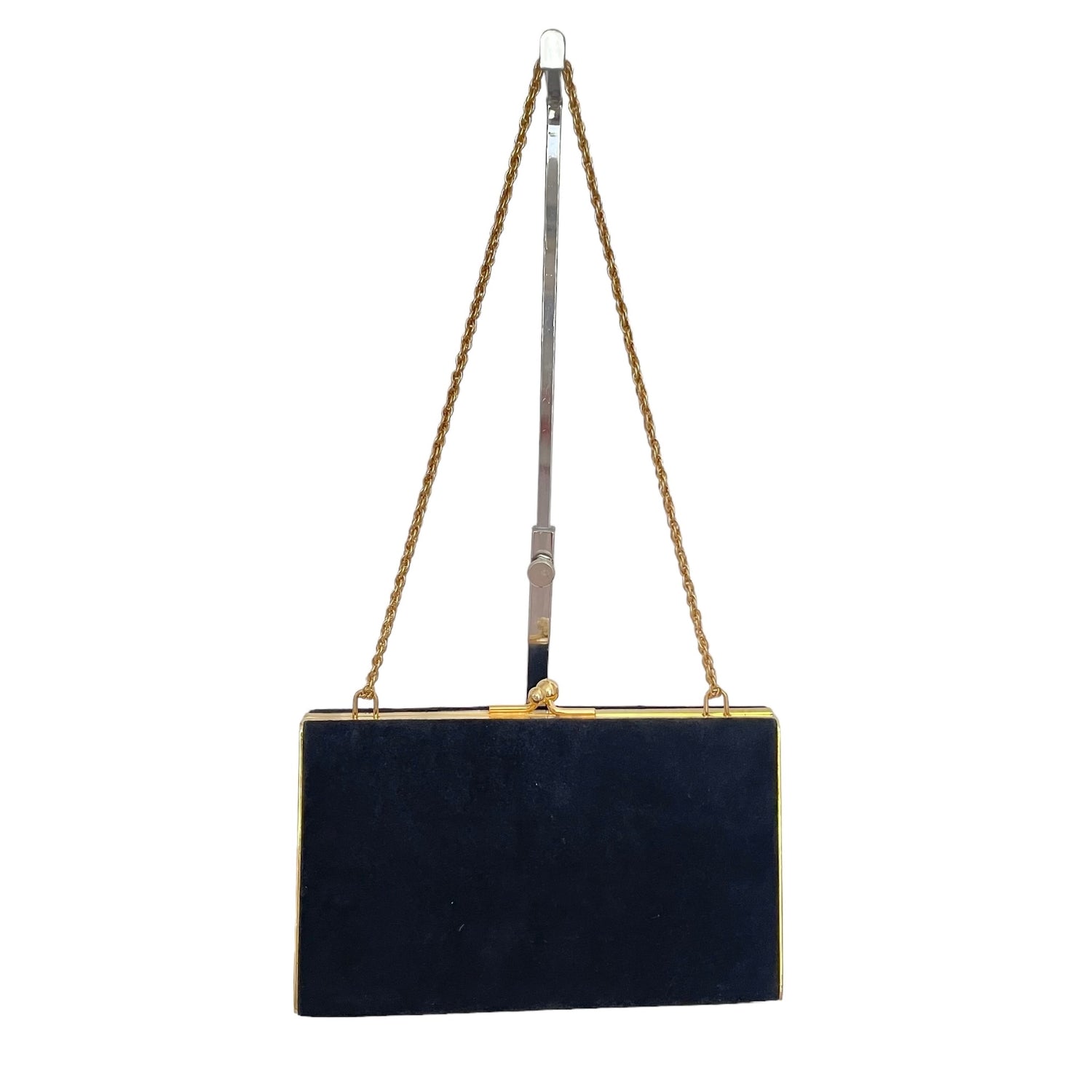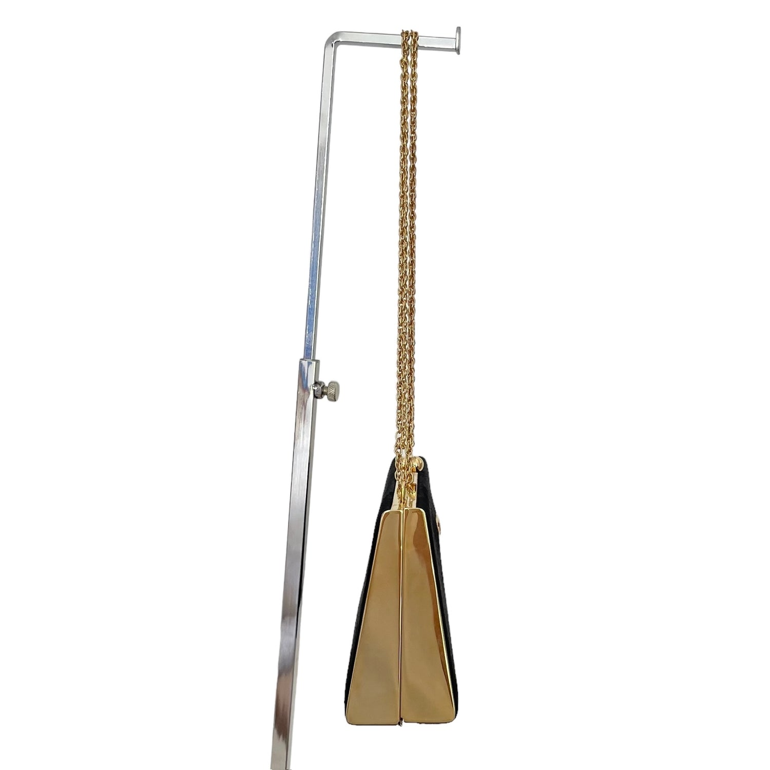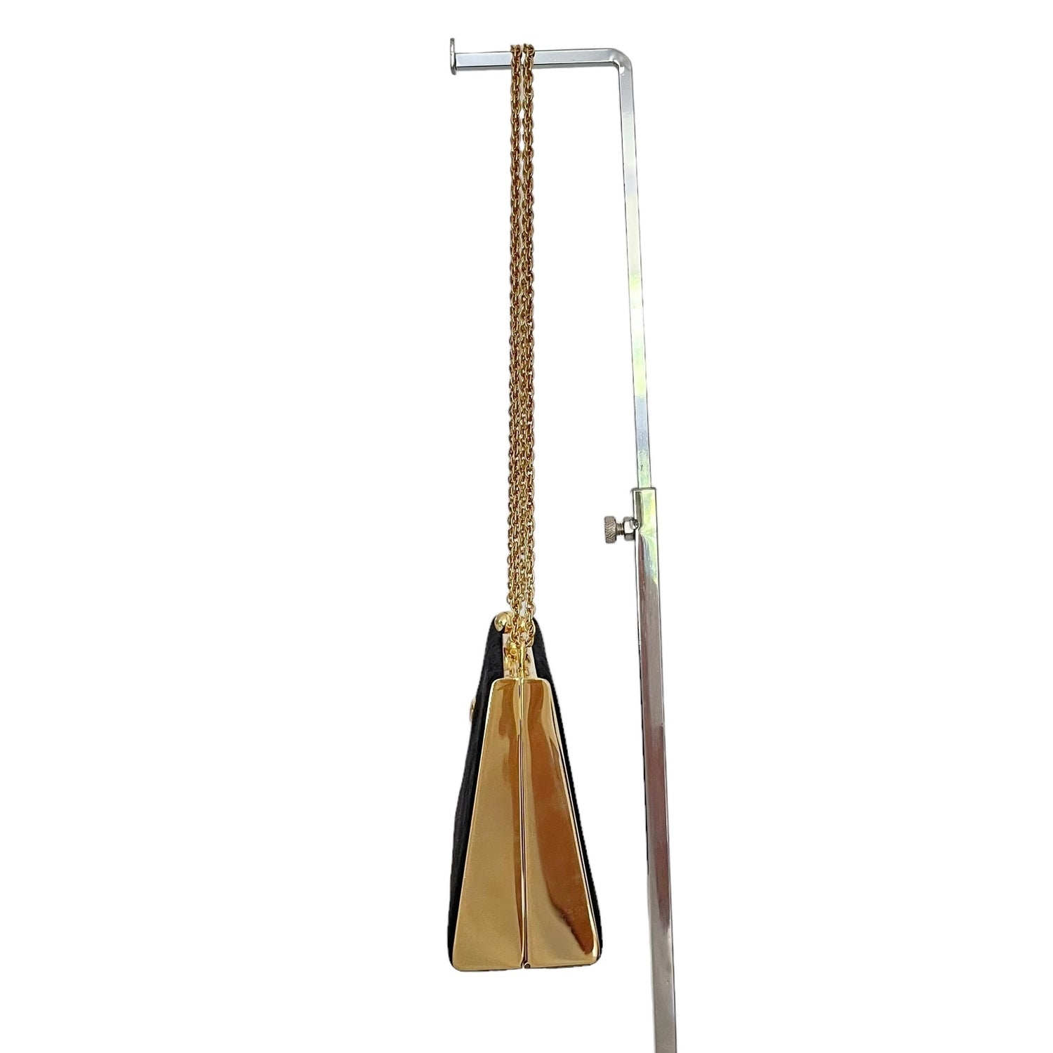 Celine vintage bag. Gold-tone triomphe logo at front. Black suede. Gold-tone hardware and chain strap. Red lambskin leather lining. Clic-clac closure at top.