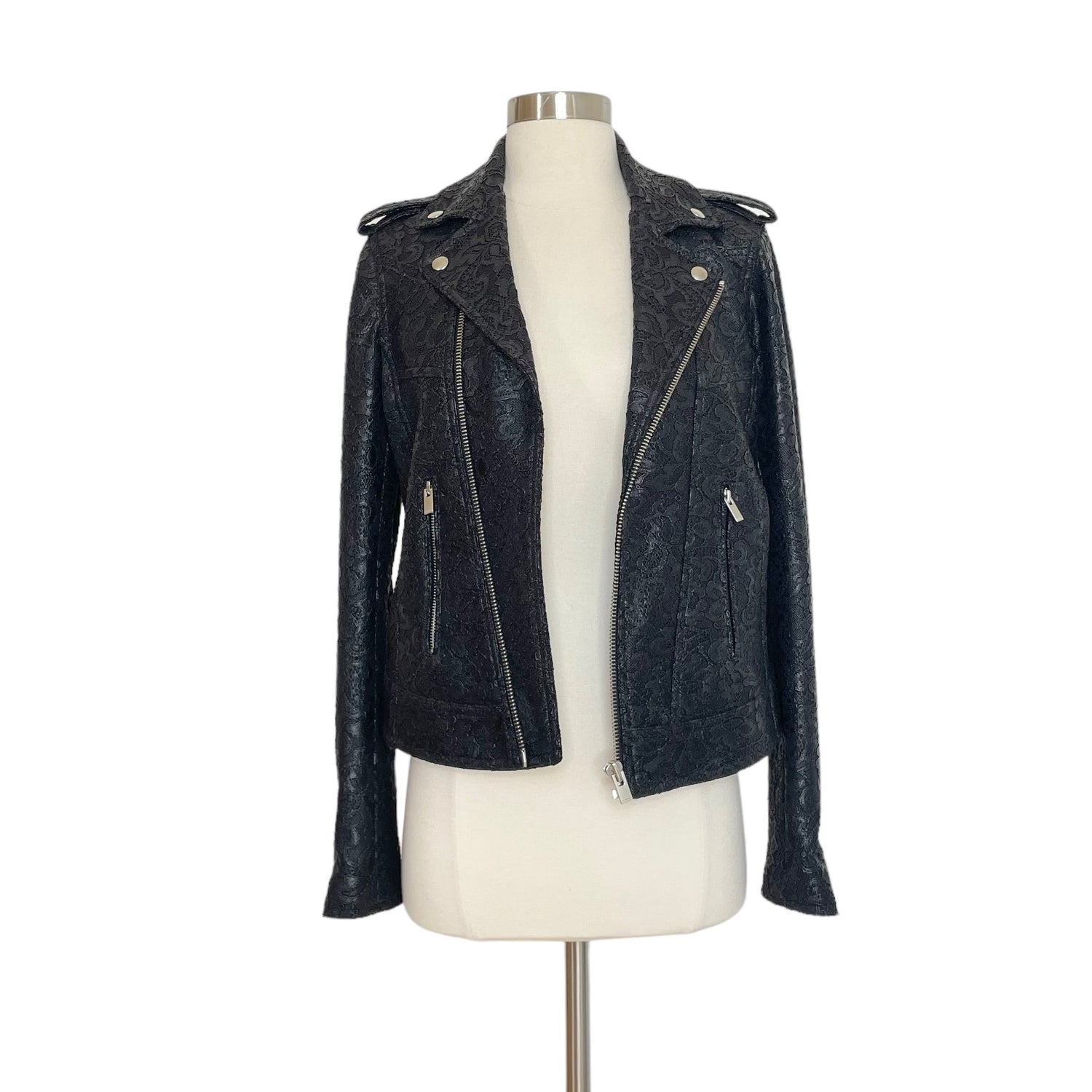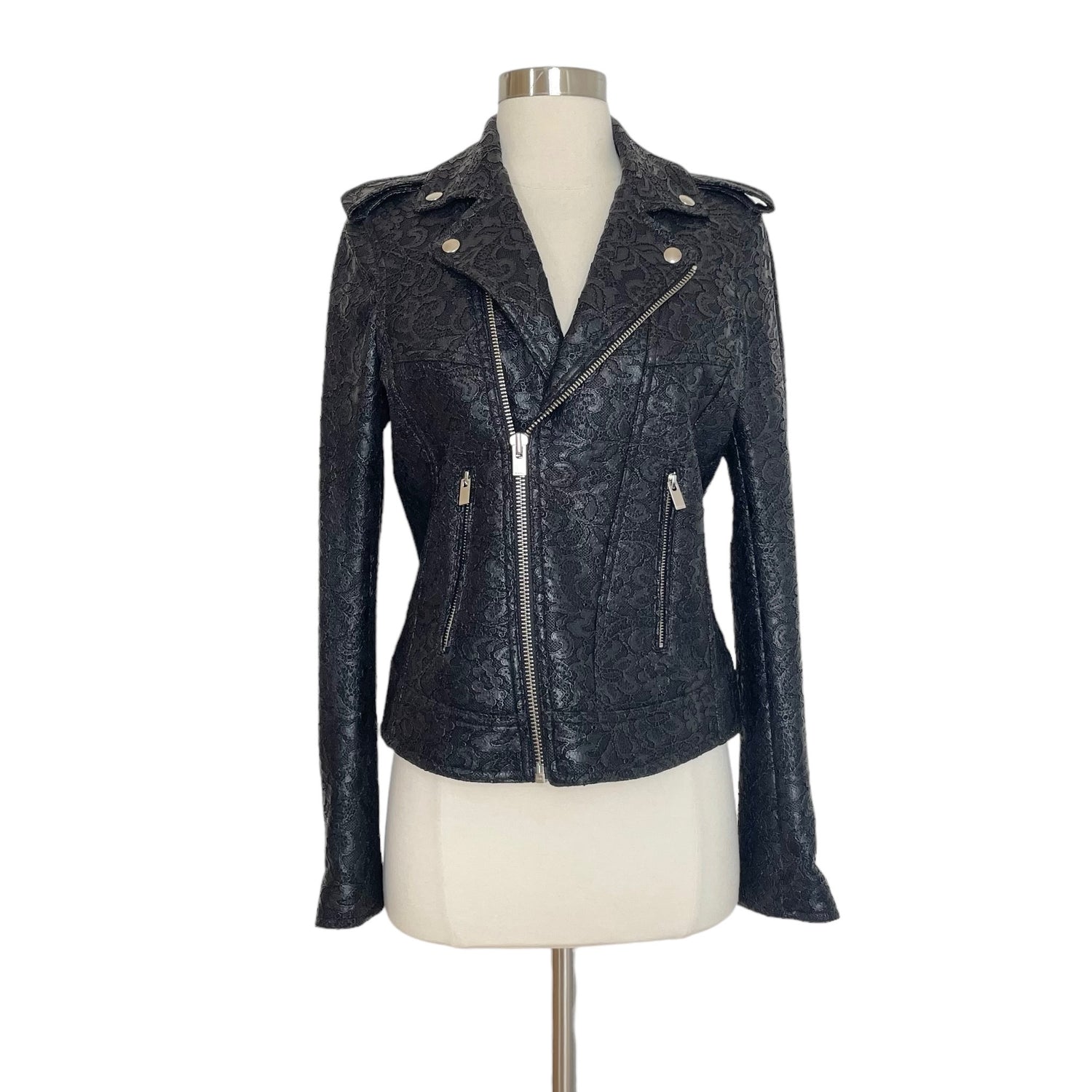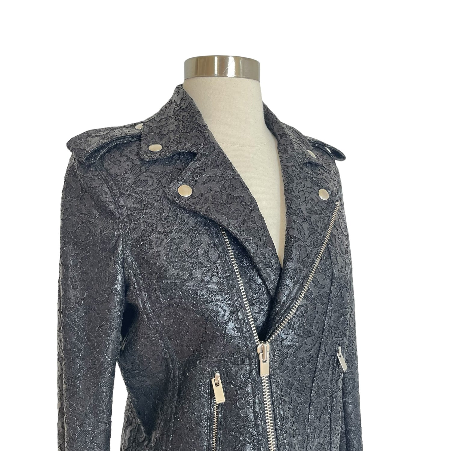 The Kooples black waxed lace moto jacket. Silver hardware and zippers. Designer size 3.