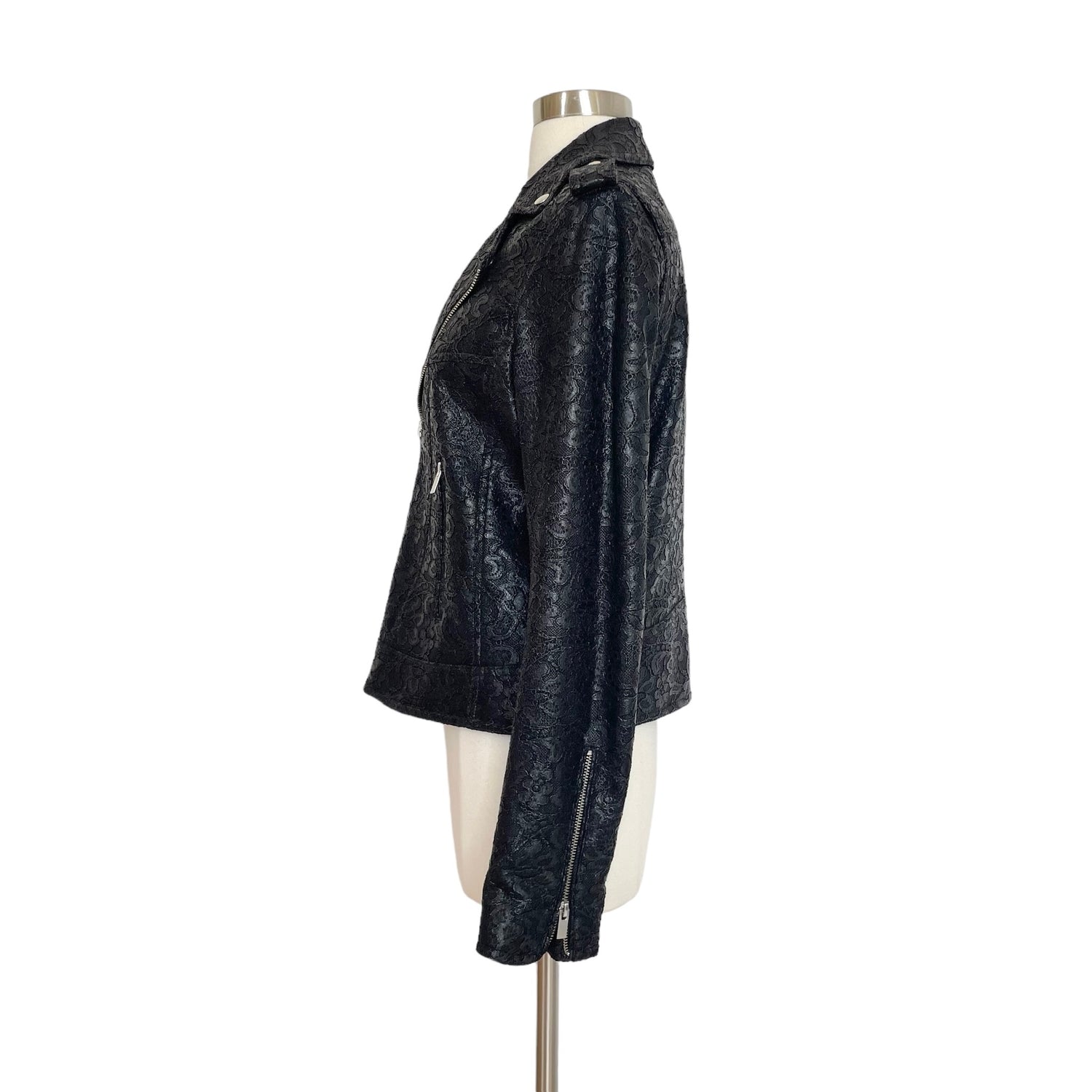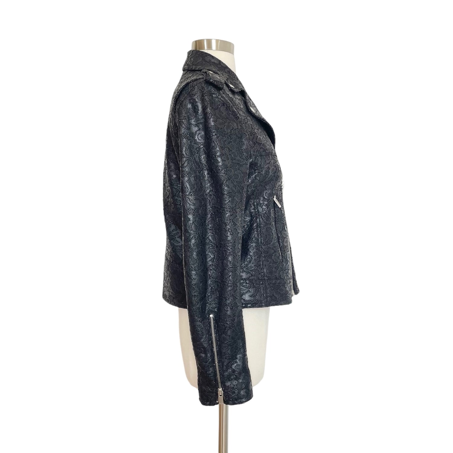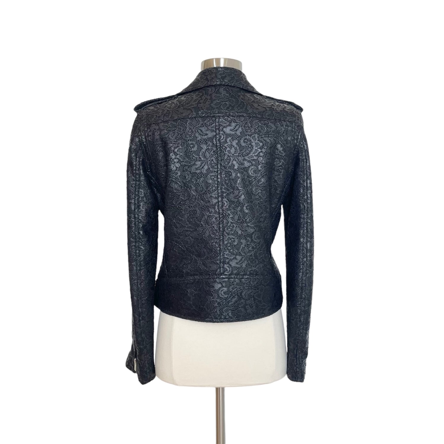 The Kooples black waxed lace moto jacket. Silver hardware and zippers. Designer size 3.