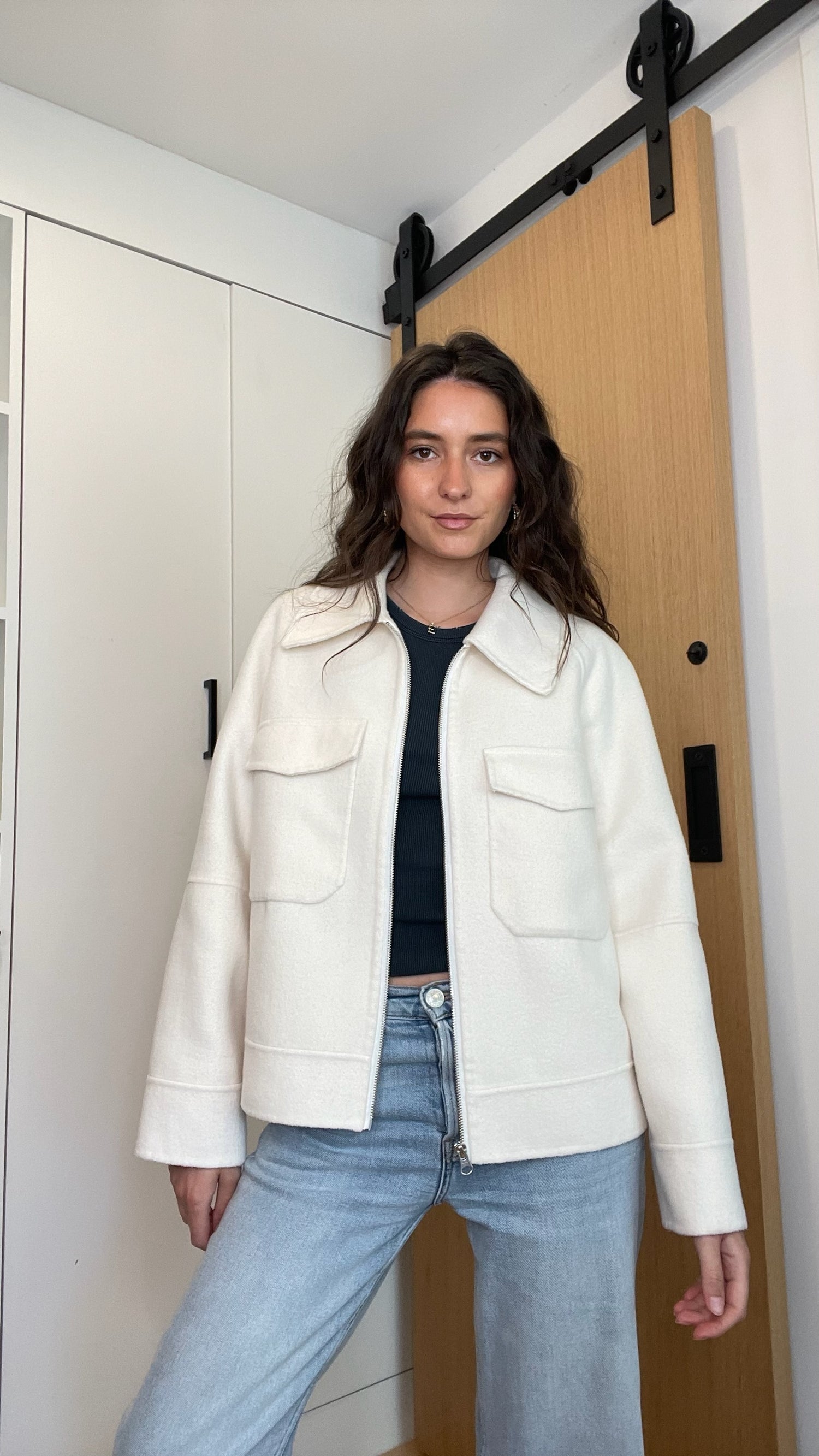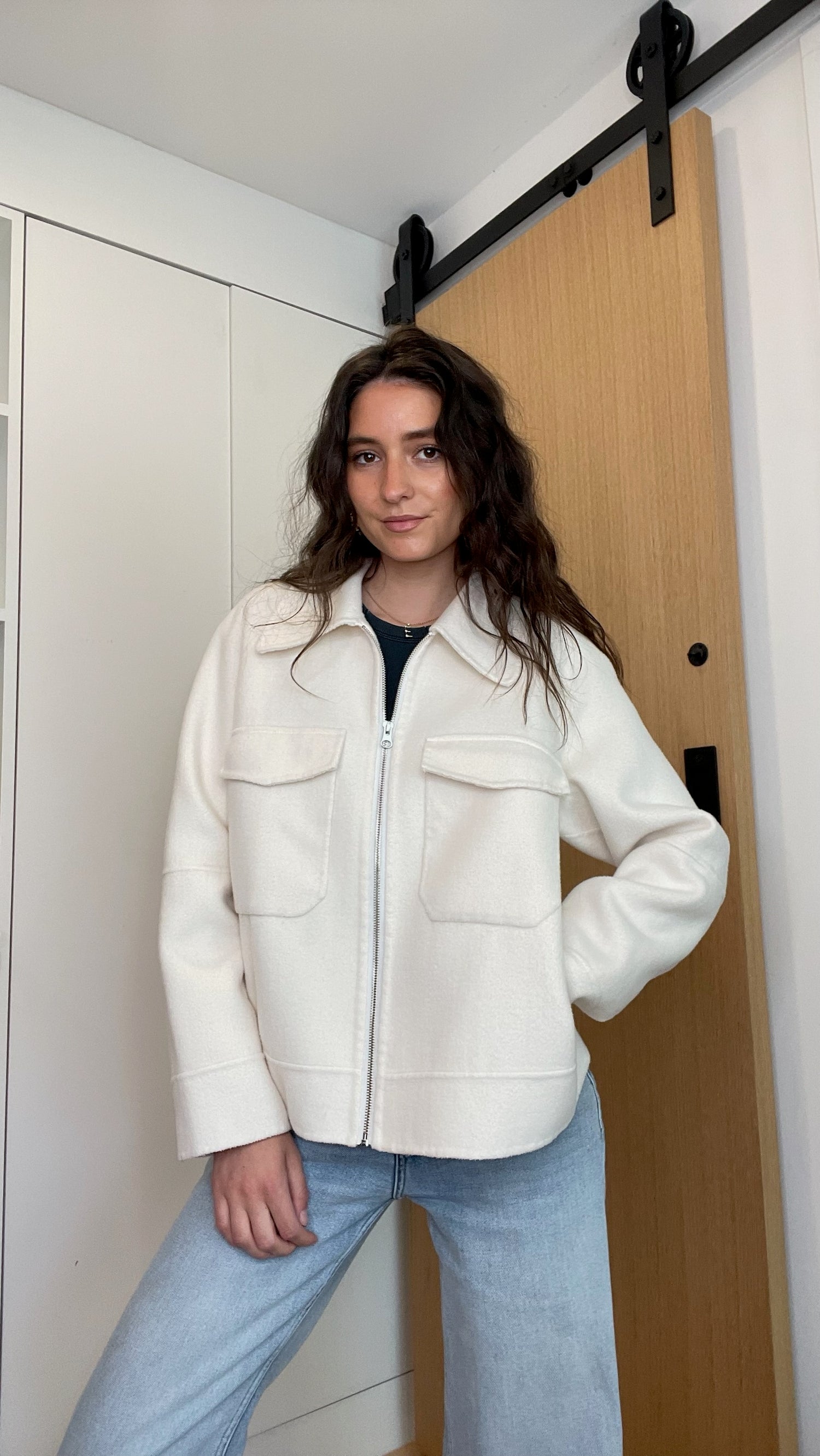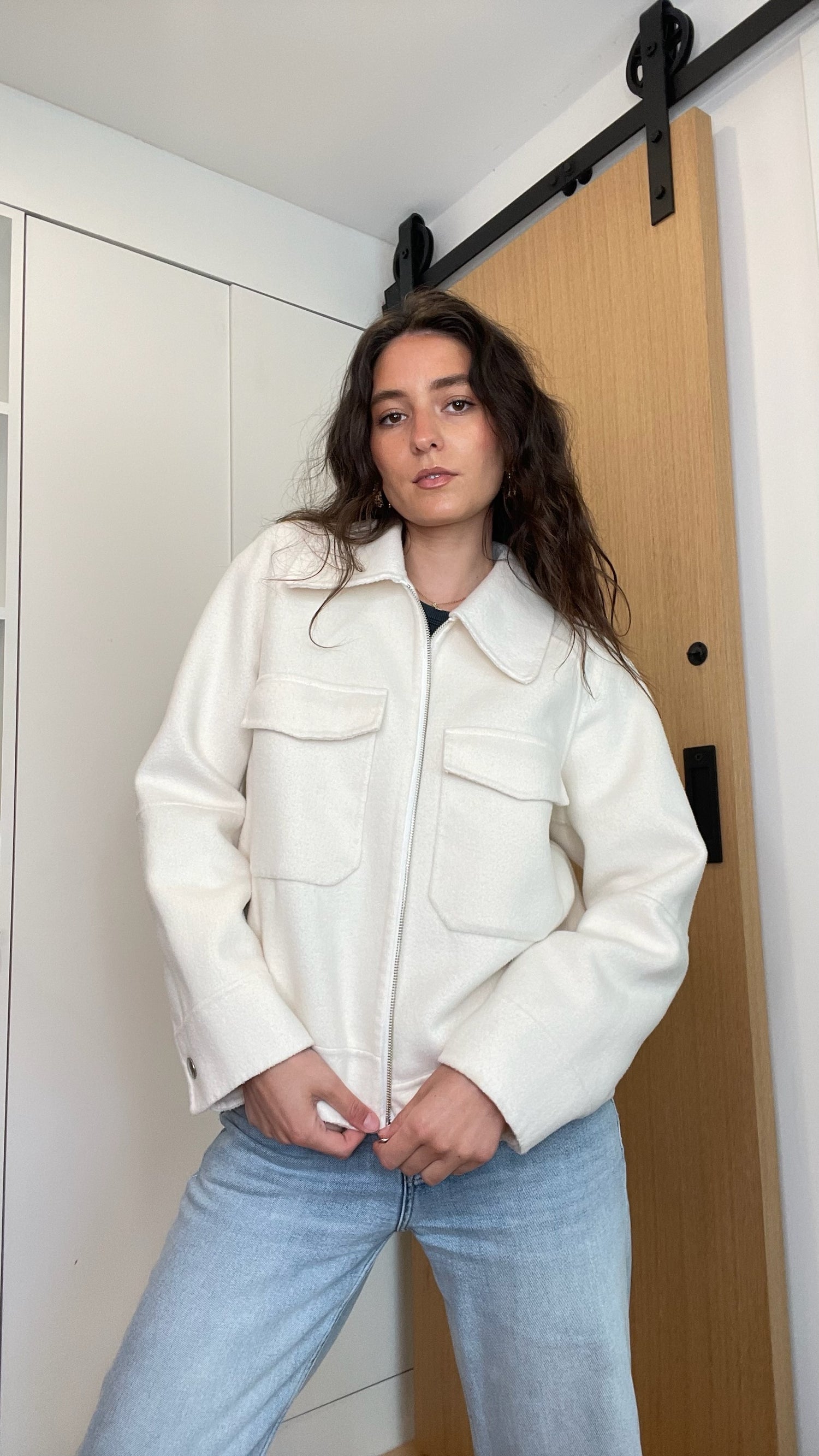 Rails white bomber jacket. Patch pockets at front. Pointed collar. Zipper closure at front. Designer size Medium.