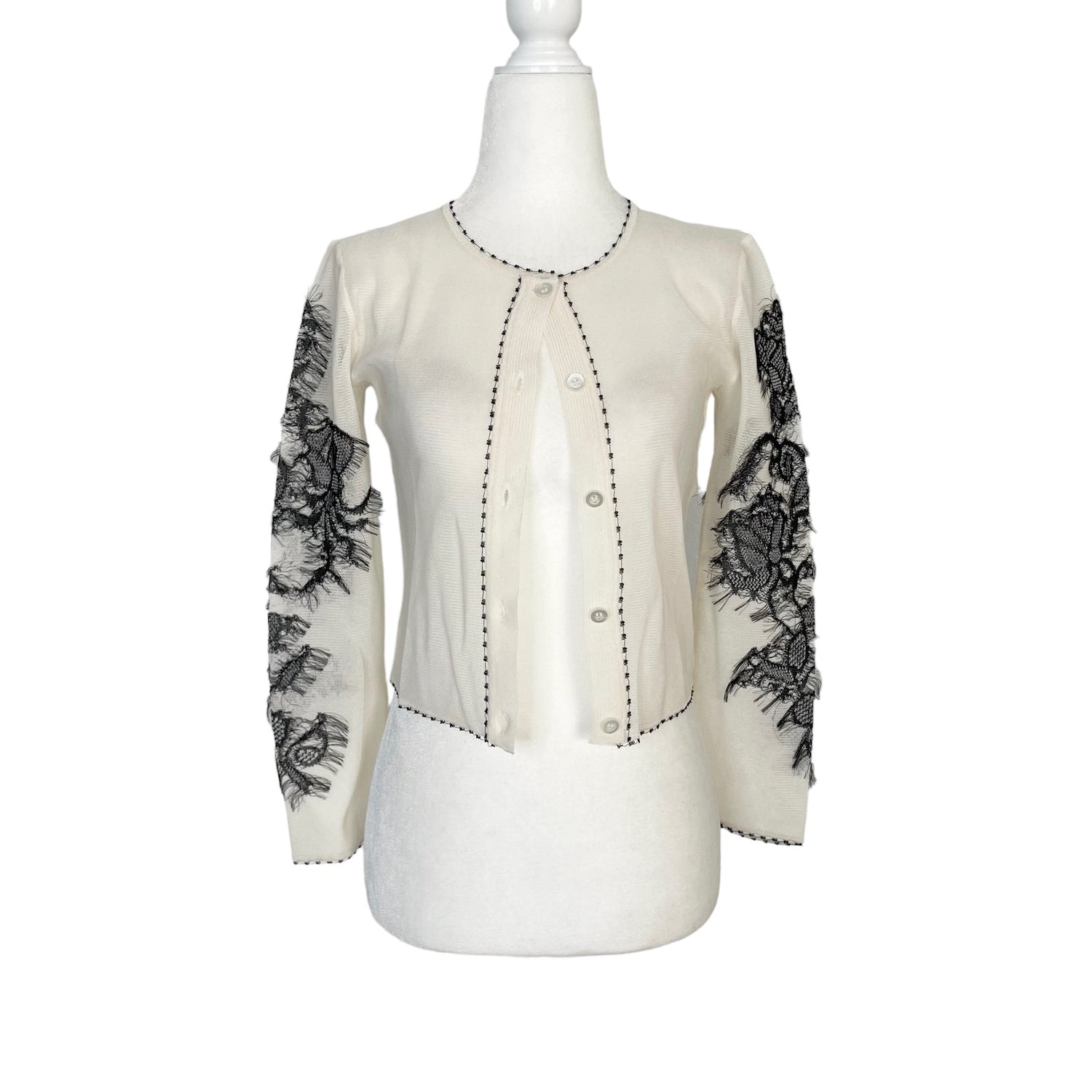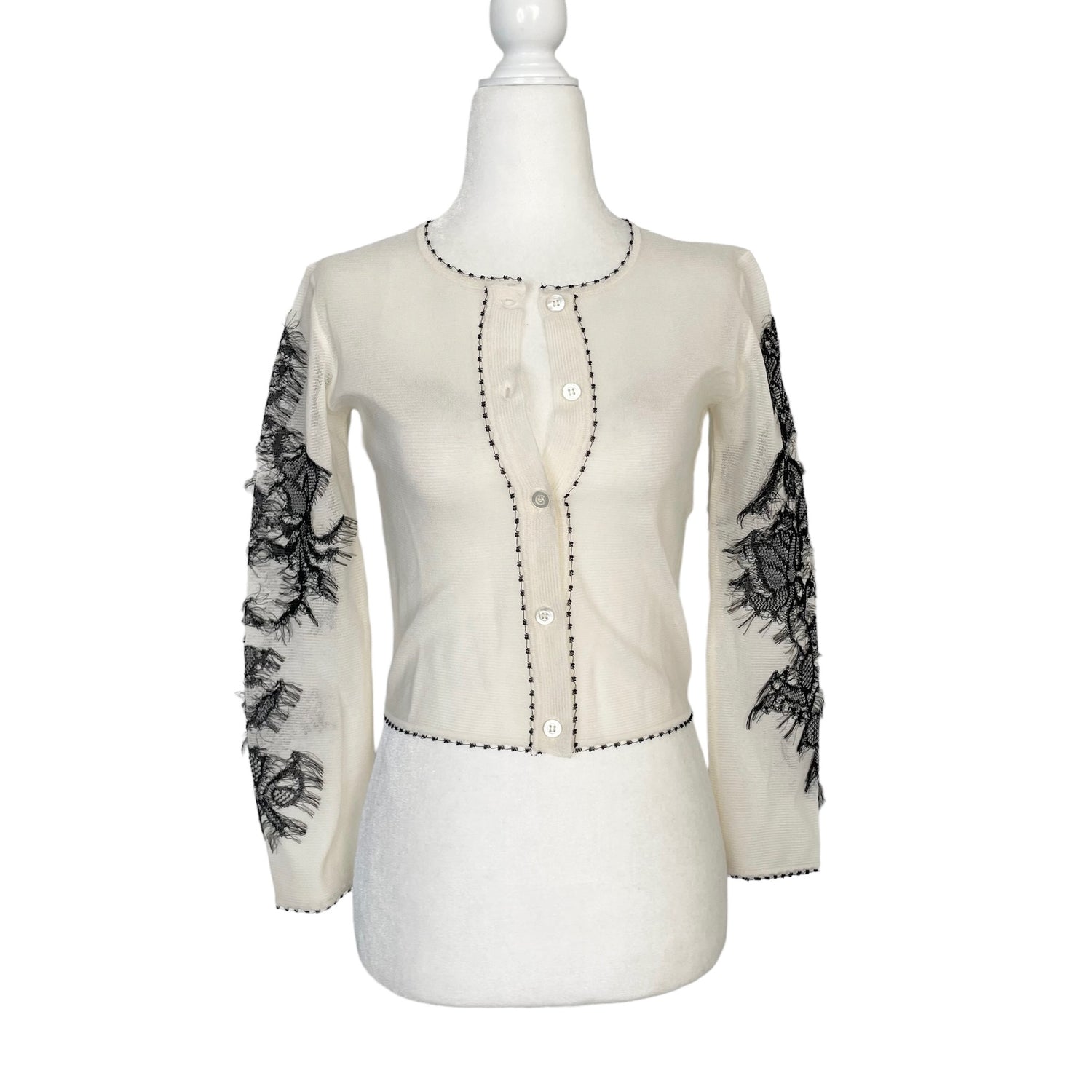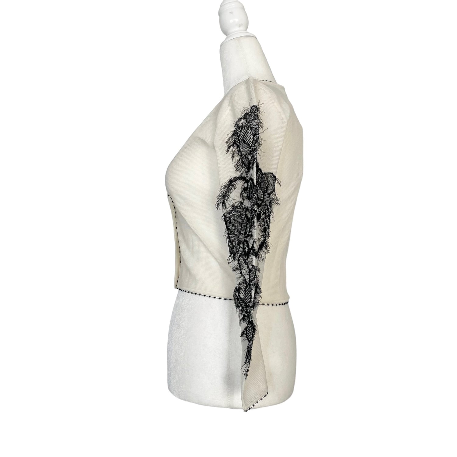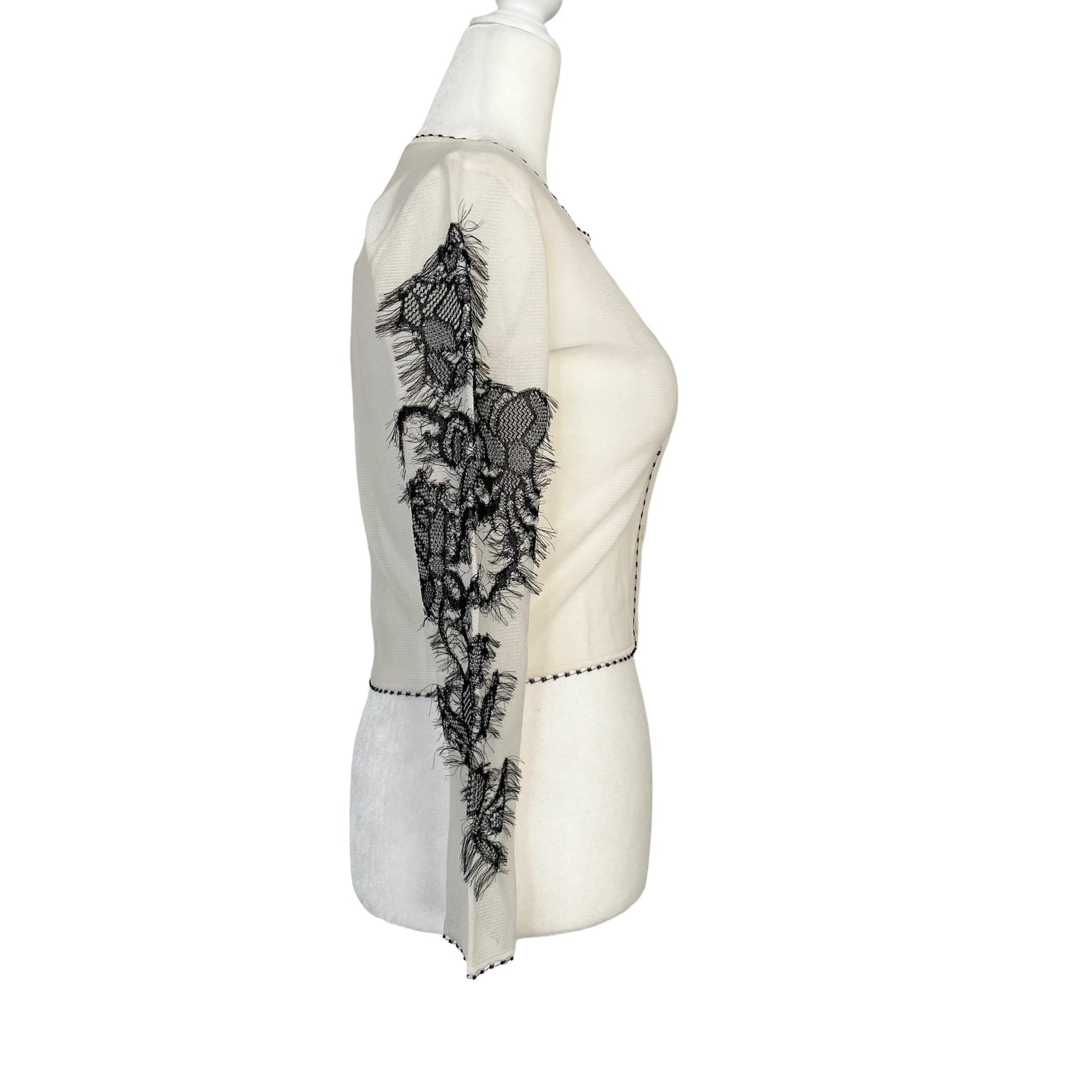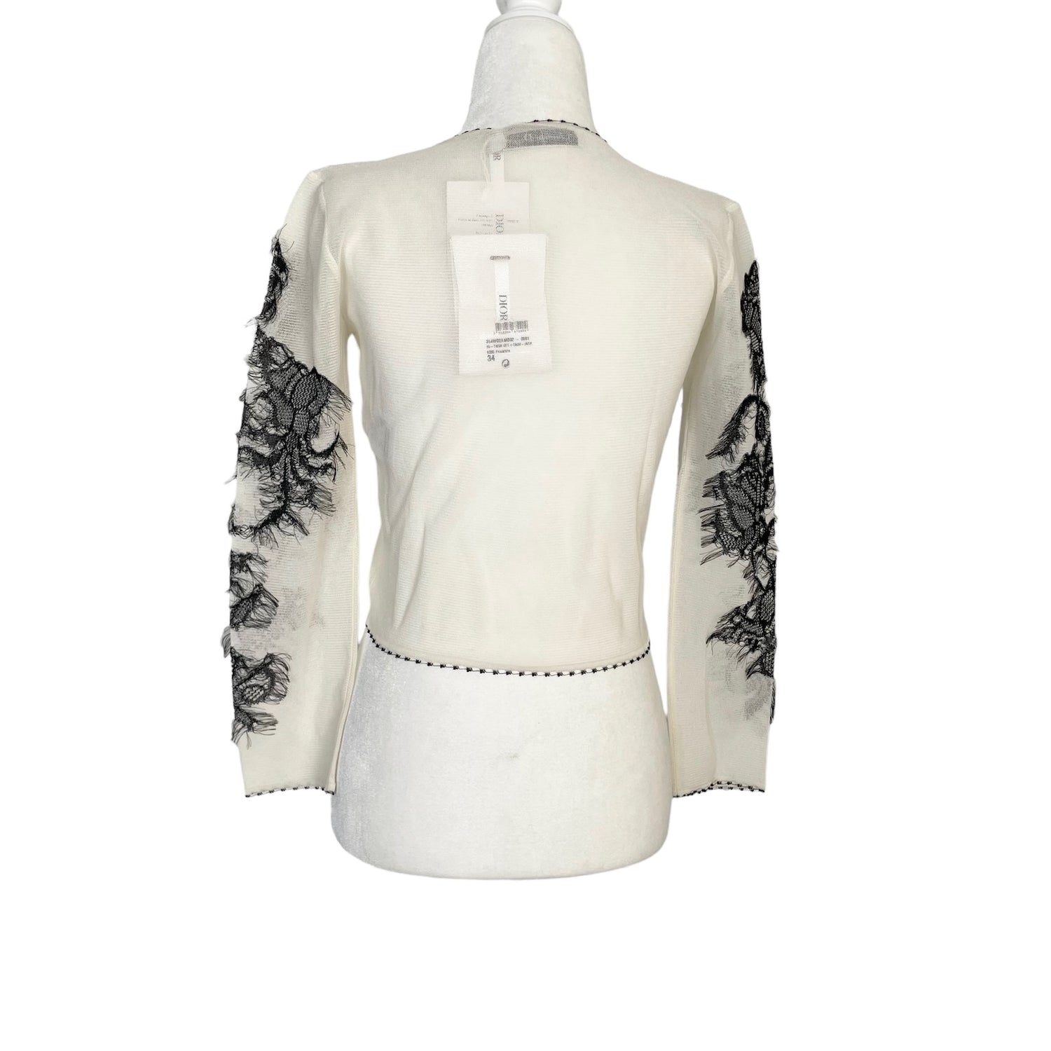 Christian Dior mesh cardigan. Beautiful and intricate embroidered sleeves. Button closure at front. Lightweight and see-through material. Designer size 34.