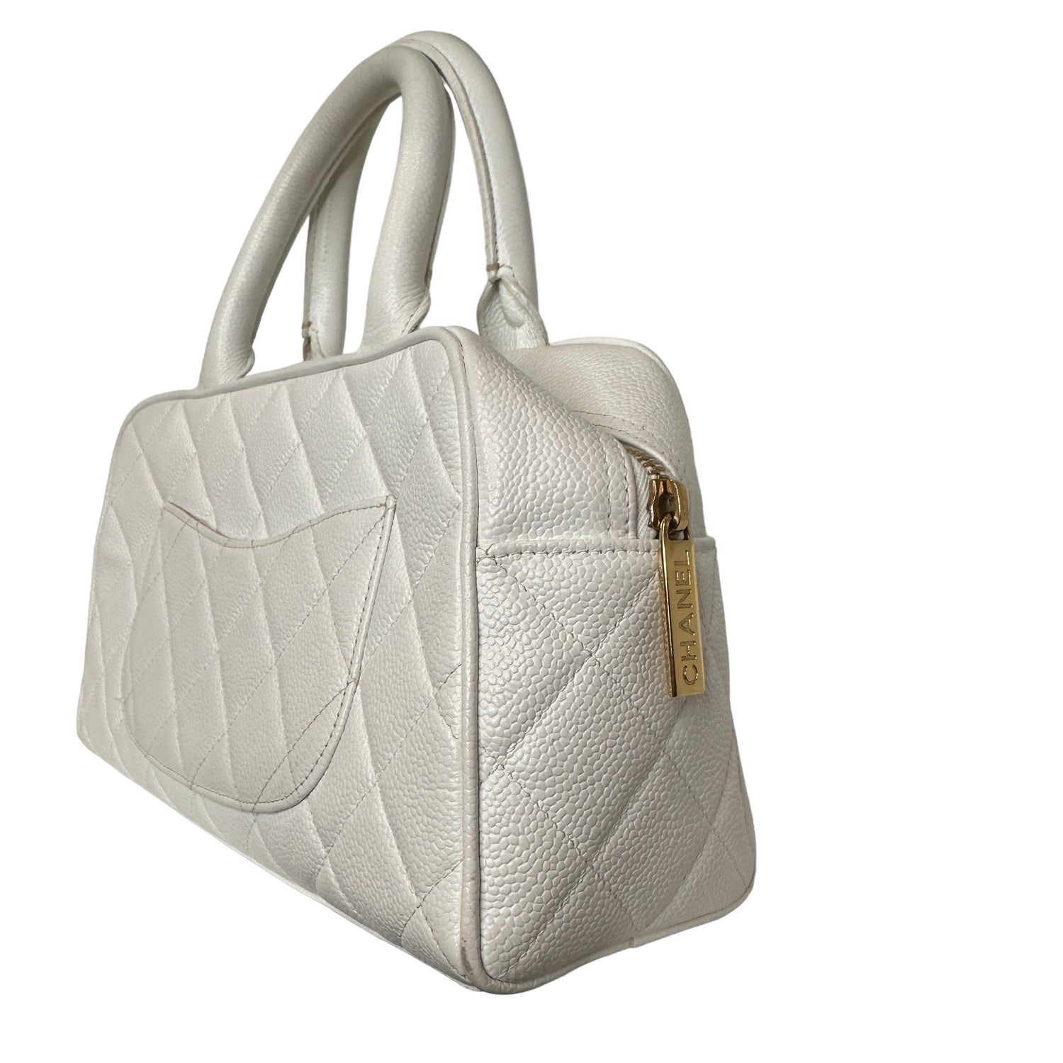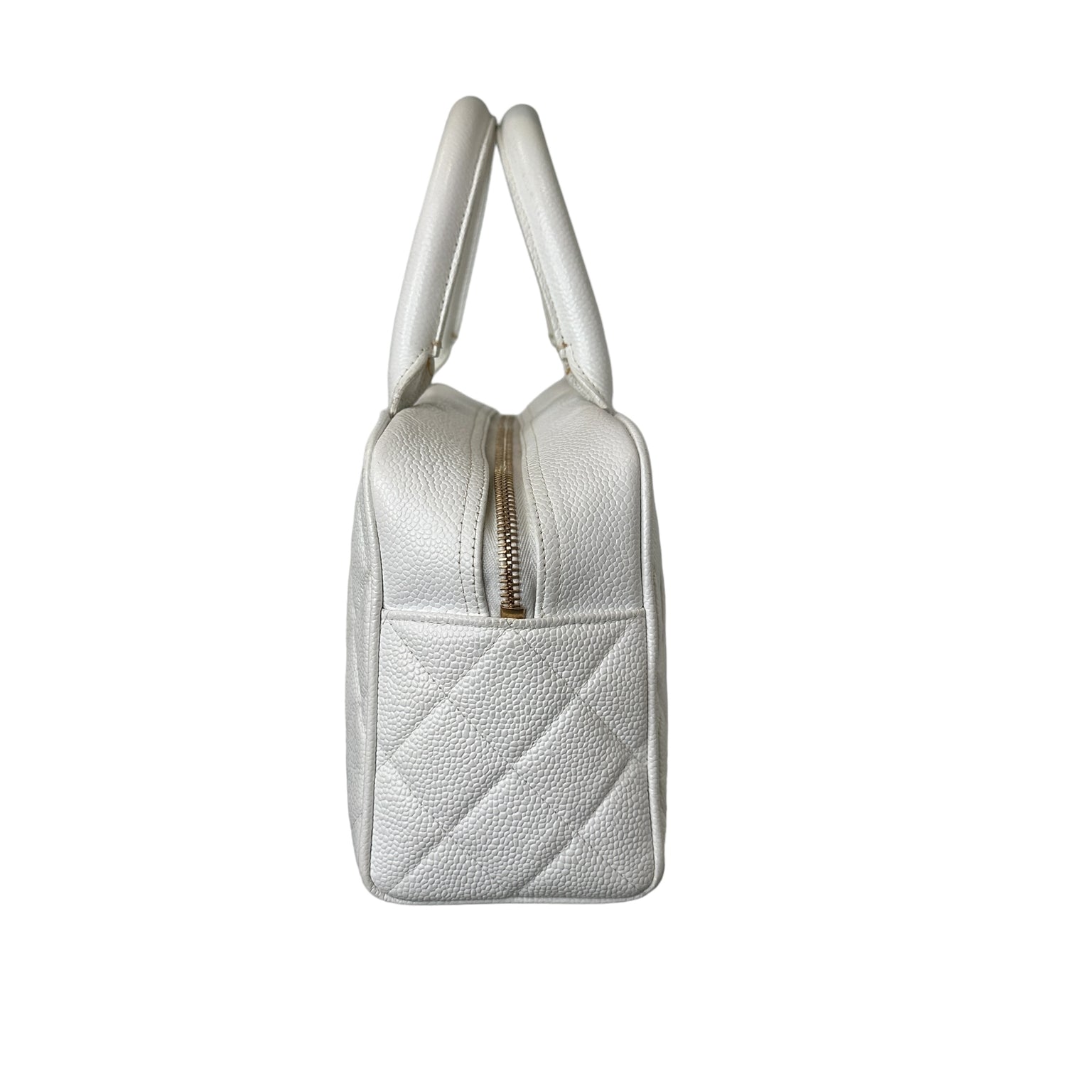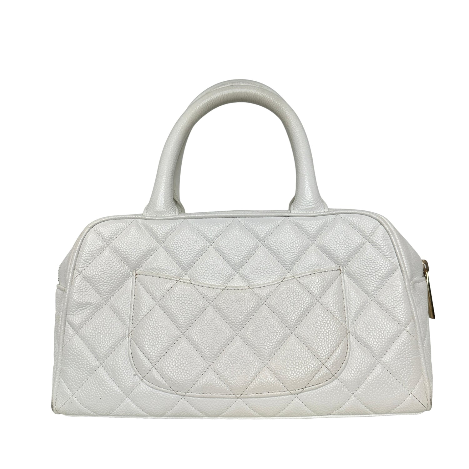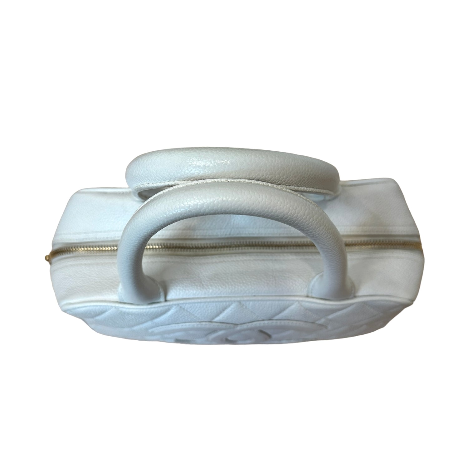 Chanel small bowler bag. White caviar leather. White grosgrain lining. Zipper closure at top. One interior zipper pocket. Protective feet at base.