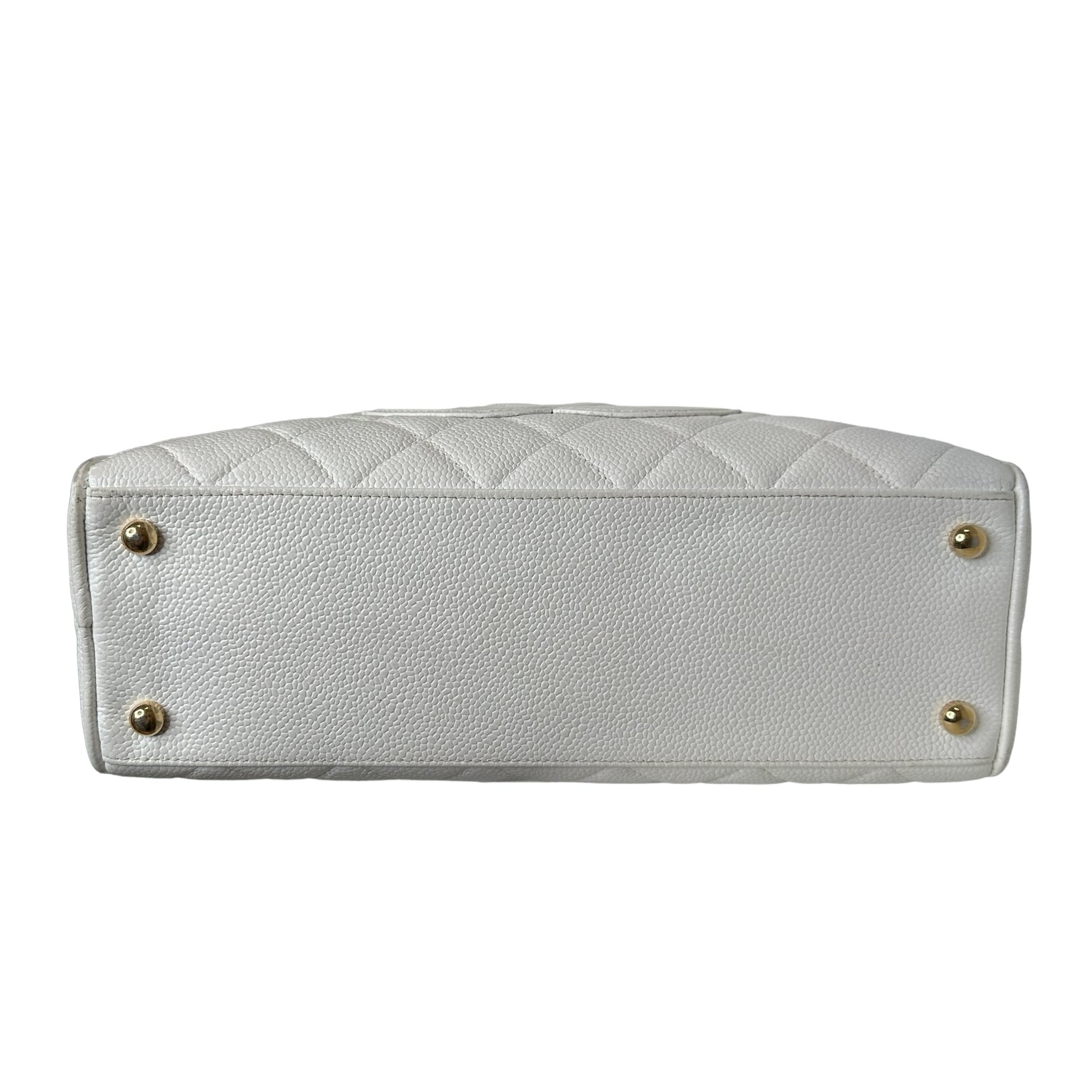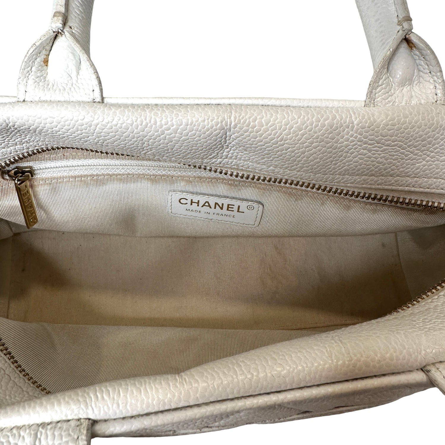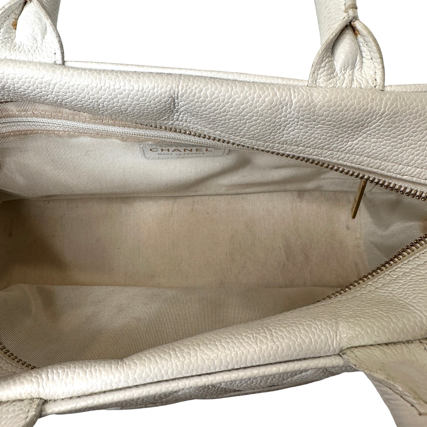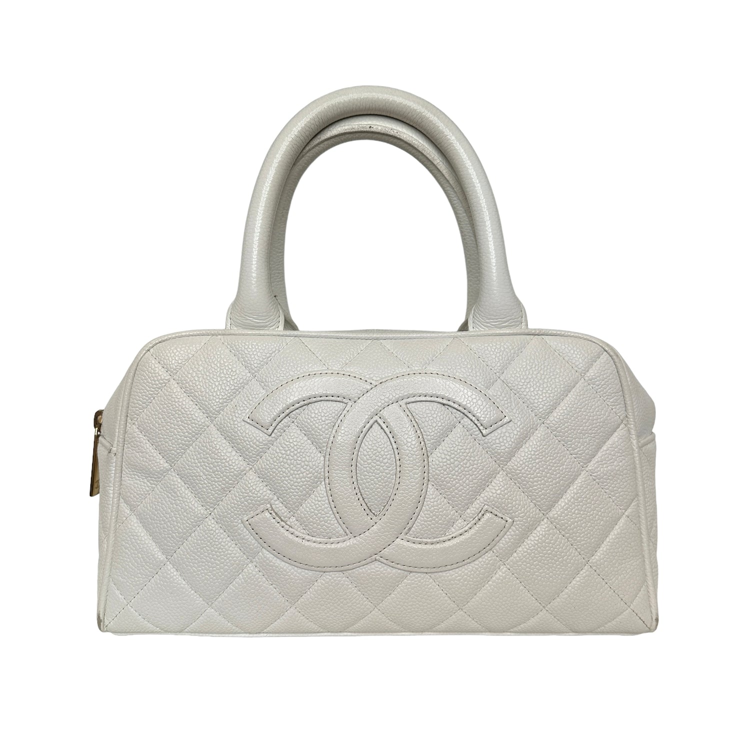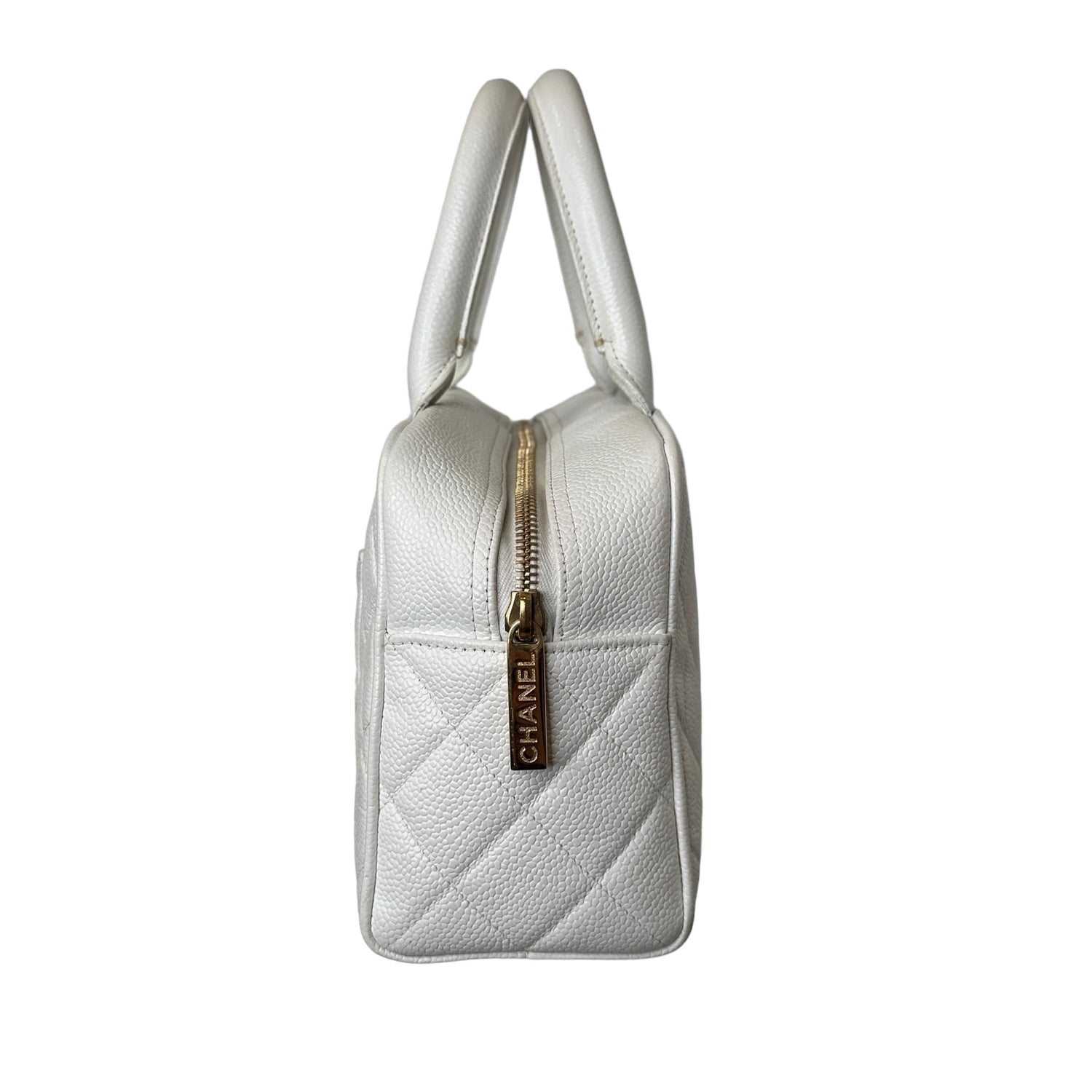 Chanel small bowler bag. White caviar leather. White grosgrain lining. Zipper closure at top. One interior zipper pocket. Protective feet at base.