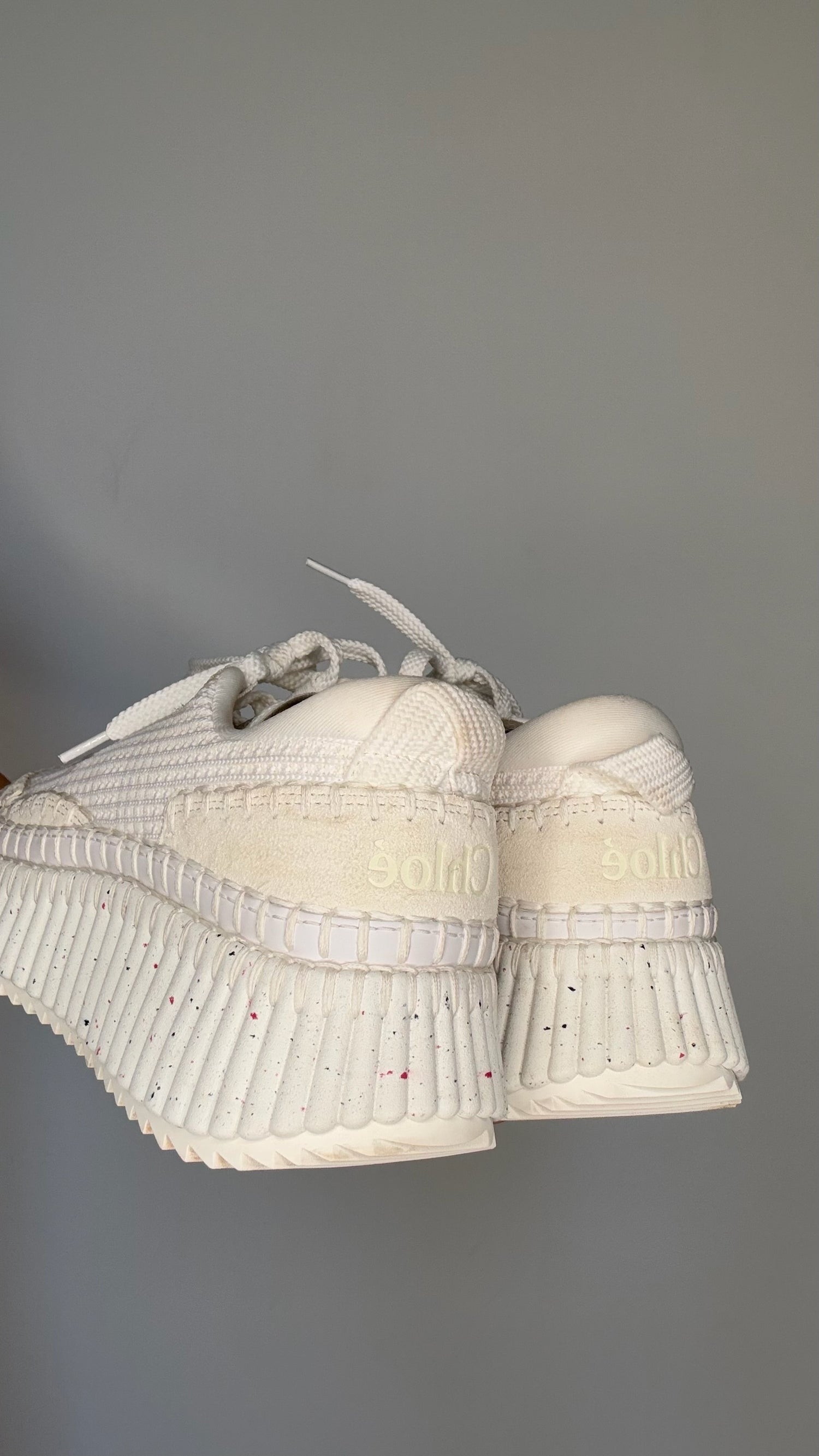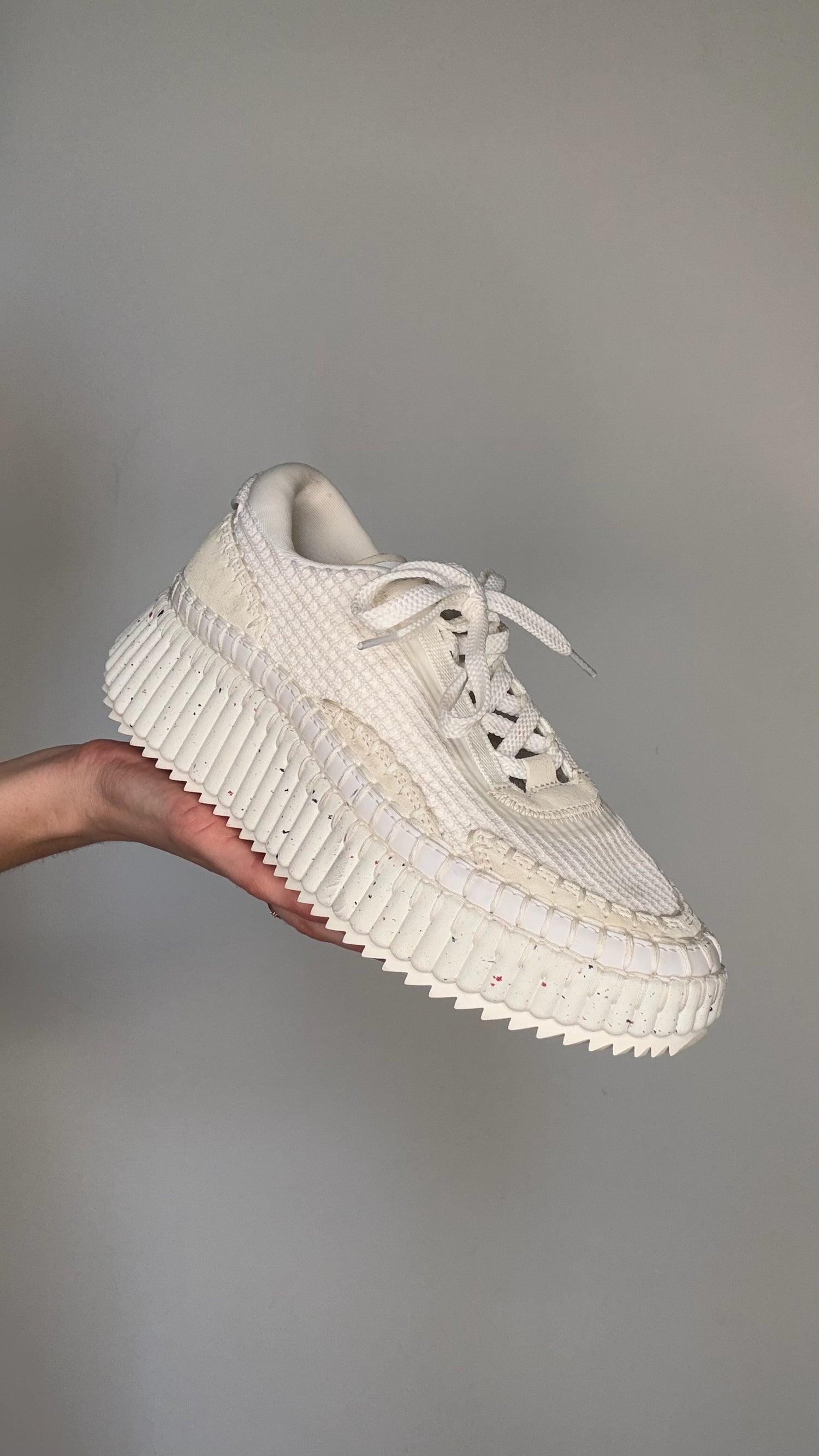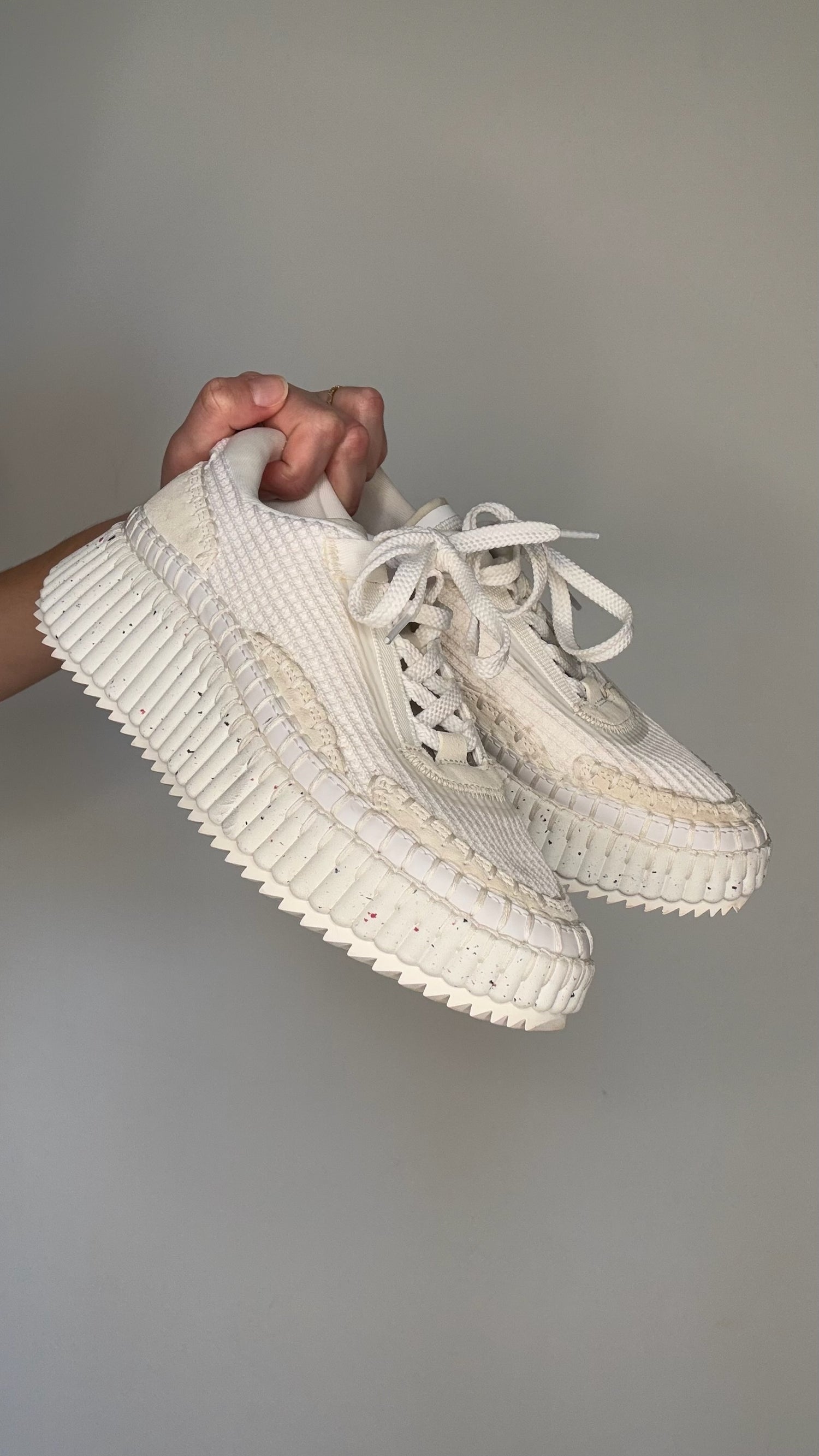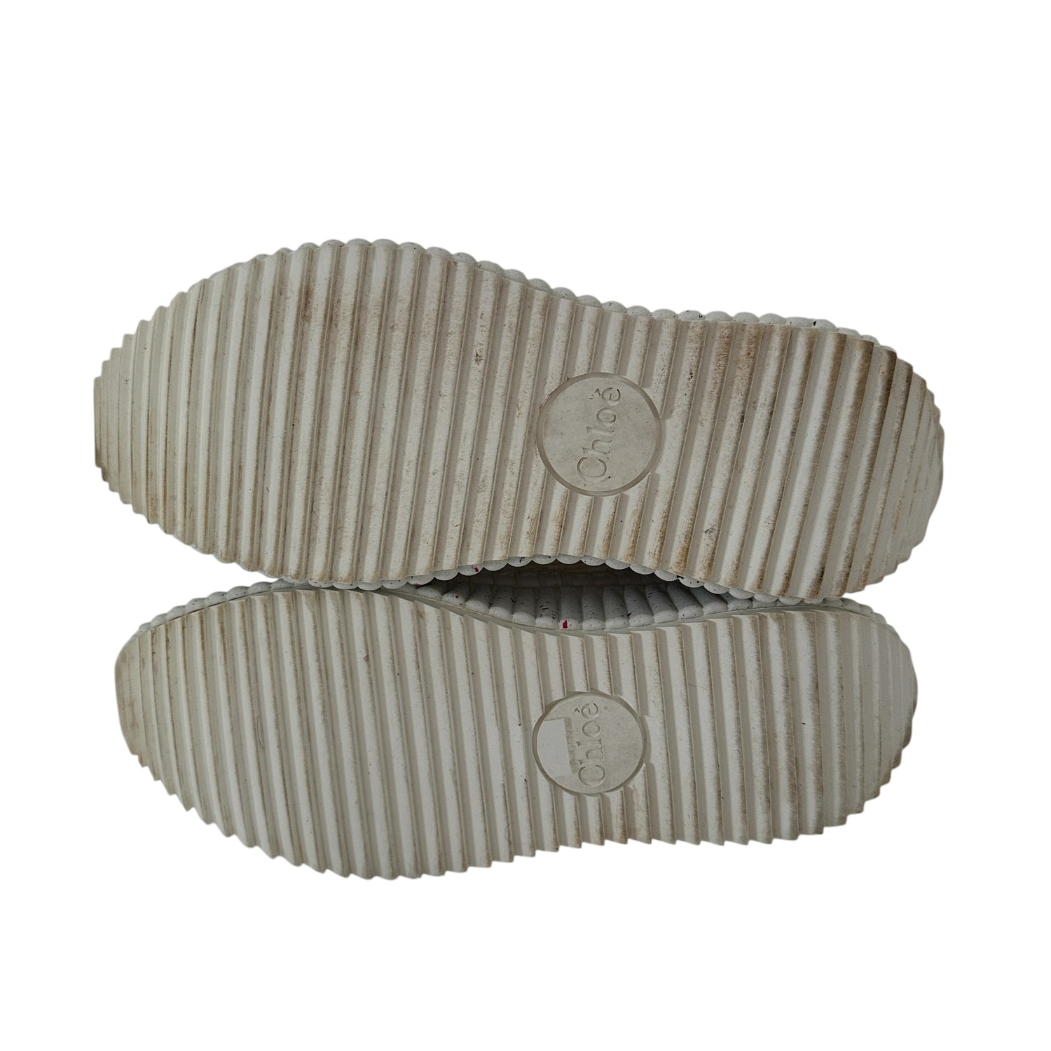 Chloe platform sneakers. White leather and crochet. Chloe logo at back. Designer size 37.