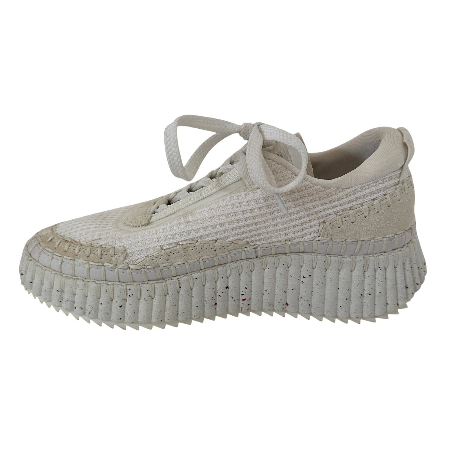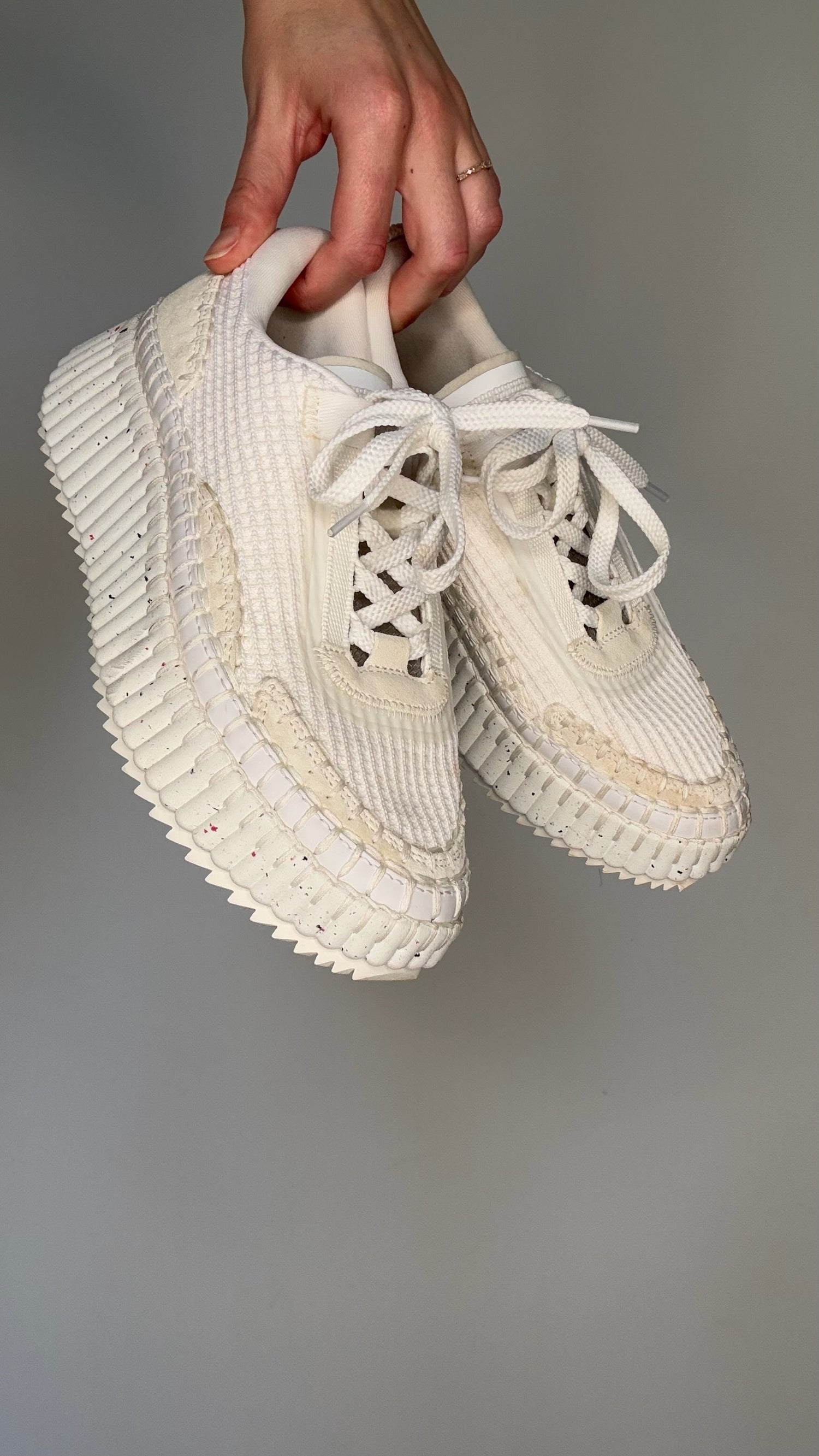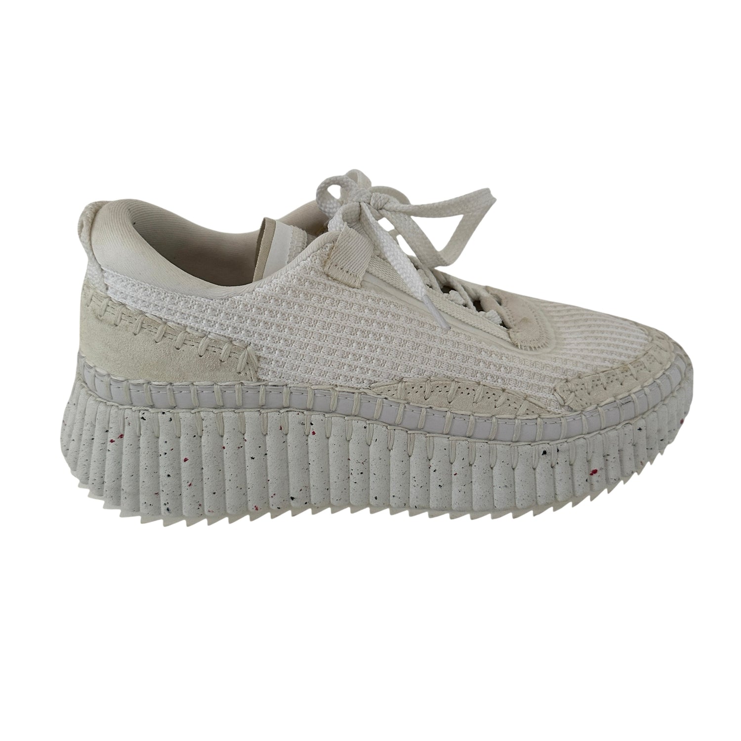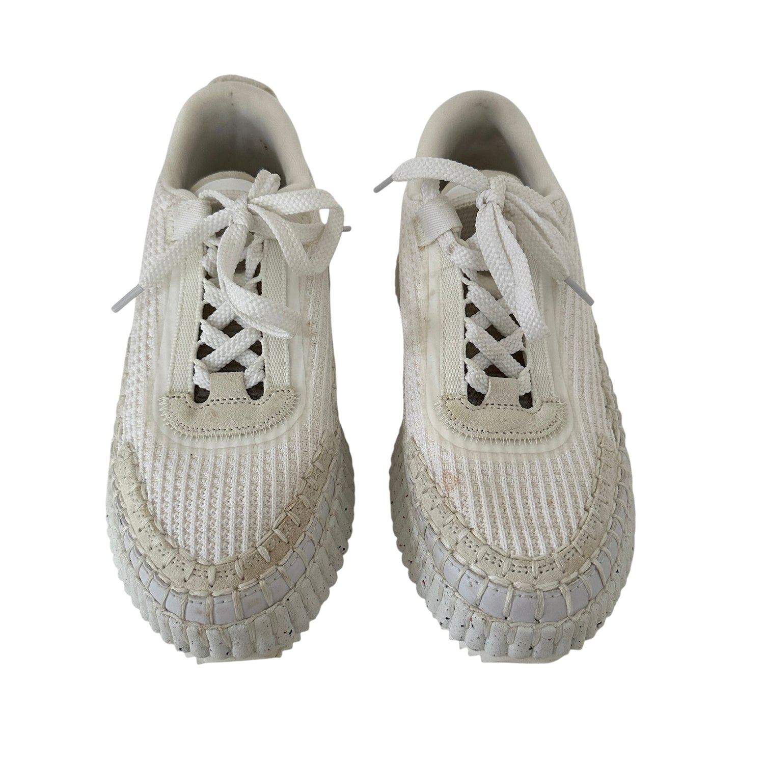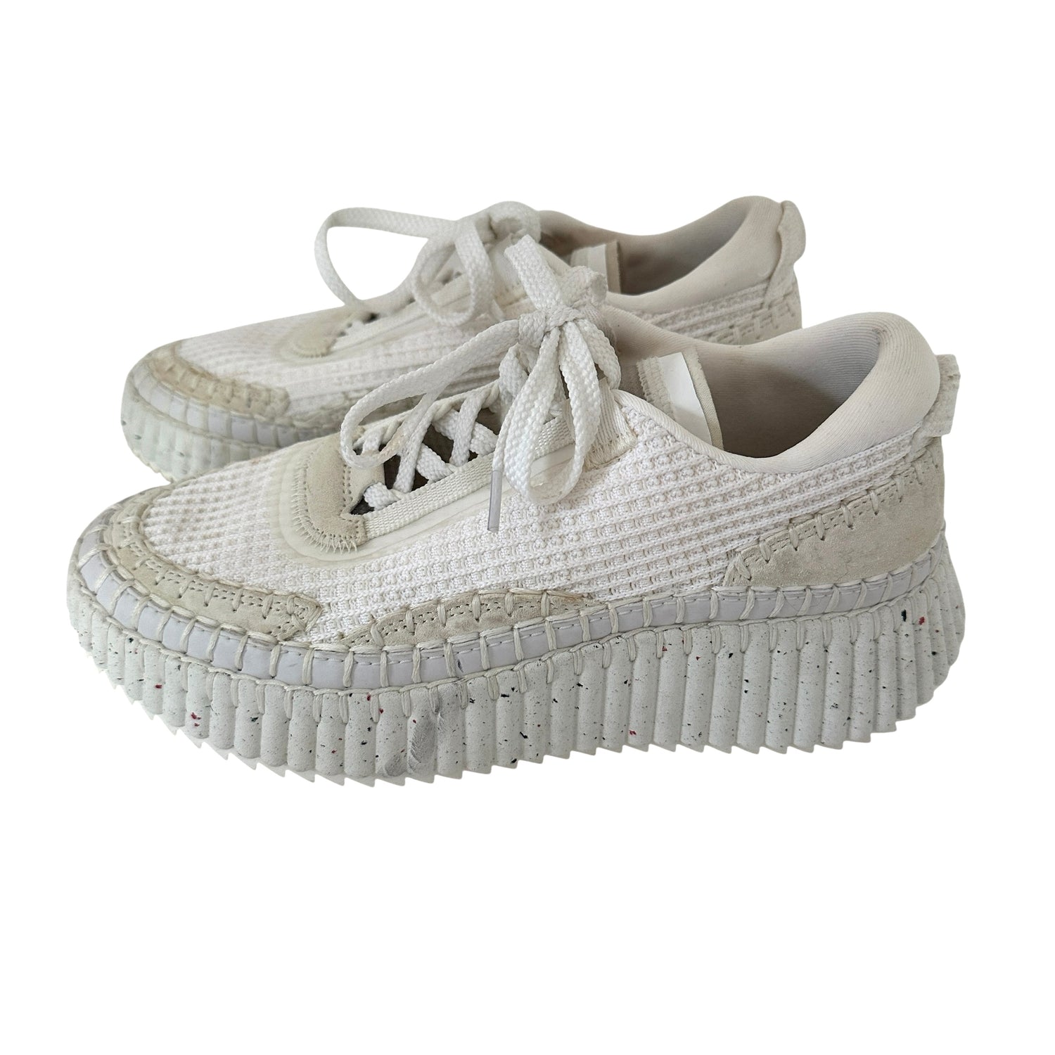Chloe platform sneakers. White leather and crochet. Chloe logo at back. Designer size 37.